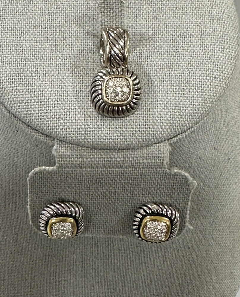 Attention! There is a system glitch within eBay's system - this item is a custome jewelry item - it has no real gold content. Thank you . Rhinestone Center Earrings Pendant Set Post Silver Gold Tone Mixed Metal READ I paired the earrings with the pendant - the gold surrounding the rhinestones on the earrings are darker than the gold trim on the pendant. 💎 **Description:** Based on my research and opinion. I’m not a professional jeweler. 📸 **Condition:** Pre-owned in very good condition. Please view all photos for details. 📏 **Approx. Measurements:** Earrings -.50" square Pendant 1" Drop ✨ **Additional Notes:** - Item sold as shown in photos. - Jewelry is gently cleaned with a microfiber cloth to avoid damage. - Earring backs not included unless in excellent condition (sanitary reasons). 📬 **Shipping:** - I combine shipping! 💡 **Shop with me:** I list jewelry daily! Hit the ❤️ by my name to save my store and explore more listings. Feel free to message me with any questions!
