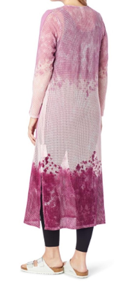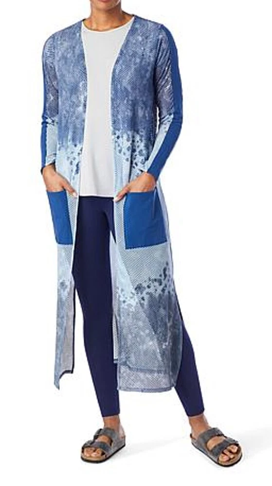 Rhonda Shear Ombre Mesh Knit Duster Retreat Resort Wear Bathing Suit Cover-Up RESORT Wear (Deep Blue)Large Who doesn't love a little ombre? This lightweight, dip-dyed mesh knit duster from Rhonda Shear's Retreat collection is perfect for beachy days and nights. Fabrication: Lightweight net mesh stretch knit Design Details: Ombre dip-dyed Style: Duster-length cardigan Sleeves: Long Closure: Open front; no closure Hemline: Straight Length: Tea Pockets: 2 front patch pockets Additional Details: Stripe sleeve detail; side slits Body Length: Approx. 47.25"L to 45.5"L Fit: Loose-fitting: generously sized for ease of movement and fabric drape Content: 89% polyester, 11% spandex Care: Machine wash, tumble dry Country of Origin: Imported