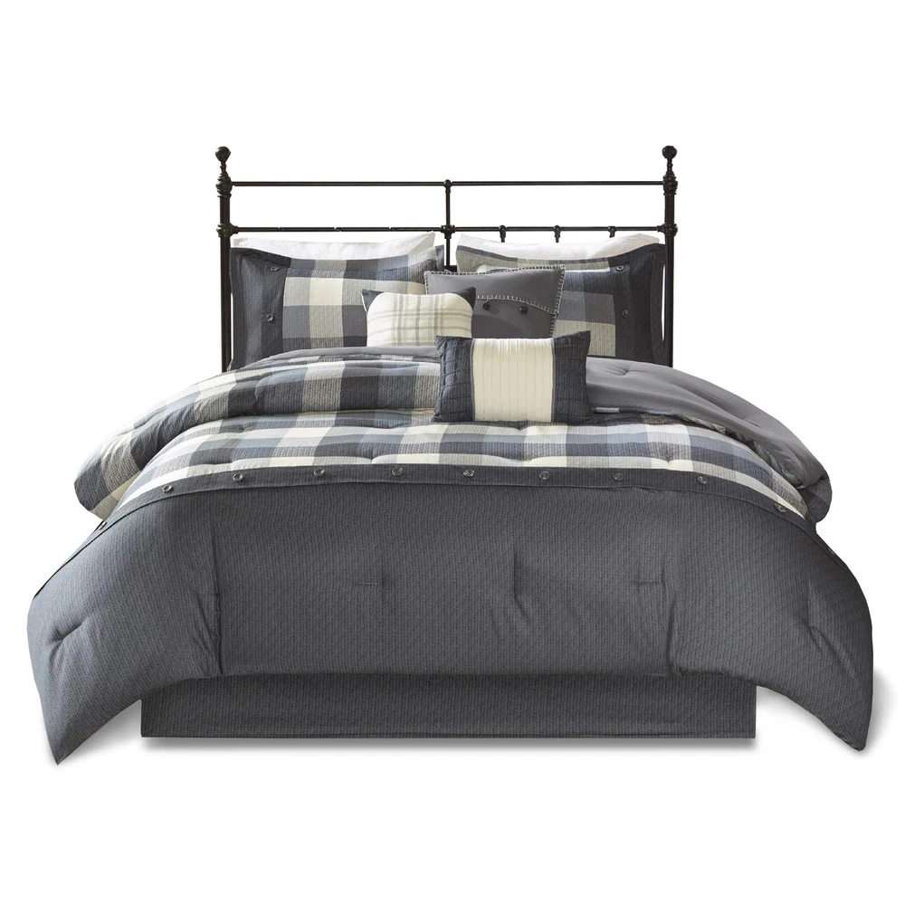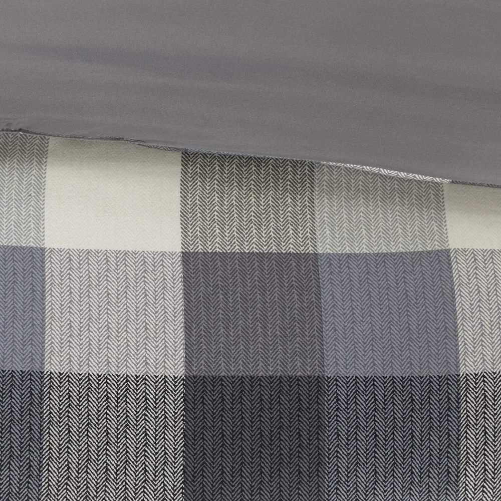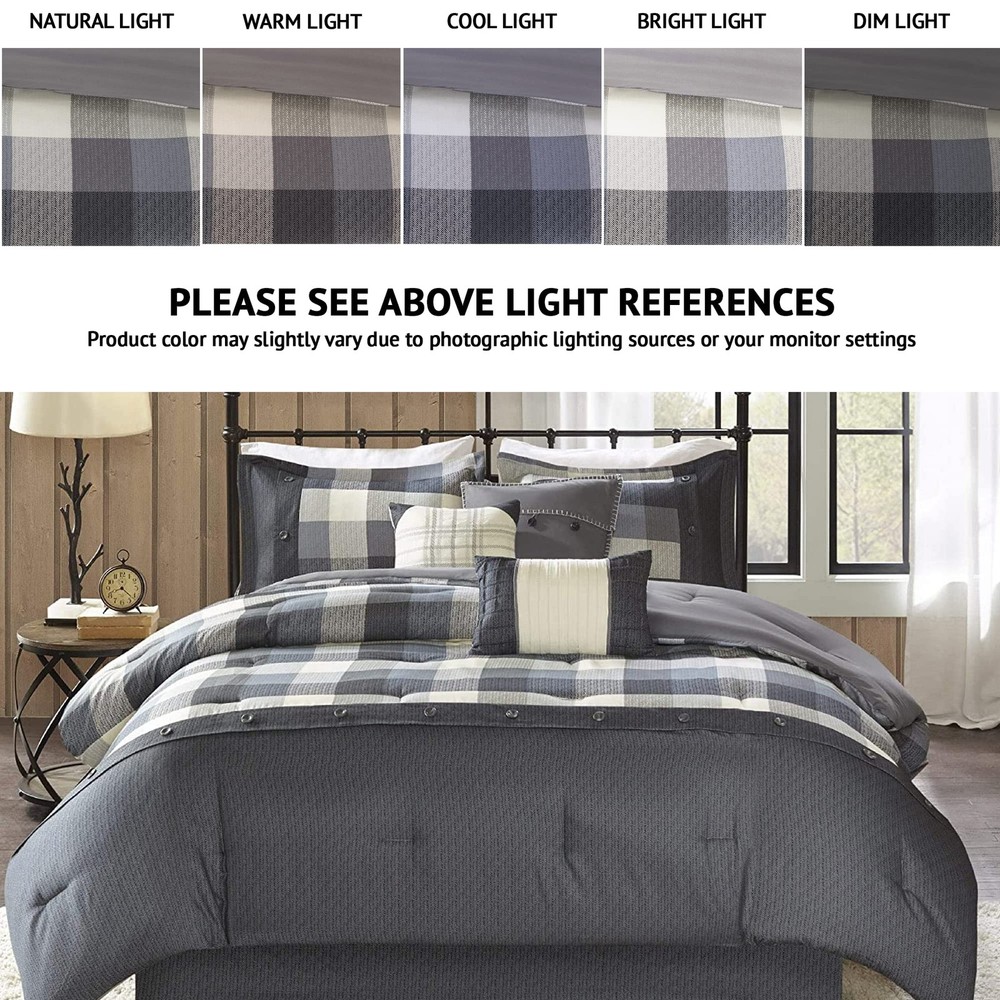 Buffalo plaid pattern Printed herringbone fabric Hand stitched embroidery hem on decorative pillow polyester herringbone, printed, microfiber reverse, 8oz/yd2 polyester filling 1 Comforter:104"W x 92"L 2 King Shams:20"W x 36"L + 2"D (2) 1 Bedskirt:78"W x 80"L + 15"D 3 Decorative Pillows:18"W x 18"L/16"W x 16"L/12"W x 18"L Machine Washable Spot Clean Pillows