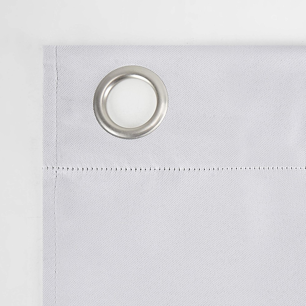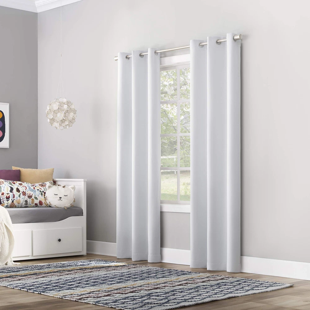 Riley Bedroom Blackout Grommet Curtain Panels add a bright, fun pop of color to a bedroom, playroom, or any room of your home. Equipped with built-in metal grommets for easy hanging on standard curtain rods up to 1.5" in diameter. Blackout technology blocks out most outside light, offers outside noise reduction by up to 30%, and decreases energy lost through your windows by up to 40%. Comfort is optimized with thermal properties that help keep summer heat and winter chill out of the room. Sold as individual panels measuring 40" width by 84" length in color white. Measure carefully before selecting your desired size and quantity. Rod not included. Machine wash cold on gentle cycle. Use non-chlorine bleach when needed. Tumble dry on low heat, using a cool iron as needed. Block out unwanted light with a bright, fun pop of color in a bedroom, playroom, or any room of your home Energy efficient design reduces energy lost through your windows by up to 40% Thermal properties help keep summer heat and winter chill out of the room Noise reduction up to 30% for a sounder, more uninterrupted sleep Silver metal grommets allow for easy hanging on a curtain rod up to 1.5" Each panel sold separately. (Image features 2 panels)