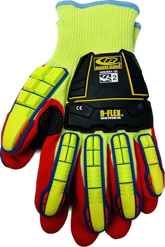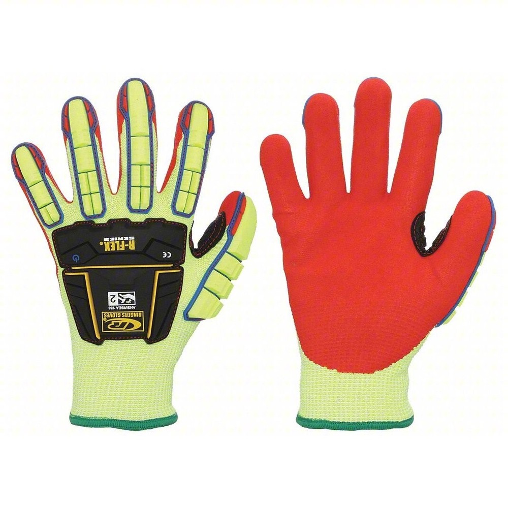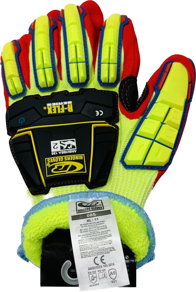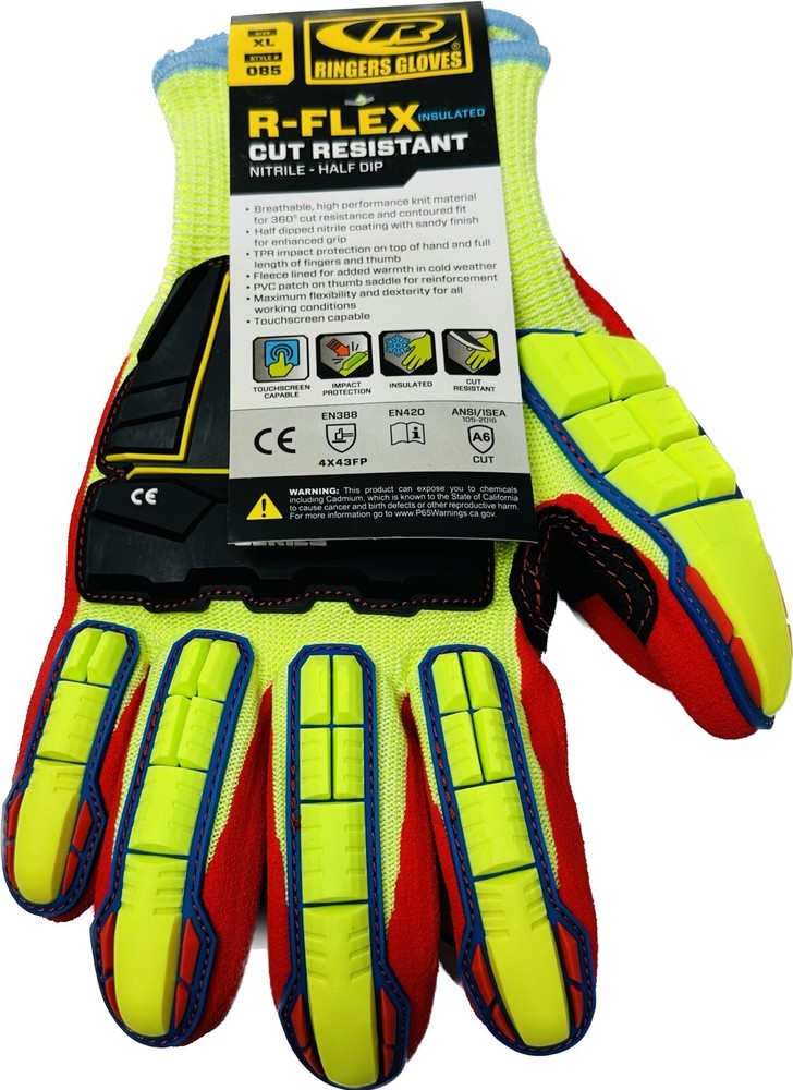 Dipped Green Nitrile Impact Resistant Gloves (085-11) by Ringers Gloves®. With Fleece Lining. The Ringers 085 R-Flex Impact glove with Nitrile Half Dip and Fleece Lining combines protection against impact hazards and the highest levels of cut resistance, with added warmth for application in cold environments. A breathable knit shell developed with Ringers' F3 Technology™ and patented TPR design for superior dexterity and comfort. The sandy finish palm ensures secure grip on wet and dry surfaces, and touchscreen compatible index, middle and thumb tips allow technology interaction. Shipping Information •Orders are shipped using UPS Ground or USPS. Tracking information will be provided. •Most orders ship within 1 business days. •Shipping cost provided for this listing applies only to the 48 continental United States. •We take orders 24 hours 7 days a week Returns/Warranty •We will gladly accept your return within 30 days of the original purchase. •Returned or exchanged products must be in brand-new, mint condition. •Buyer pays for return shipping assuming a mistake was not made by the seller.