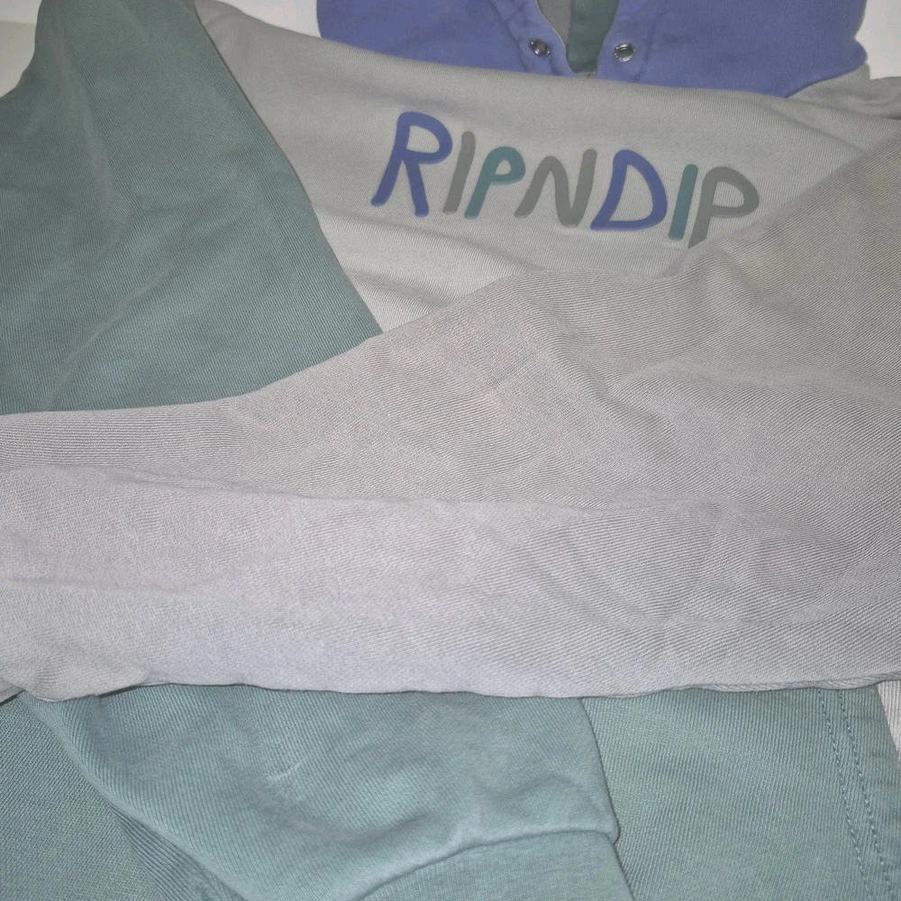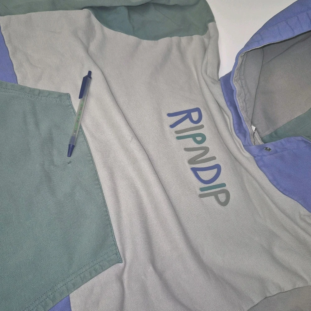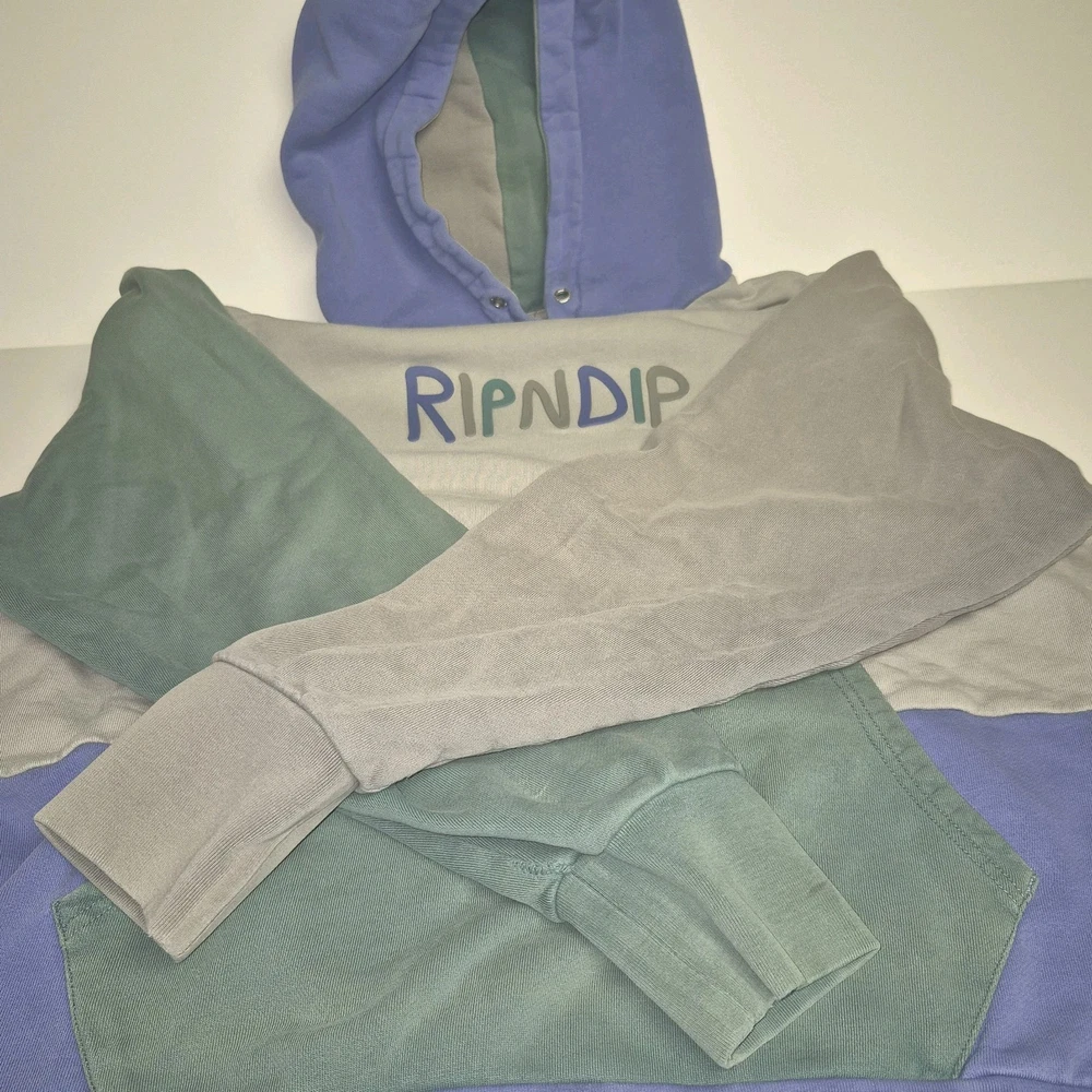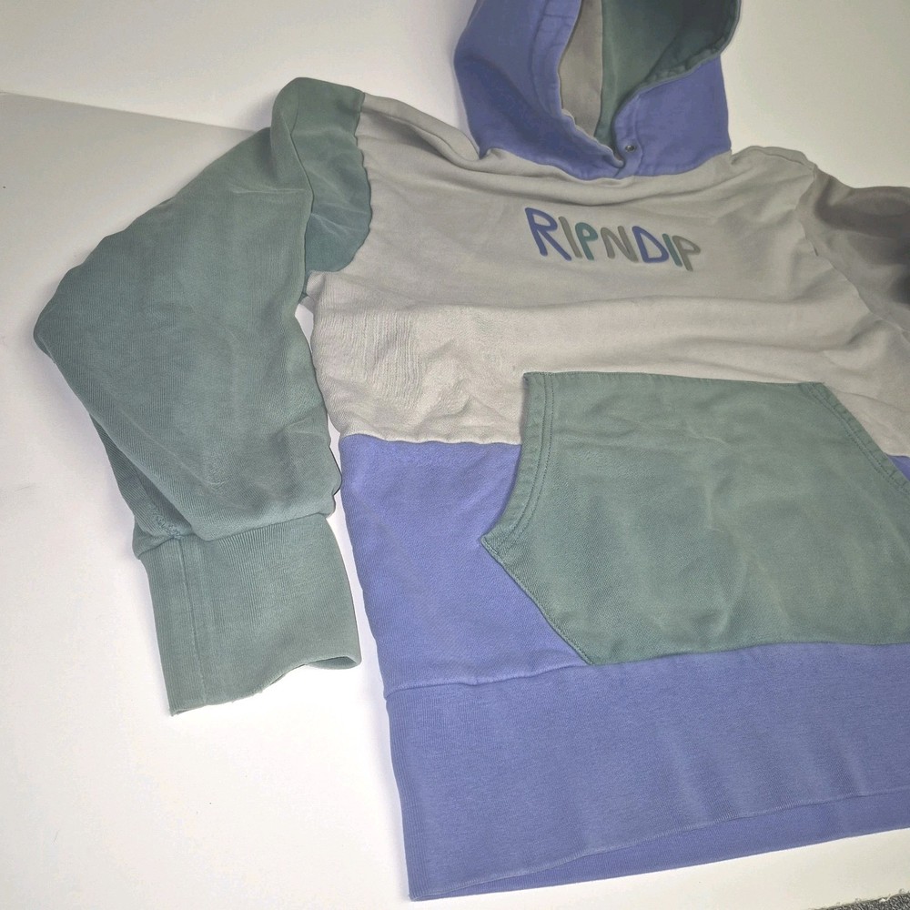 Pre-owned Good Condition. Rare. Wrap yourself in the distinctive style of the RIPNDIP Hoodie, a perfect blend of comfort and streetwear flair. This men's size M hoodie offers a relaxed fit, akin to a large, making it a versatile addition to any casual wardrobe. It features a vibrant color block design that effortlessly stands out, complemented by the hoodie's hefty weight for a cozy feel. Practical elements include a hood for extra protection against the elements and convenient pouch pocket for your essentials. The long sleeves make it an ideal choice for cooler days, while the pullover style ensures ease of wear. Whether you're out with friends or enjoying a laid-back day, this hoodie brings a touch of RIPNDIP's unique aesthetic to your ensemble.