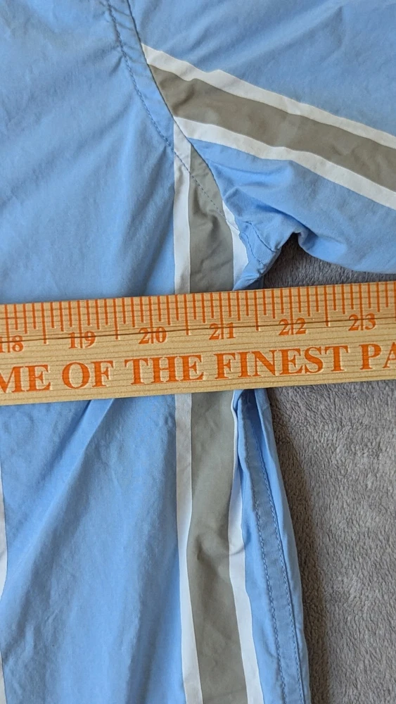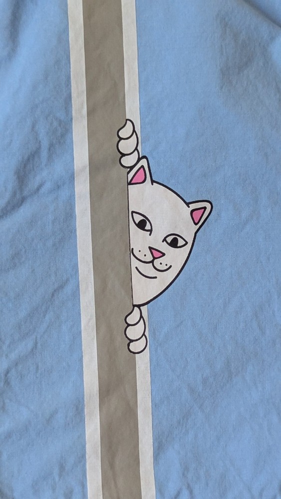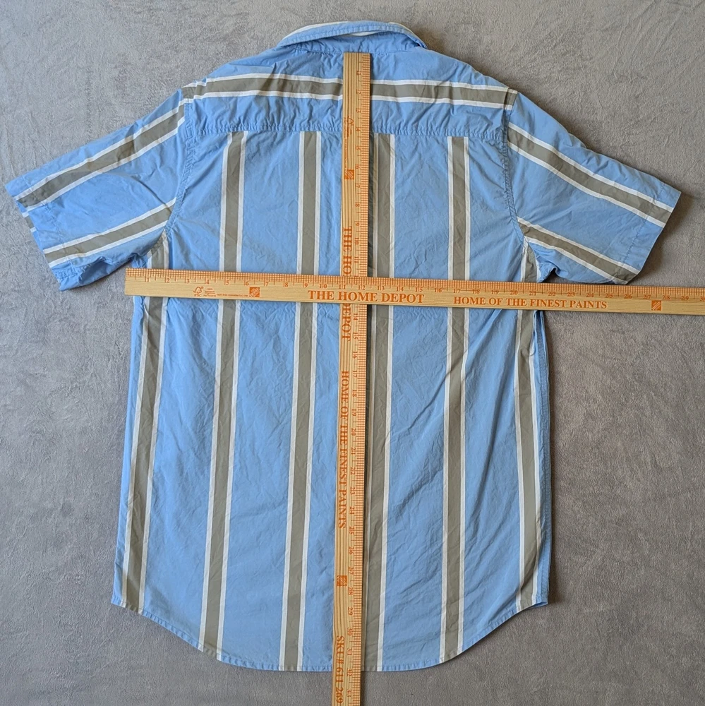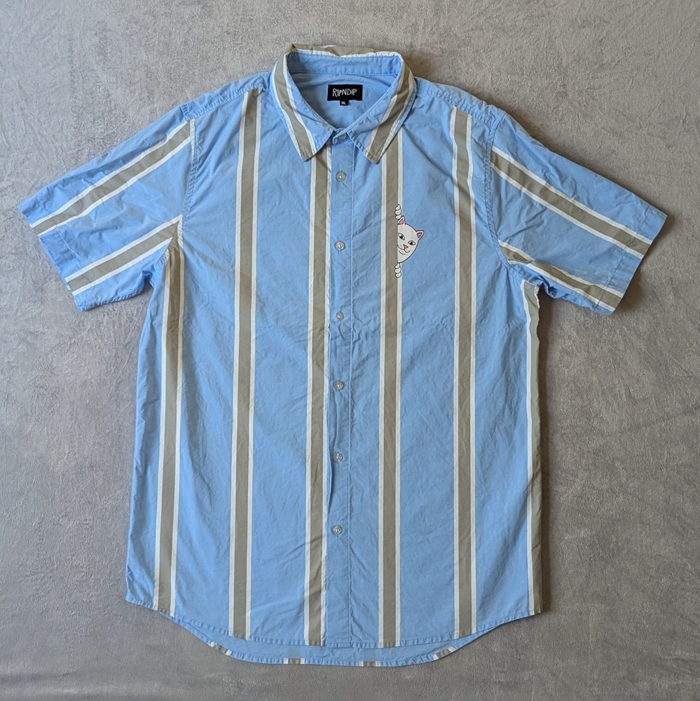 Up for Sale I have a Rip N dip Peek a Nermal Button Up Shirt Short Sleeve Blue/Gray Striped Mens Size Extra Large (please see measurements in photos) Good pre-owned condition. Has some very light fabric fade.