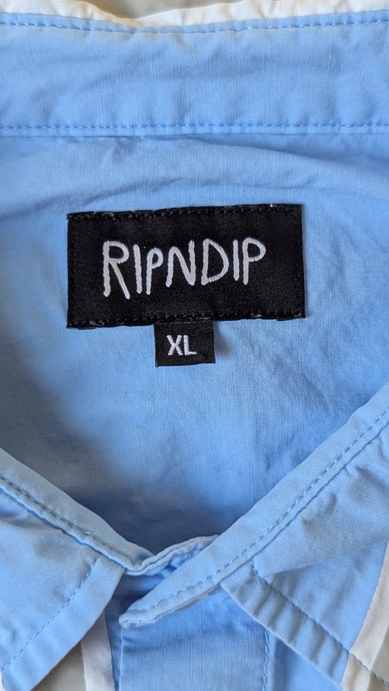 Up for Sale I have a Rip N dip Peek a Nermal Button Up Shirt Short Sleeve Blue/Gray Striped Mens Size Extra Large (please see measurements in photos) Good pre-owned condition. Has some very light fabr...
