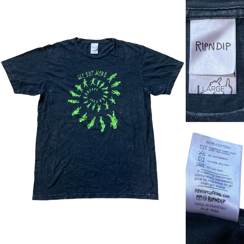 Rip N Dip Spiral Cat T-Shirt Men’s size Large in Dark Grey Measurements: Chest: 42 inches Waist: 40 inches Hip: 42 inches Length: 29 inches Arm Length: 3 inches This Rip N Dip Spiral Cat T-Shirt is a must-have for any cat lover out there. The shirt is made of 100% cotton and comes in a beautiful dark grey color. The shirt features a solid pattern, short sleeves, and a crew neck, making it a perfect fit for any occasion. The shirt also has a double-sided design and pockets, adding to its overall style and functionality. The logo accents on the shirt add an extra touch of class to this already amazing piece of clothing. This T-Shirt is available in men's size Large and is perfect for anyone who wants to add a touch of cat-themed style to their wardrobe.