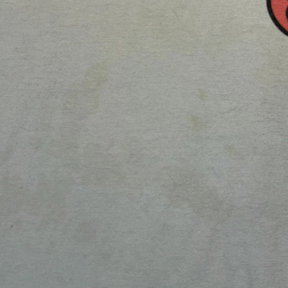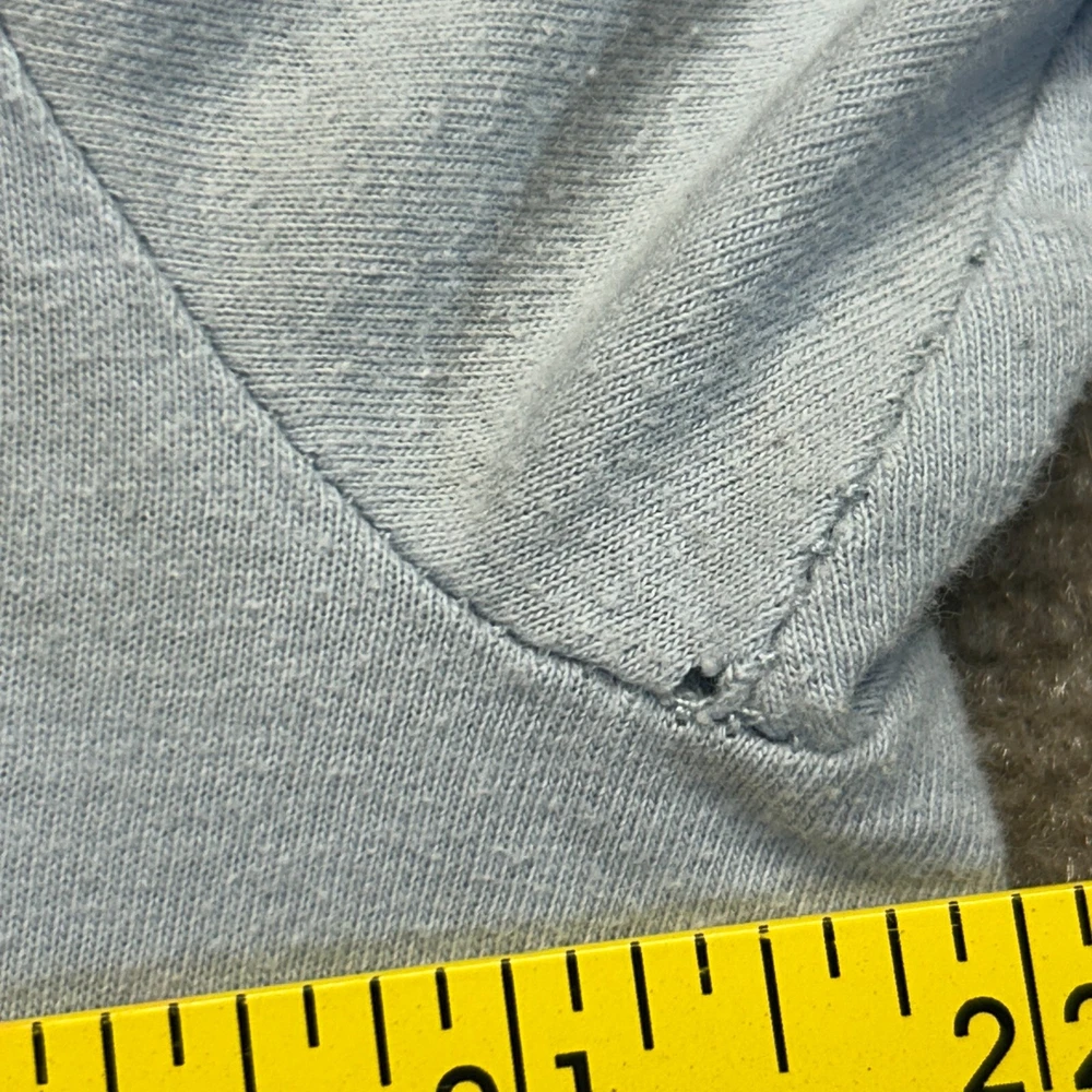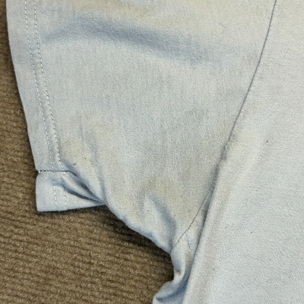Funny and functional, but not the prettiest with some staining as pictured. Great for shop or yard work when you want to express your displeasure for co-workers. Fair condition, wear isn't too bad, just some light pilling but no tears or holes. Graphics are in good shape but the solid blue parts have some discolor particularly on front and it has armpit stains. Please review measurement photos to ensure proper fit.