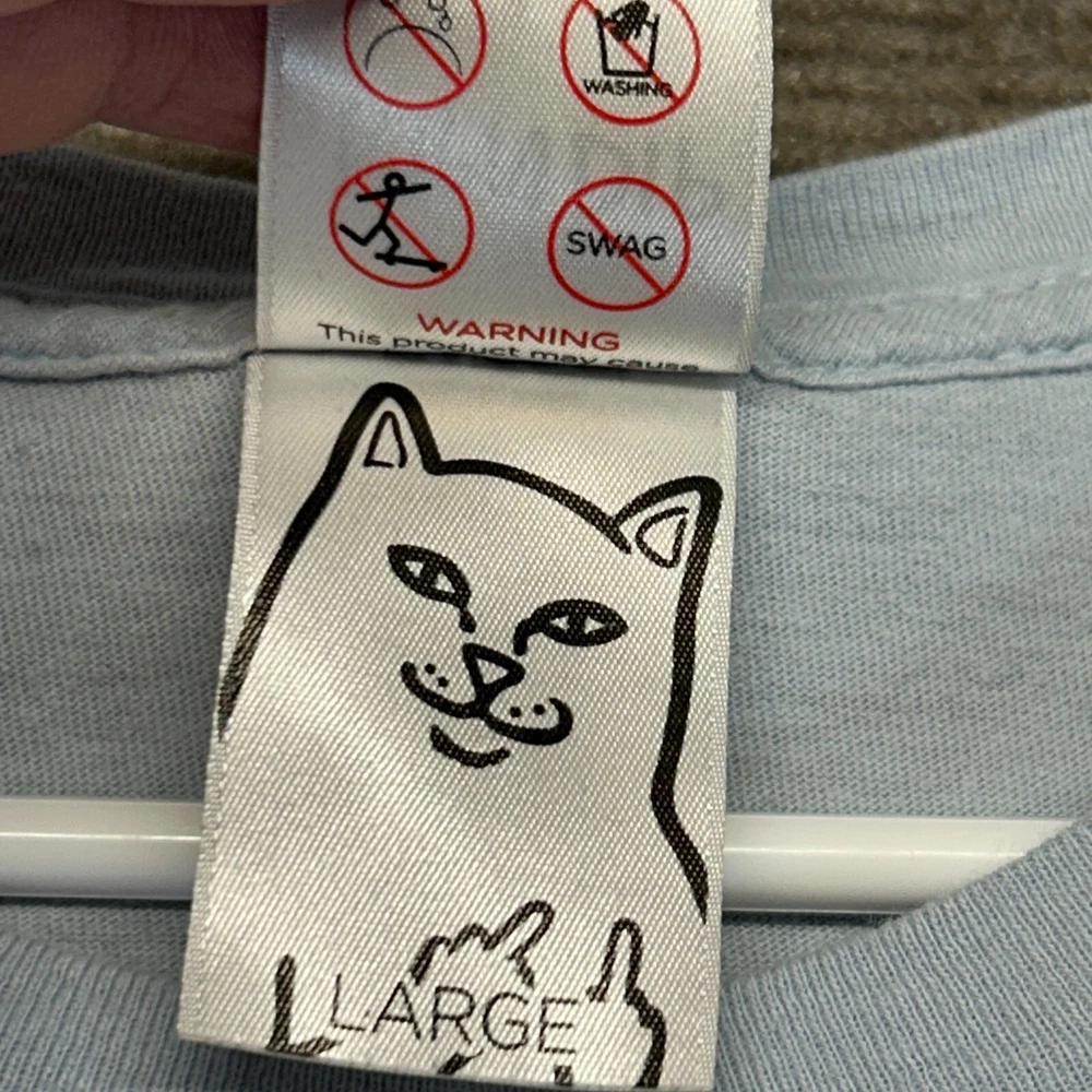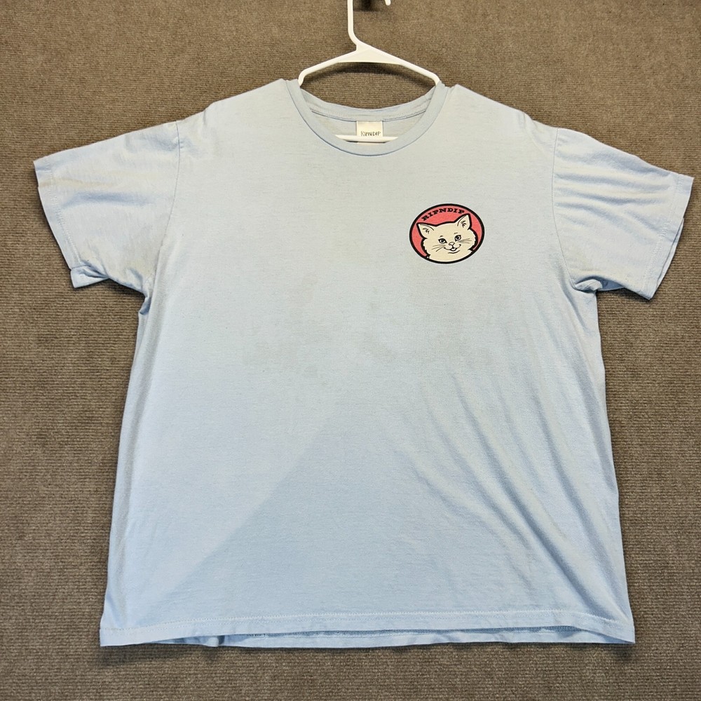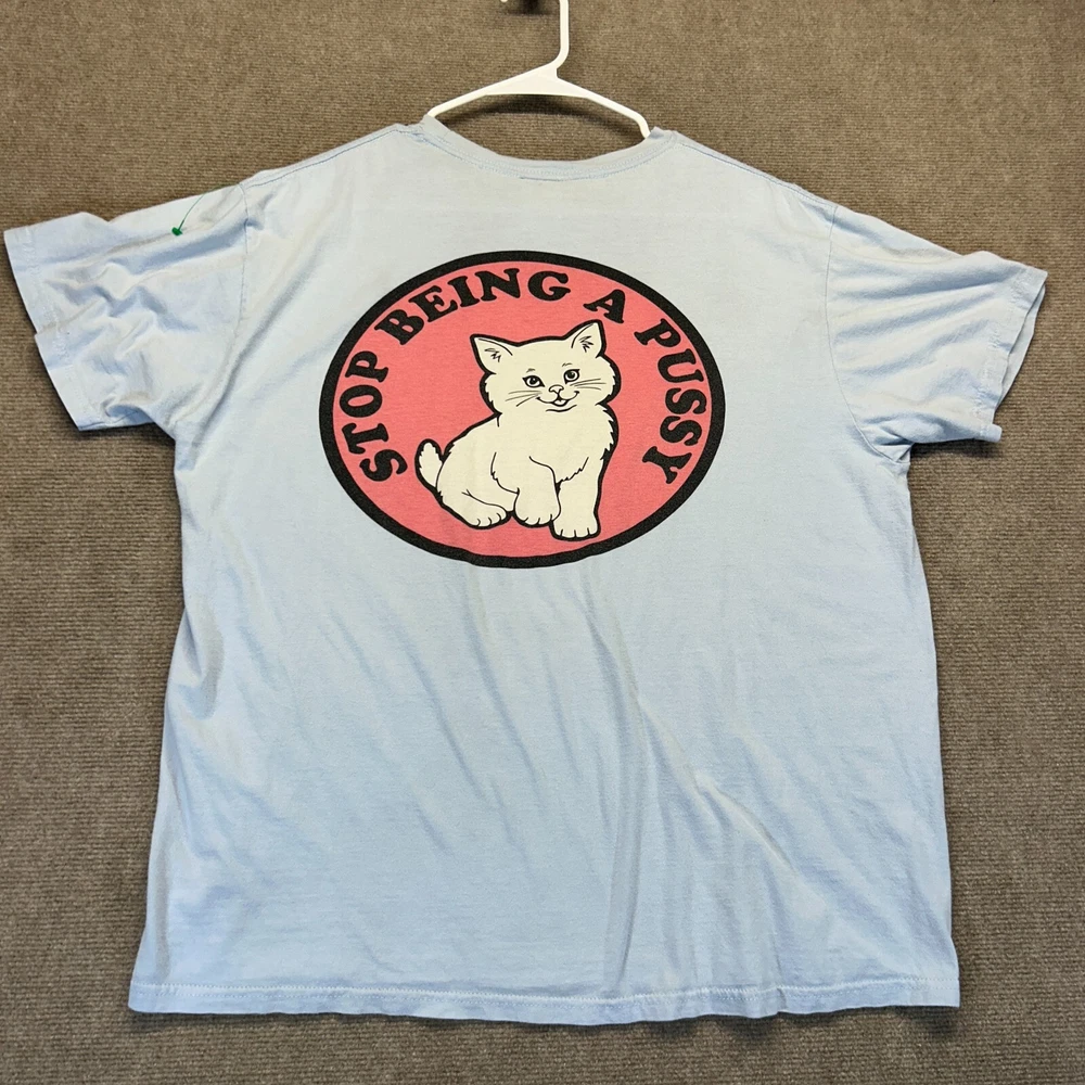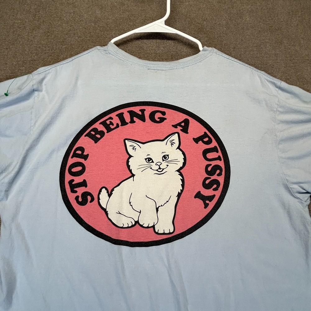 Funny and functional, but not the prettiest with some staining as pictured. Great for shop or yard work when you want to express your displeasure for co-workers. Fair condition, wear isn't too bad, just some light pilling but no tears or holes. Graphics are in good shape but the solid blue parts have some discolor particularly on front and it has armpit stains. Please review measurement photos to ensure proper fit.