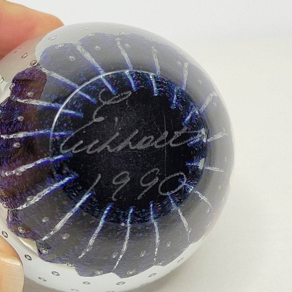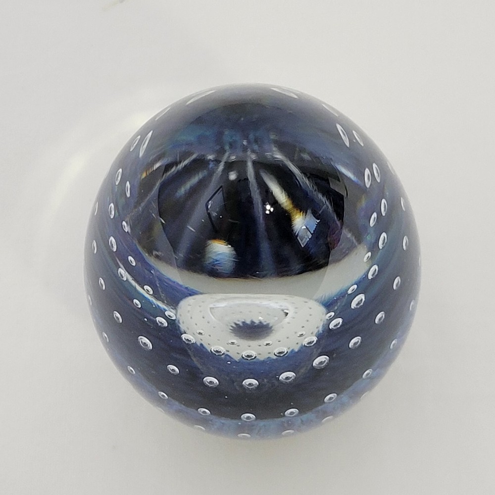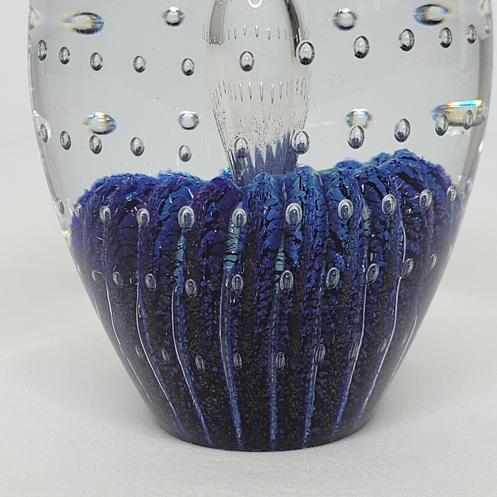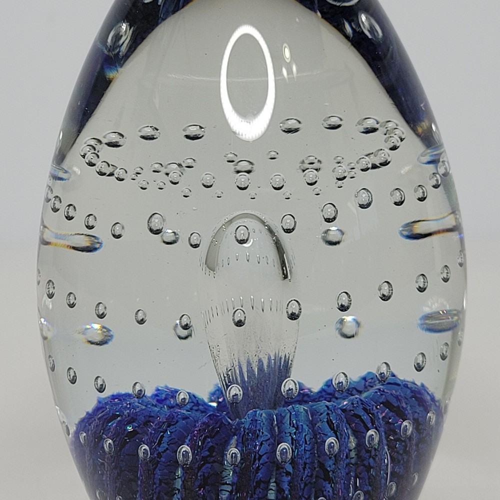 Robert Eickholt 5" Egg Shaped Glass Paperweight Controlled Bubbles Glitter. Item is in good condition. Measurements are 5" H x 2 3/4" at center. Please see photos for more details. Any order over $500 requires signature verification at delivery. Thank you!
