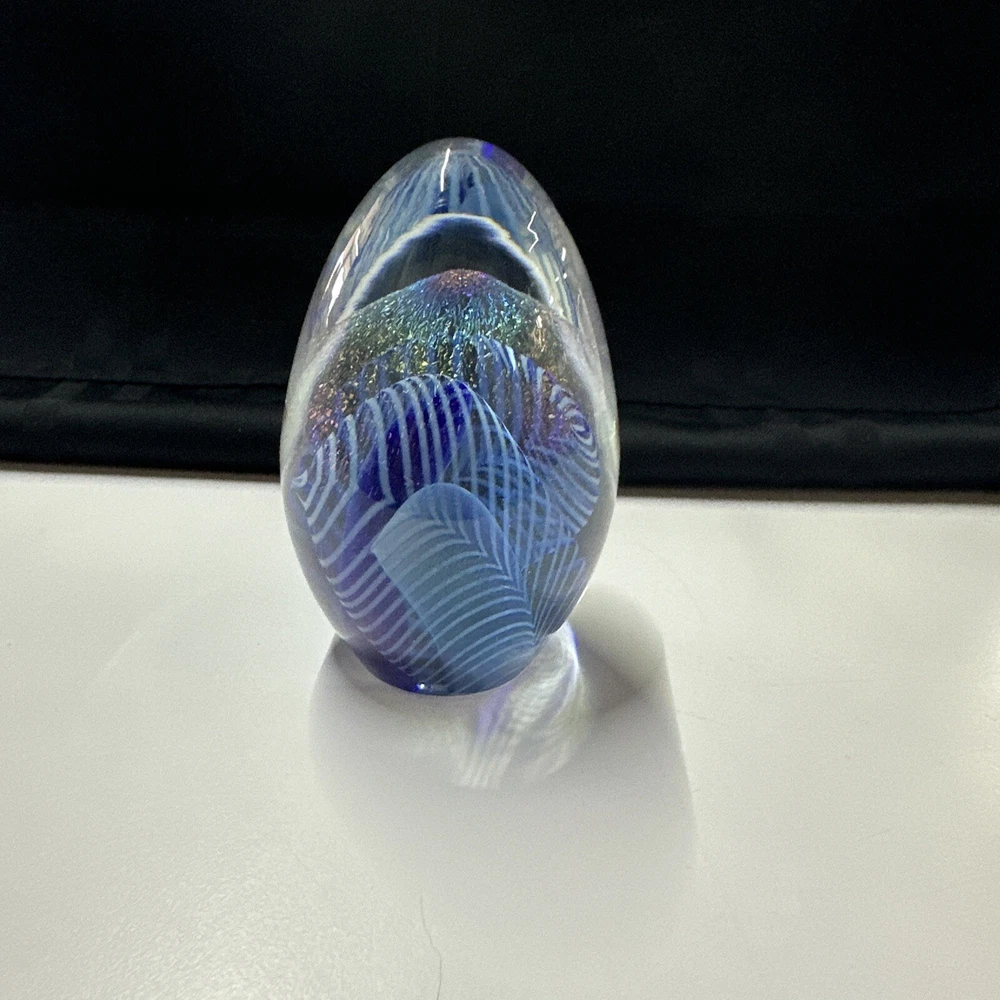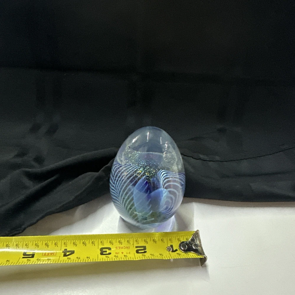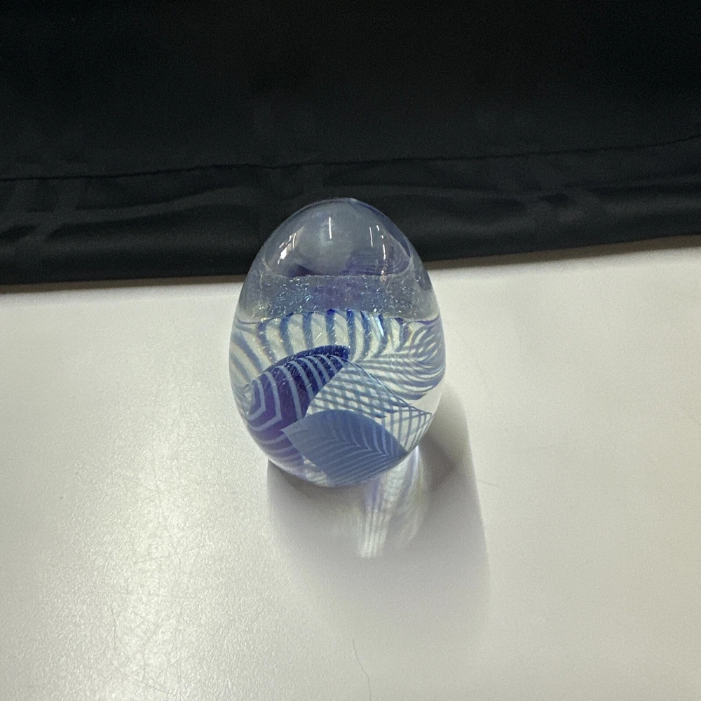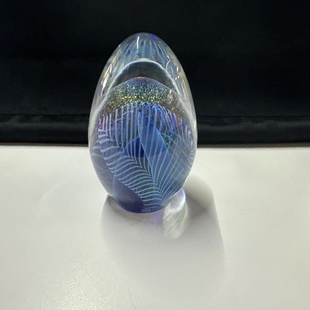 Robert Eickholt Egg Shaped Blue Iridescent Feather Pattern Glass Paperweight . Condition is Used. Shipped with USPS Ground Advantage....