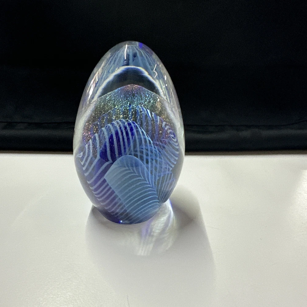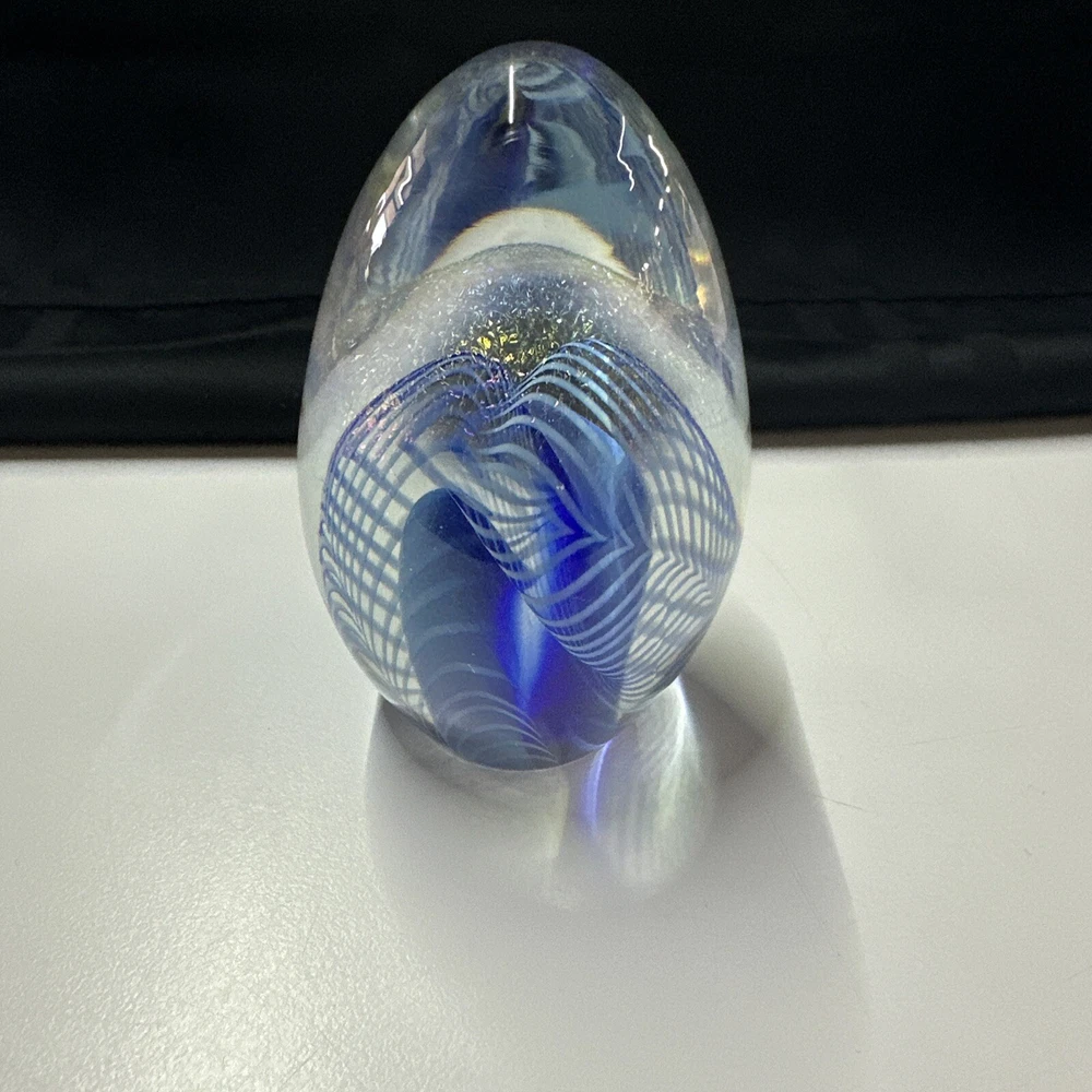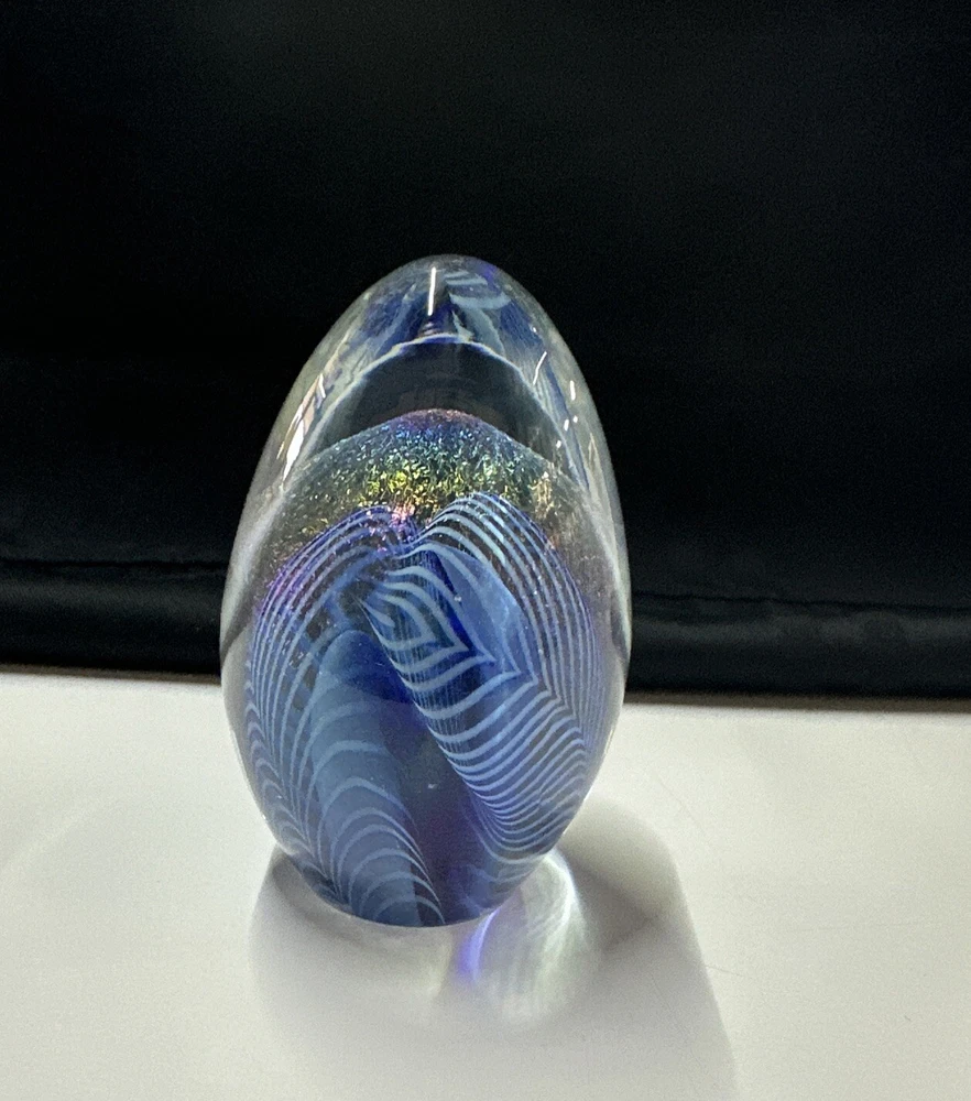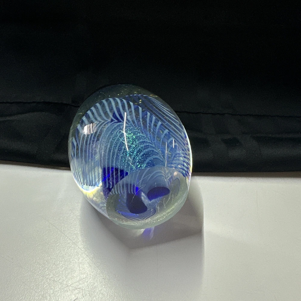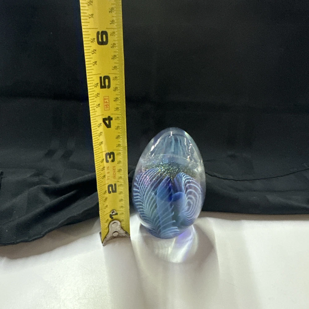 Robert Eickholt Egg Shaped Blue Iridescent Feather Pattern Glass Paperweight . Condition is Used. Shipped with USPS Ground Advantage....