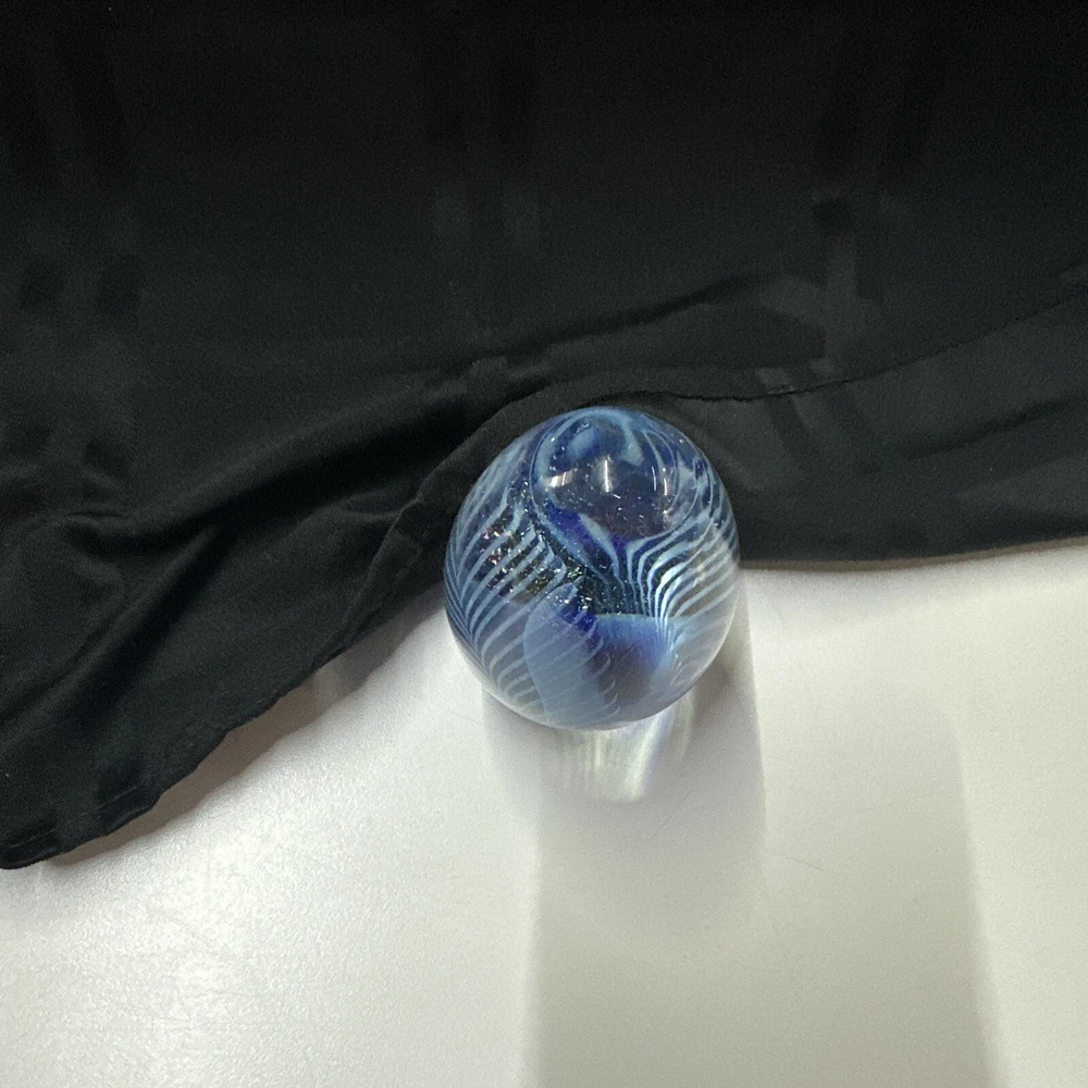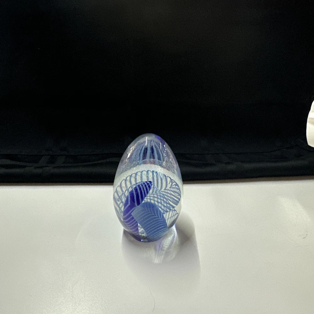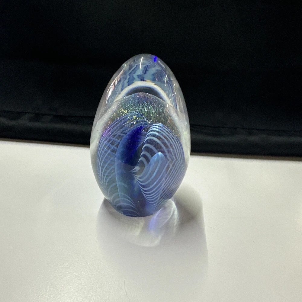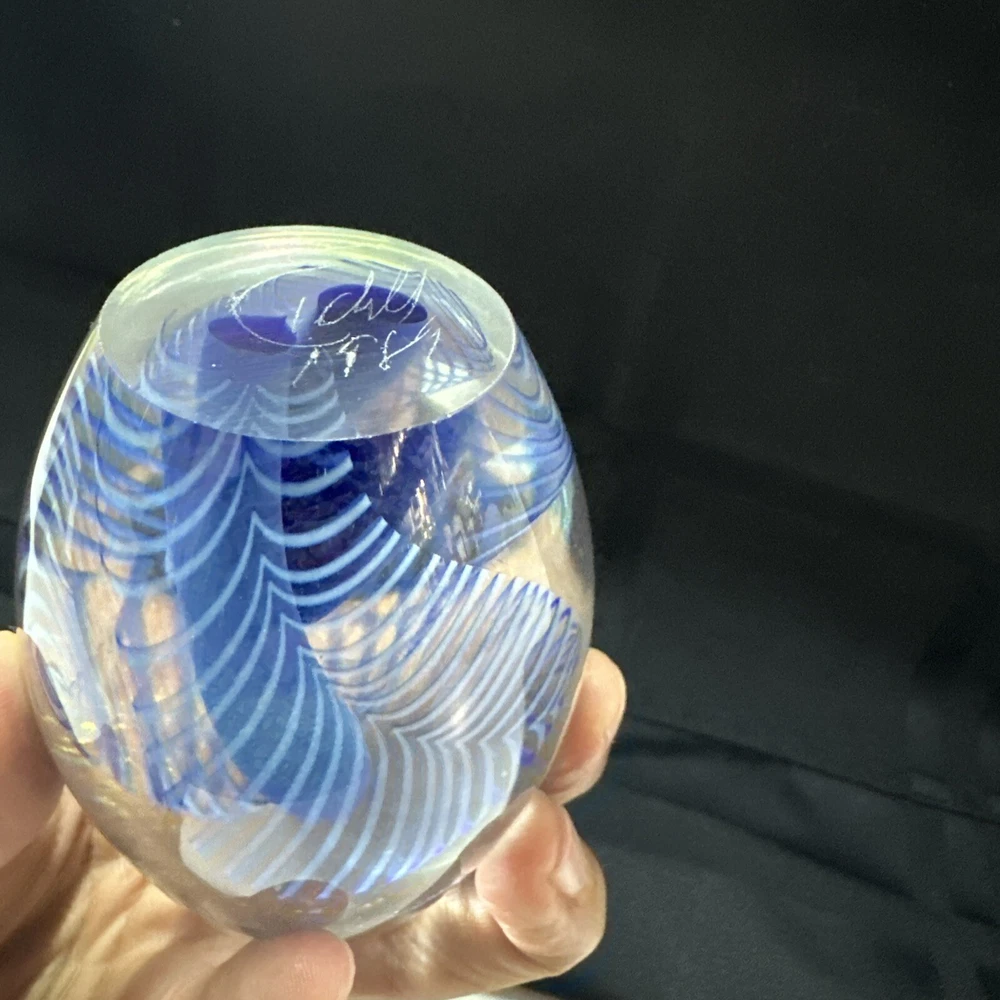 Robert Eickholt Egg Shaped Blue Iridescent Feather Pattern Glass Paperweight . Condition is Used. Shipped with USPS Ground Advantage....