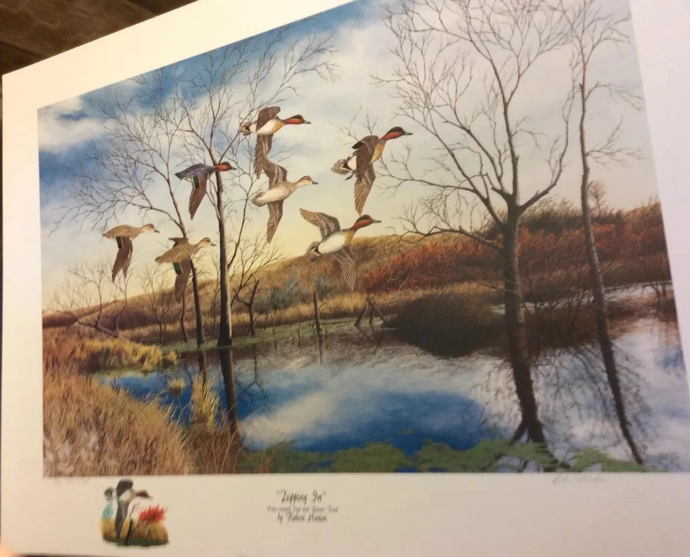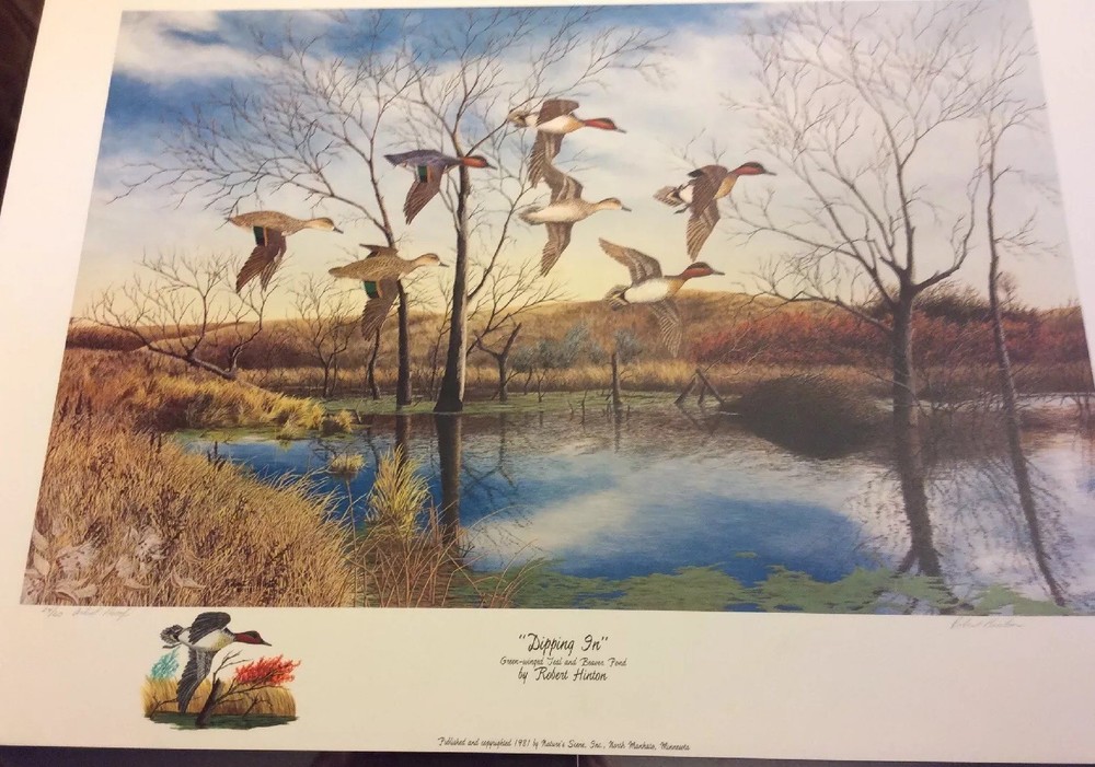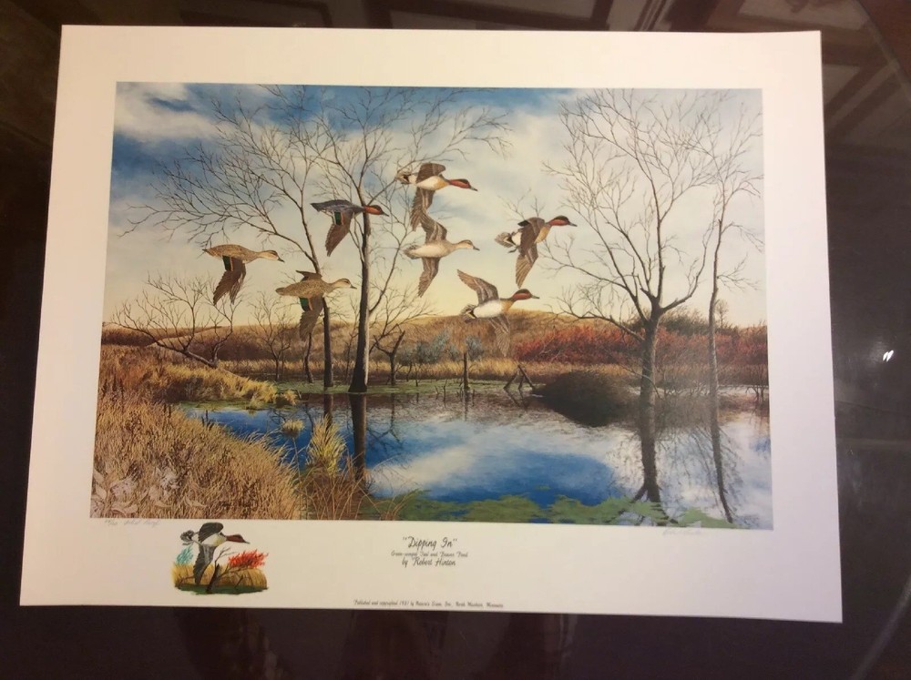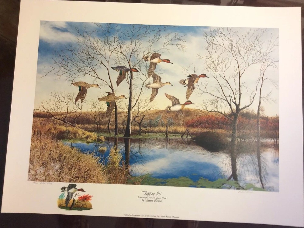 Robert Hinton, “ Dipping In” 24/60 Artist Proof, Remarked, 1981.. This is every Duck Hunters Dream,Green winged teal,& a beaver pond,& your at the ready. Large colored Remark, and a Artist Proof, 24/60. Artist: Robert Hinton Title: “ " Dipping In” Limited: Yes, 24/60. Artist Proof, Remarked Unframed: Yes, Condition: Excellent, No Damage Size: 21" x 28" Asking : $85.00 Shipping: $18.00 postal rates increasing, January 2019.fully insured , in a Tube. Returns: None Payment: Pay Pal Thanks: Arlen