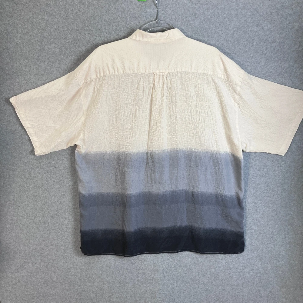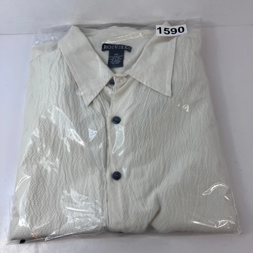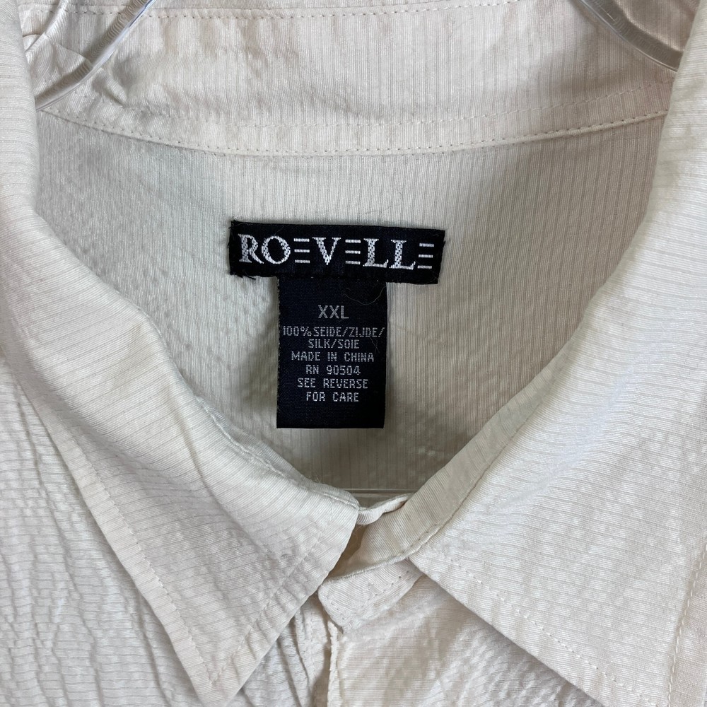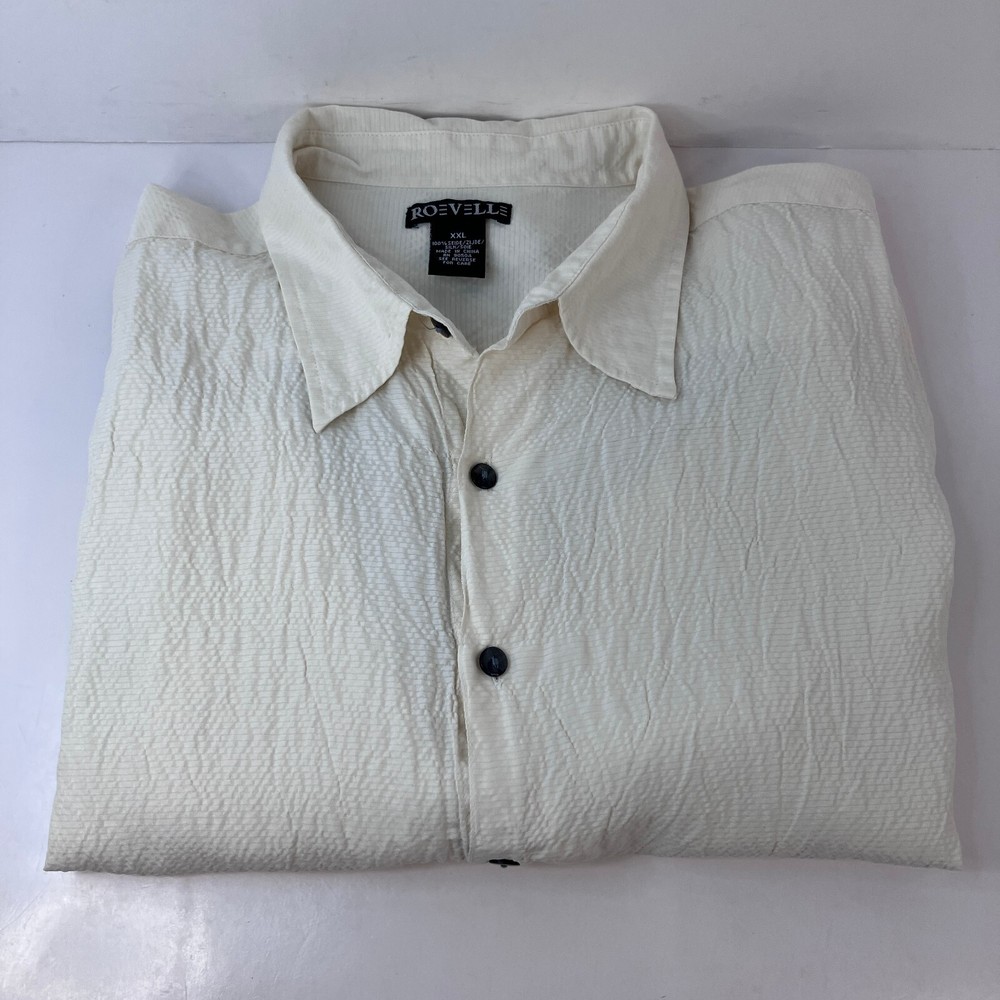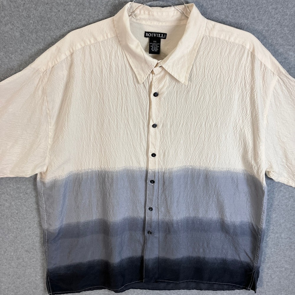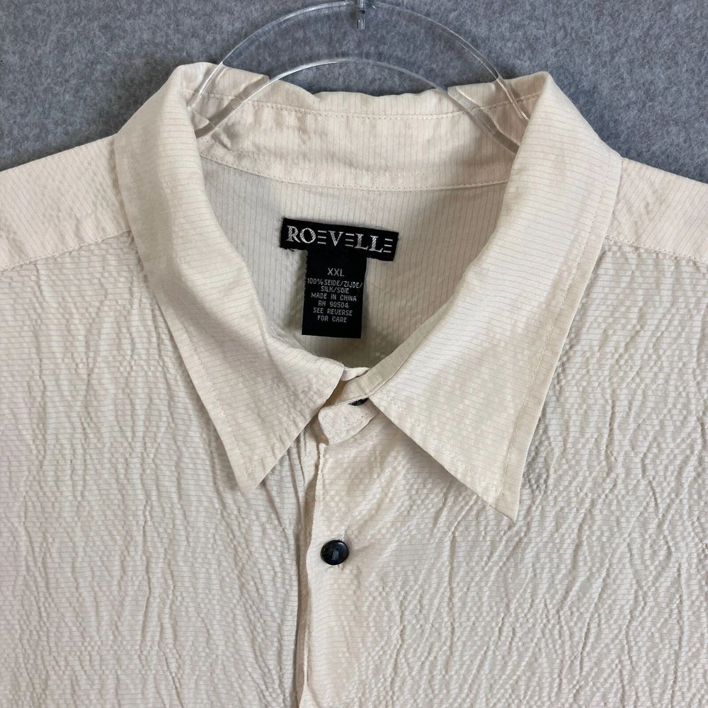 Roevelle 100% Silk Dip Dyed Shirt Men's Size 2XL Short Sleeve Light Beige Gray For your satisfaction and best fit, please check your best fitting shirt against the measurements provided below: Measurements made on a flat surface: 26" Chest: Armpit to armpit across chest. 30.5" Length: Measured from top of shoulders (where the collar stitching begins) to bottom hem on back. Pictures show measurements. CONDITION Shirt is in very good condition. Has been worn and washed a number of times but has no visible blemishes. Looks great! Pictures are of the item you will receive. NOTES The shirt is now sealed in a plastic package and no additional pictures can be provided. Stored in a smoke-free environment (we sell collectible toys, so we are very careful to keep everything clean). Item has been cleaned according to manufacturer or industry standards. Color may appear different due to lighting and differences in display screen. SHIPPING Fast shipping via USPS. We ship the next business day at the latest, and same day if the order is received before 9:00AM Eastern (M-F). Please make sure you have the correct shipping address in eBay prior to placing the order. We combine shipping (just add to cart prior to checkout) for multiple items. RETURN POLICY We offer a 30 day return policy on all clothing. If you are not 100% satisfied, you can return the item for a refund