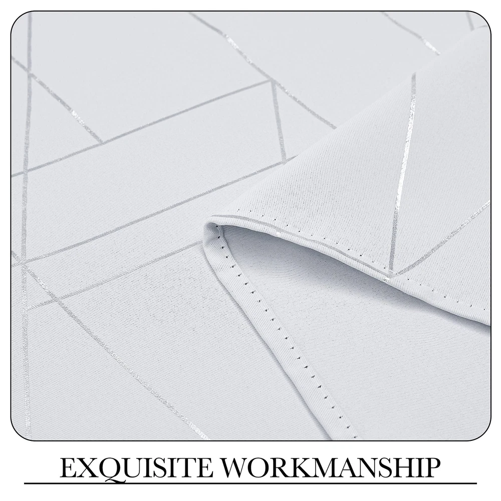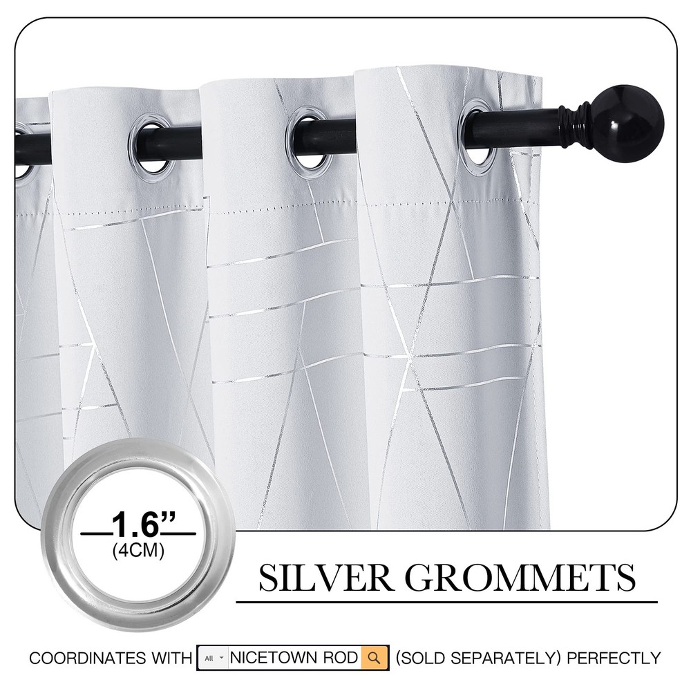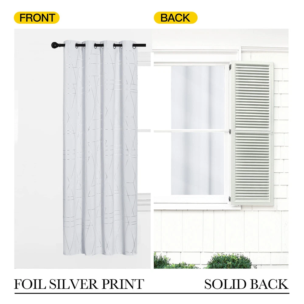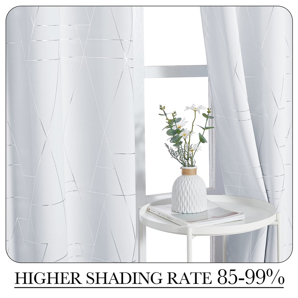 Blackout Curtains ELEGANT DESIGN: 2 panels per package. Each Blackout Curtain measures 52" wide x 84" long. The design of silver grommet (1.6 inch inner diameter) creates casual elegance for your house, which makes the curtains easy to install and slide. FOIL PRINTED: The sleek triangles abstract lines geometric pattern on the background adds a nice touch of glam to home styles. Get away from bland curtains and bring some major style to your bedroom with this iconic and worthy design. WISE BUDGET: Protect your furniture and floor exposed to the sun, while still balancing the room temperature in summer and winter. Privacy protection. The greatest benefit is to bring you a good night's sleep, making you full of energy every day. WIDE COMPATIBLITY: Don't bother looking for sheer curtains to match, choosing different styles of voile curtains with white color in . Such curtain sets provide a more permanent harmonious window dressing, making your home lively. EASY CARE: Good quality finishing will withstand years of use. Hand washable and Wash the water temperature below 86℉. Mild detergent no bleaching. Low temperature ironing. Don’t use sharp things scratching curtains.