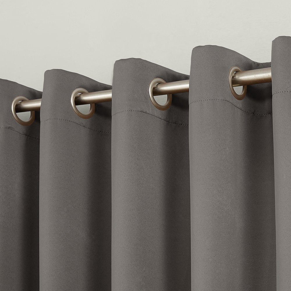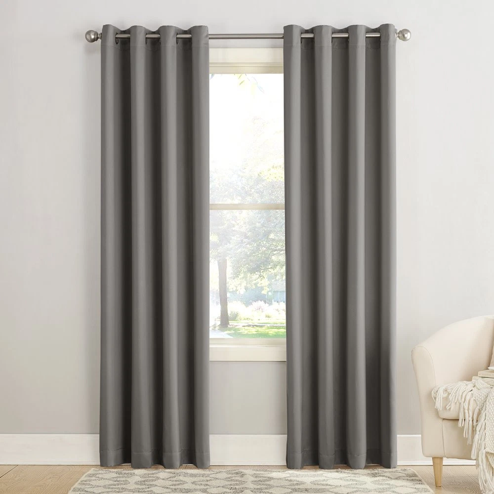 Room Darkening Noise Reduction Grommet Curtain Panel Home Decor Drapes 54" X 84" Room Darkening technology blocks out some unwanted light while enhancing privacy Energy efficient design reduces energy lost through your windows by up to 25% Thermal properties help keep summer heat and winter chill out of your home Noise reduction up to 25% helps you get a sounder, more uninterrupted sleep Built-in metal grommets fit curtain rods up to 1.5" in diameter Each panel sold separately Curtain rod not included. Double rod may be needed for layering. Sun Zero Madison Room Darkening panel brings style and energy efficiency to any home. The woven solid design with an easy to hang grommet-top offers a classic style that fits in with any room decor while reducing light and noise for better sleep; help keep your home cooler in the summer and warmer in the winter. Room Darkening panels are made of materials that reduce light, and considerably darken the room. Some light will show through. These materials do not allow a view through and provide complete privacy. The darker the color the better the light reducing capabilities. Sold individually. Hang on a rod up to 1.5" in diameter. Polyester. Washable. Imported.