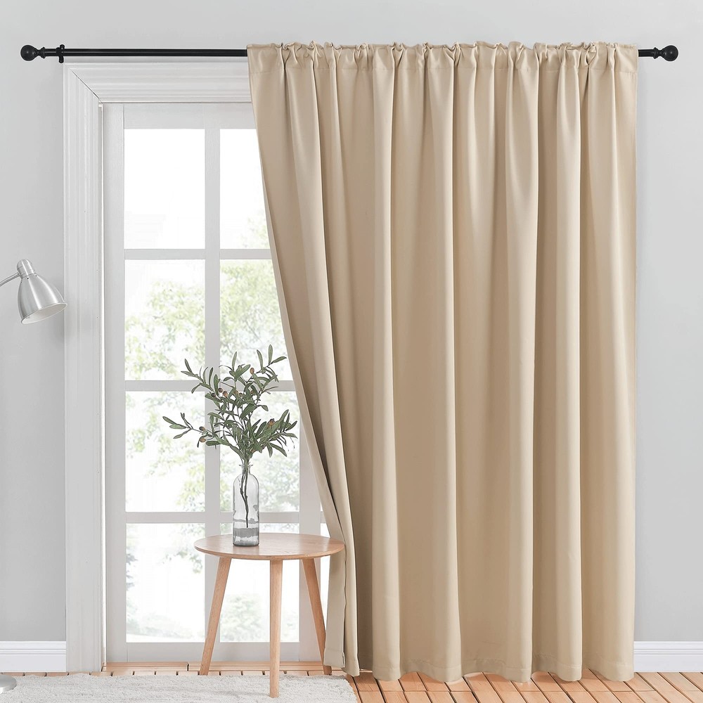 Extra Wide Blackout Curtain You will instantly fall in love with blackout curtain & drape . This curtain keeps the light out and helps to retain the warmth in winter and keep the room cool in the summer. NICE FABRIC: Sold individually. The same material back as of front makes it appear more elegant. This is a super soft innovative triple-weave 200 GSM polyester fabric; it feels very soft and thick. The back tab (1.6-inch opening tab) adds room casual and elegant. Whether it is a pole or slide, curtains can be very easy to install. PERFORMANCE: Microfiber thermal patio door curtain keeps the room at a set temperature by insulating against either heat or cold. TIPS: Looking for a great way to divide a room? Room Divider Curtains can be a clever solution for creating new spaces without building walls. Privacy: Just draw them shut when either side needs privacy, body shape hidden behind curtains, real protection to privacy. Portable: If you live in a dorm or a rental these room dividers are a great solution. They are easily installed and easily packed up, moved, and reused! Particularly suitable: Dressing Room, Fitting room, Bookstore, City Loft, Office Space, Shared Bedroom, High Ceilings, Factories, Hospitals, Studio, Dorm, Storage Space, Cafes, hotels, etc. EASY CARE: Curtains are made to last. Machine washable in cold water, tumble dry. Quick iron or steam clean when needed. NOTE: Package includes curtain only, no pole. Due to different screen displays, the color of the actual item may vary slightly from the above images. READY MADE: Package includes a panel Sliding Glass Door Curtains with 100" wide x 84" length(Rings with clips not included in package). Both 2 inches opening top pocket and back loops create casual elegance for your house. Both sides are the same color. ADJUSTABLE LENGTH: Don't worry if this slider curtains are a few shorter than your windows. You can hang this patio door curtains with rings and hooks. That could be adjustable for height max 3 inches. Hooks space distance around 4-6 inches. WISE BUDGET: Protect your furniture and floor exposed to the sun, while still balancing the room temperature in summer and winter. Privacy protection. The greatest benefit is to bring you a good night's sleep, making you full of energy every day. NICE FABRIC: The blackout curtain's fabric is super soft and heavily innovative triple-weave polyester fabric. Suitable perfectly for sliding door, patio door, and any large window. These wide curtains can be hung separately, or combine with sheer curtains. NICE SERVICE: Decorate your home, high quality. Nice pre-sale and after-sale service. Your 100% satisfaction is our #1 priority. Just customer support if you would like to return our products for any reason.