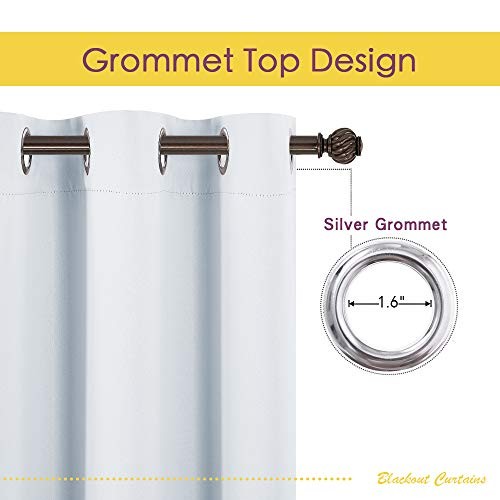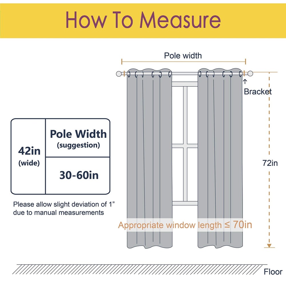 Product Page NICETOWN Room Darkening Window Curtain Panels, Easy-Care Solid Thermal Home Description: Features: ELEGANT DESIGN: 2 panels per package. Each Blackout Curtain measures 42" wide x 72" long. The design of silver grommet (1.6-inch inner diameter) creates casual elegance for your house, which makes the curtains easy to install and slide. AMAZING MATERIAL: Super heavy and soft Blackout Curtain Panels are very upmarket. Besides, 85%-99% light blocking, thermal insulated, soundproof, Fade-resistant, energy-efficient. Thread trimmed and wrinkle-free, both sides are the same color. WISE CHOICE: Protect your furniture and floors from sun exposure, while enhancing the energy efficiency of your home. Enjoy added privacy with our curtains, designed to ensure a restful night's sleep that leaves you energized each day. WIDE COMPATIBILITY: Don't bother looking for valance to match, choosing different styles of blackout valance with the same color in the store. Such curtain sets provide a more permanent harmonious window dressing. EASY MAINTENANCE: Machine or hand washable. Mild detergent no bleaching. Low-temperature ironing. Measure your pole and window size before you choosing curtains.