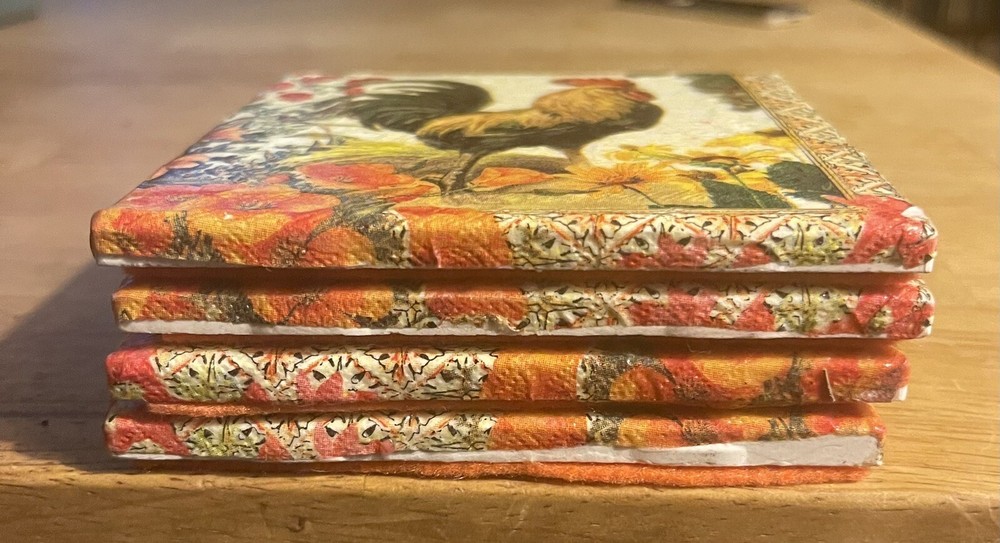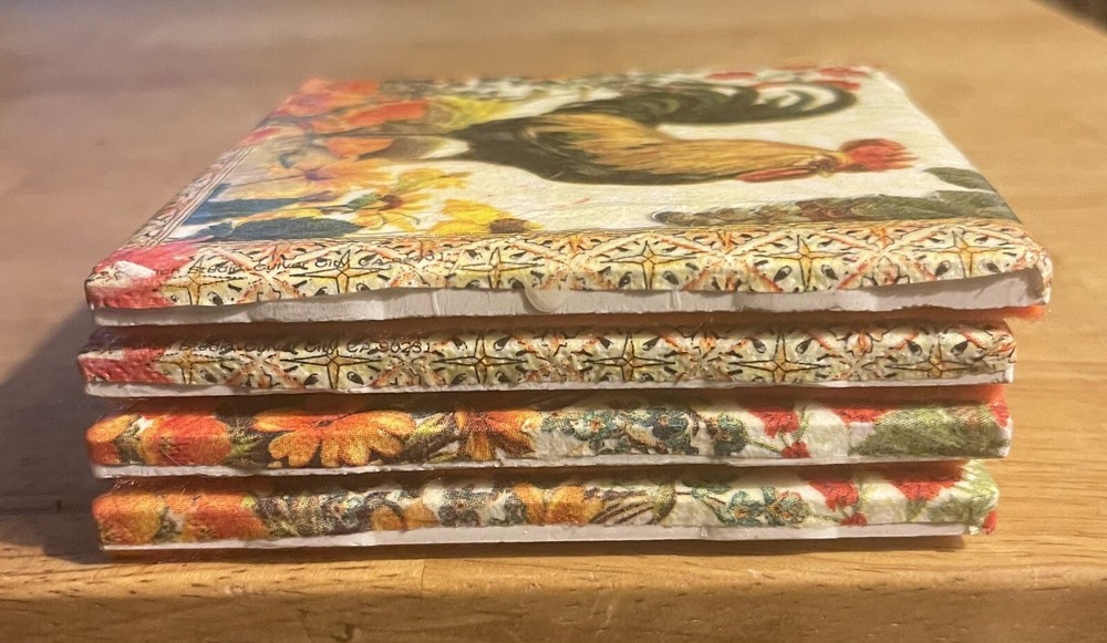 Add a touch of charm to your home decor with this set of four Rooster Coasters from Punch Studio. These coasters are made of chalk-like ceramic material and are handcrafted with decoupage and felt bottoms. Each coaster is square-shaped with a dimension of 4.25" x 4.25" and weighs 5.6 oz. The design features a colorful and handsome country rooster, perfect for all occasions and styles. The set includes four coasters, and they come in multicolor. The rooster chalk coasters are original with an unknown time period of manufacture and country/region of manufacture. These coasters are perfect for collectors and will add a country theme to your kitchen and home barware.