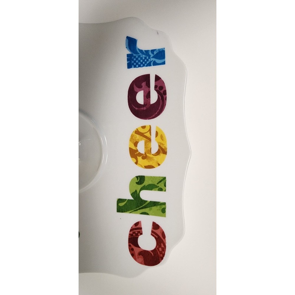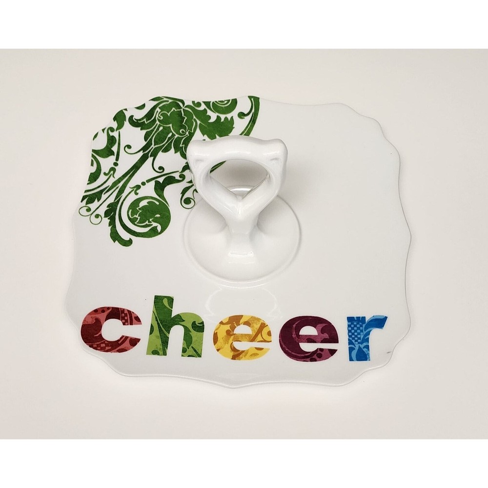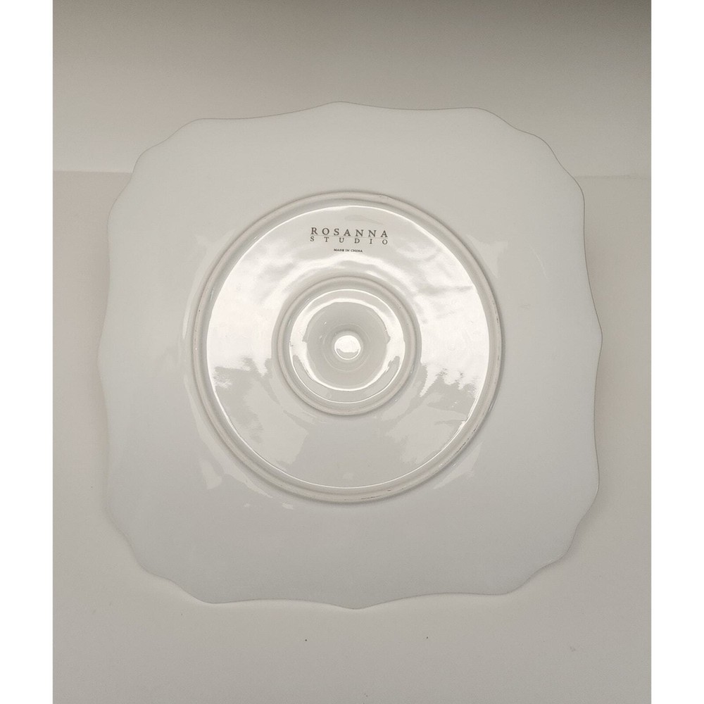 Rosanna Studio "Cheer" Square 9.5" X 9.5" Ceramic Tidbit Tray Serving Tray The Rosanna scalloped sweets tray is 9.5 inches square and made of refined porcelain with a white loop handle in the center This serving tray is in great pre-owned condition with no cracks, chips, crazing, or visible scratches, just a tiny stain right by the letters. Besides that, the plater is in great condition. Please check the pictures for more details. Also, view all the photos carefully for condition. This item presents as it has not been used much. NON-SMOKING AND PET-FREE HOME Pre-owned items are washed and professionally cleaned before being mailed out to customers. Please check my other listings for more great items. I am always happy to combine items from multiple purchases whenever possible to save you $$$ on shipping costs. Feel free to message me if you have any questions. All reasonable offers will be accepted, no lowball offers, please.