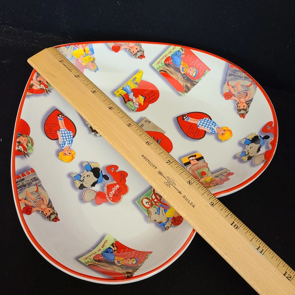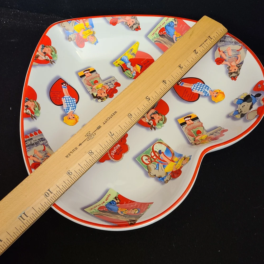 Rosanna Studio Valentines Day Retro Card Ceramic Heart Shaped Plate Candy Dish Measures 9.75" tall, 10" wide and 1.75" deep. Packaged carefully and shipped quickly from a smoke-free environment.