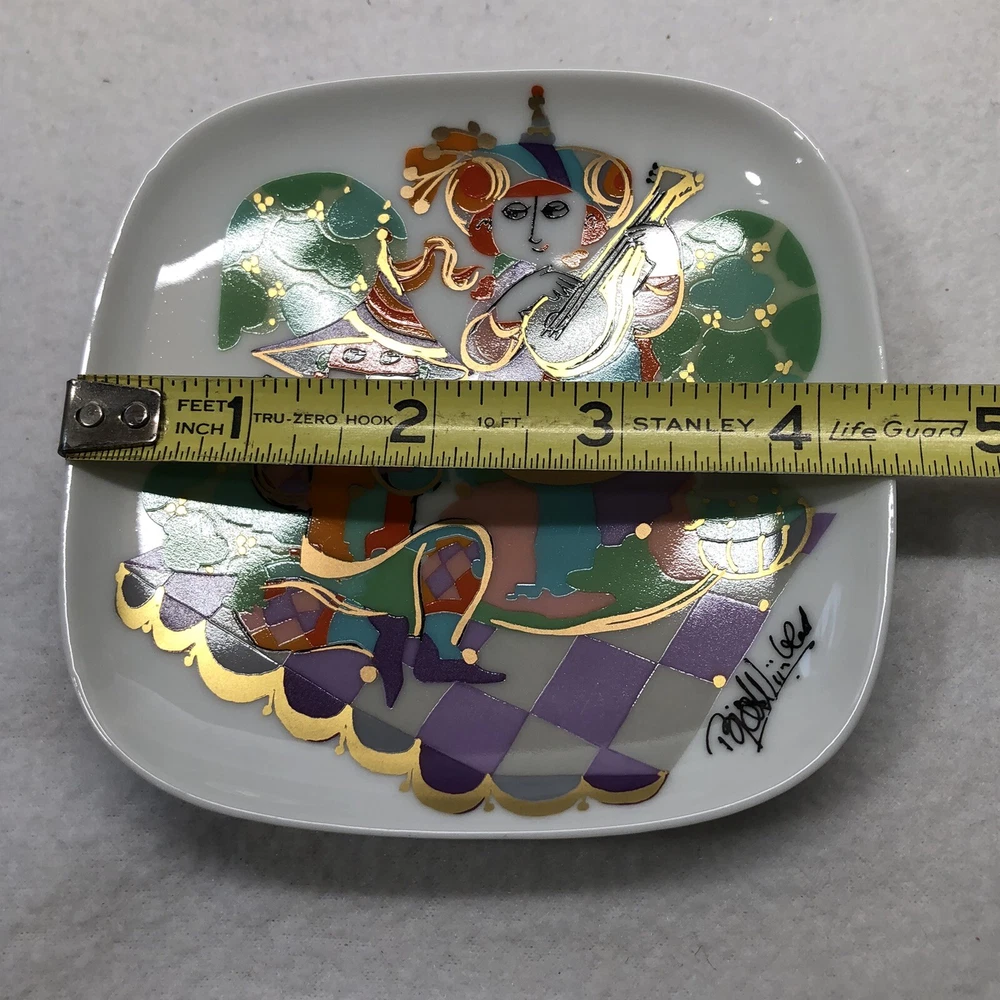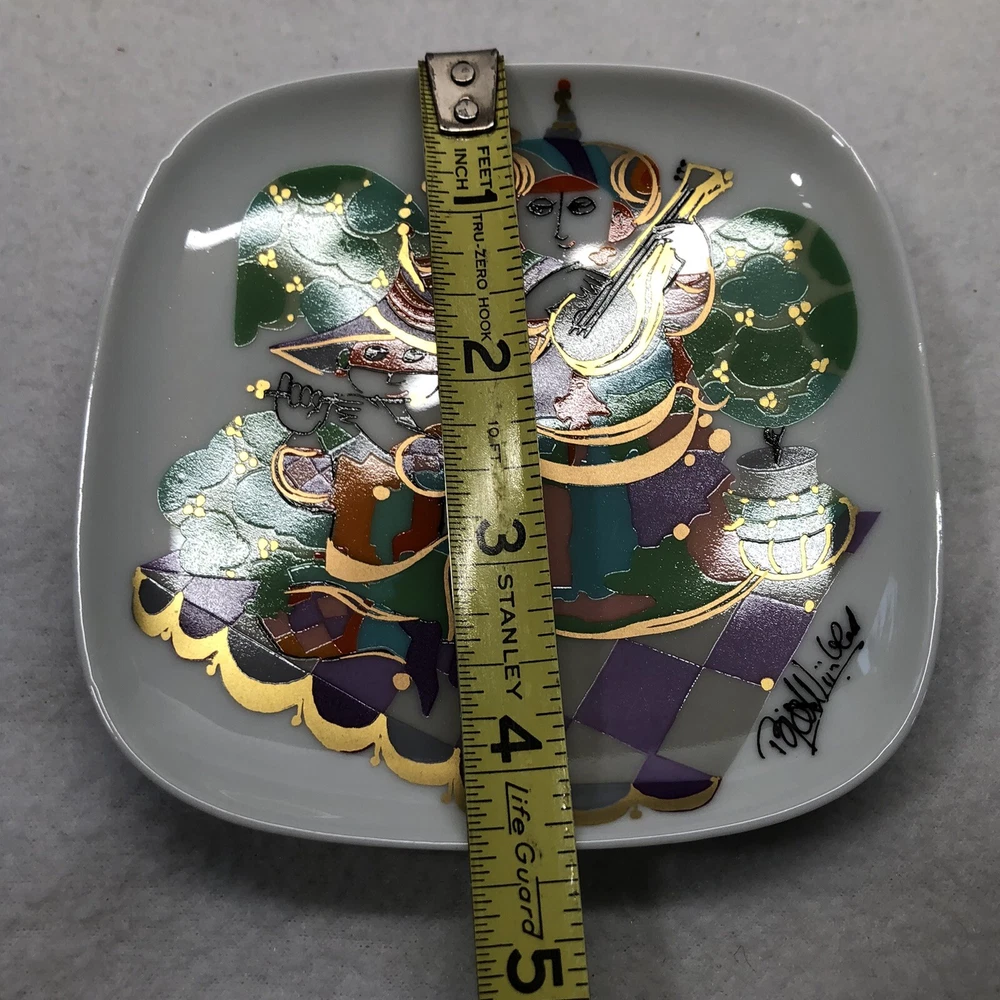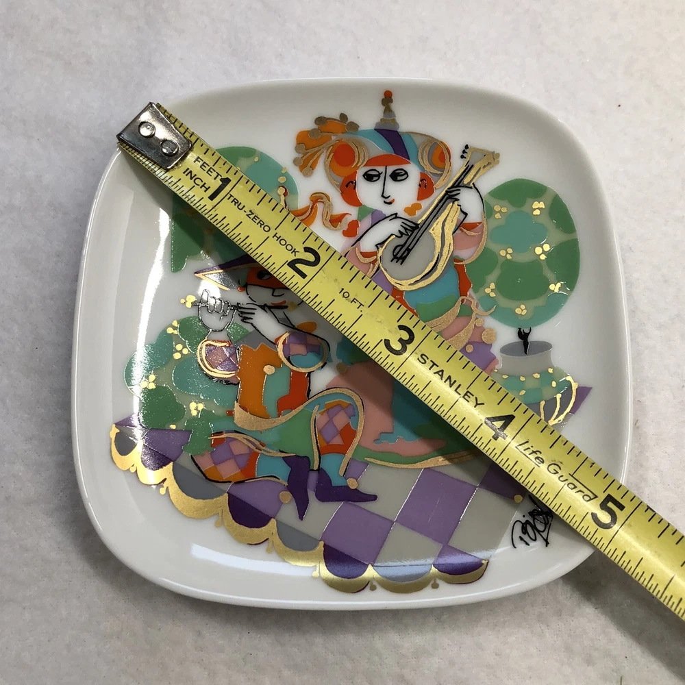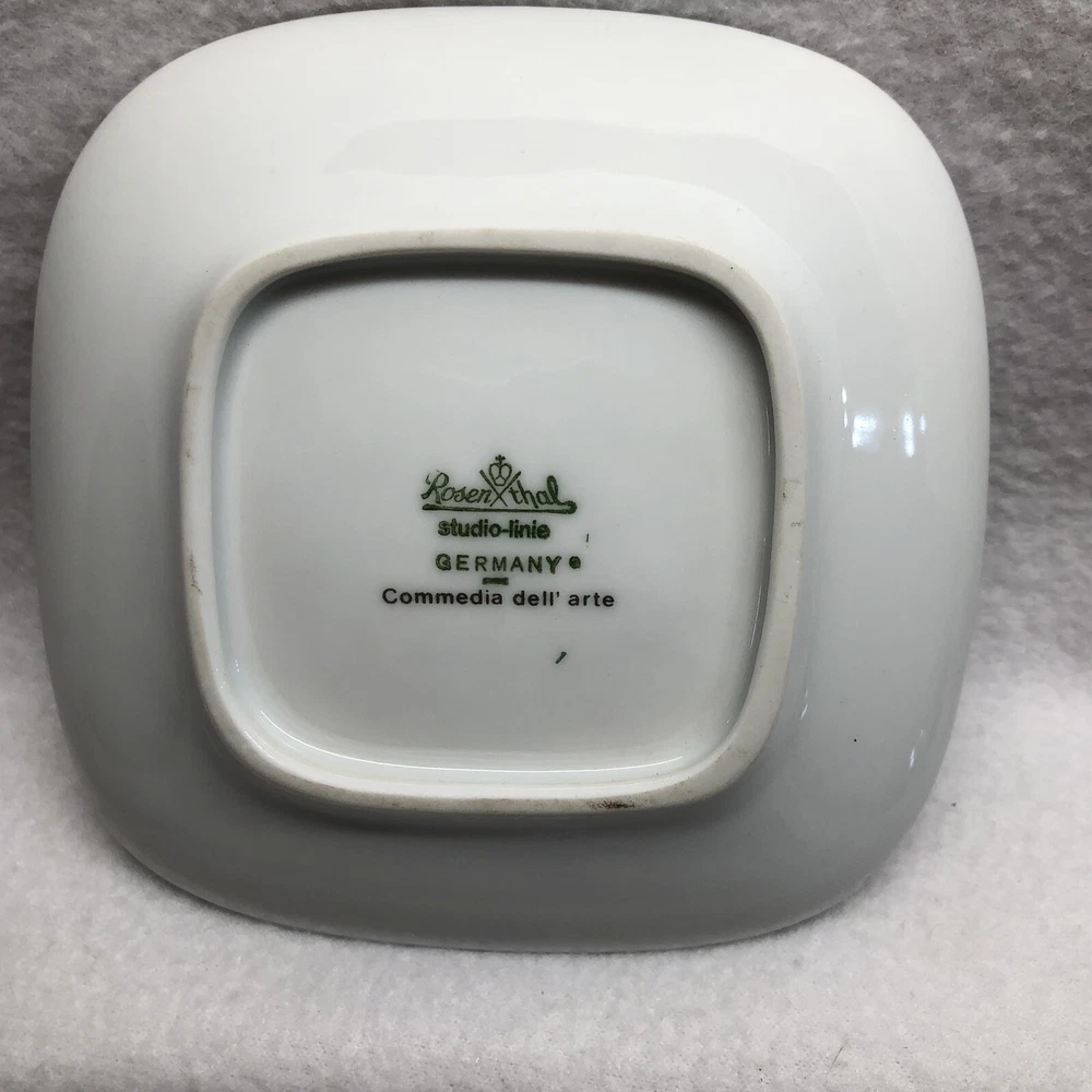 This is a beautiful multi-colored dish designed for Rosenthal by Bjorn Wiinblad in the pattern Commedia Dell' Arte. It features a man and a woman playing a flute and a stringed instrument. Perfect for nuts, mints, candy, olives, pins or simply to display, the dish measures approximately 4 3/8 inches square and is about 5/8 inch tall. It is stamped Rosenthal Studio-Linie Germany Commedia Dell' Arte on the back with the number 1 in green. Appears to be fairly rare. Dish is in good pre-owned condition. There are no nicks, chips, cracks or repairs. Please review and enlarge all photos for additional details, views and measurements. Shipped via USPS Ground Advantage.
