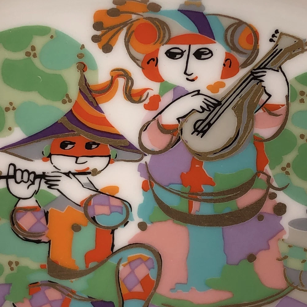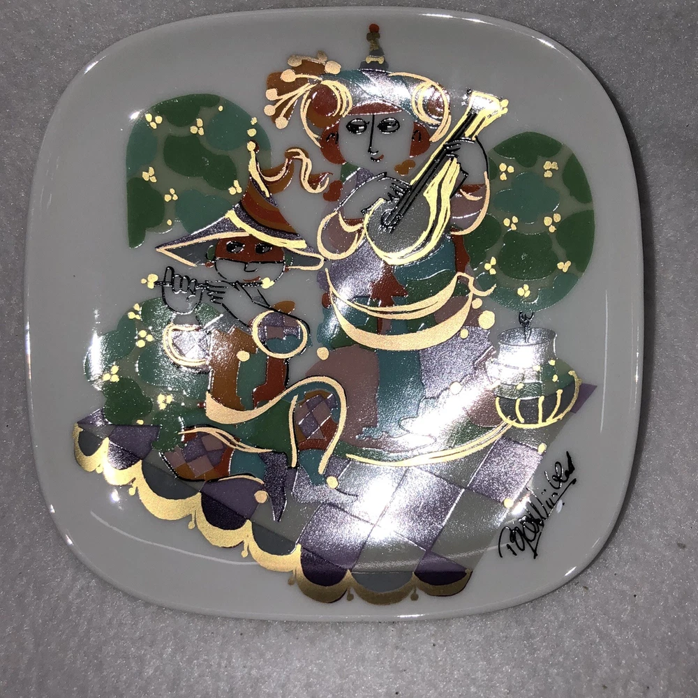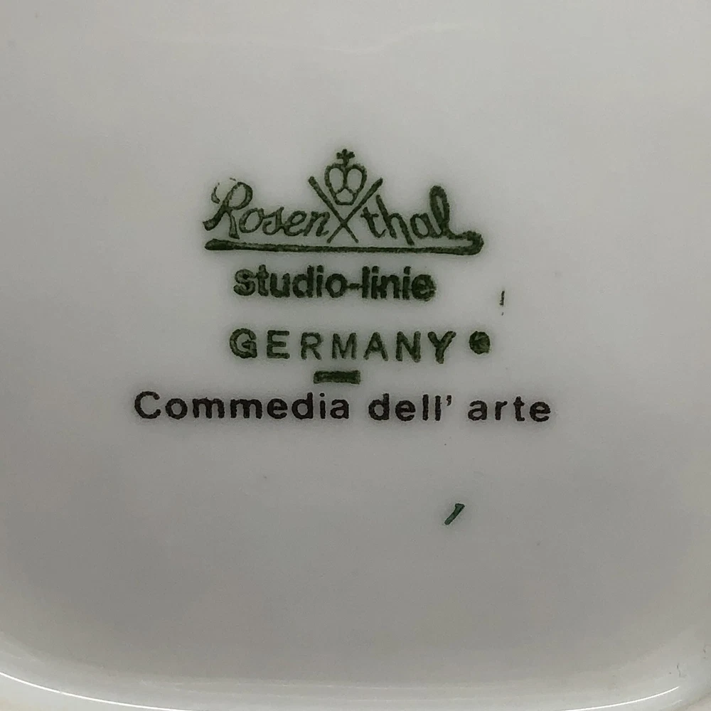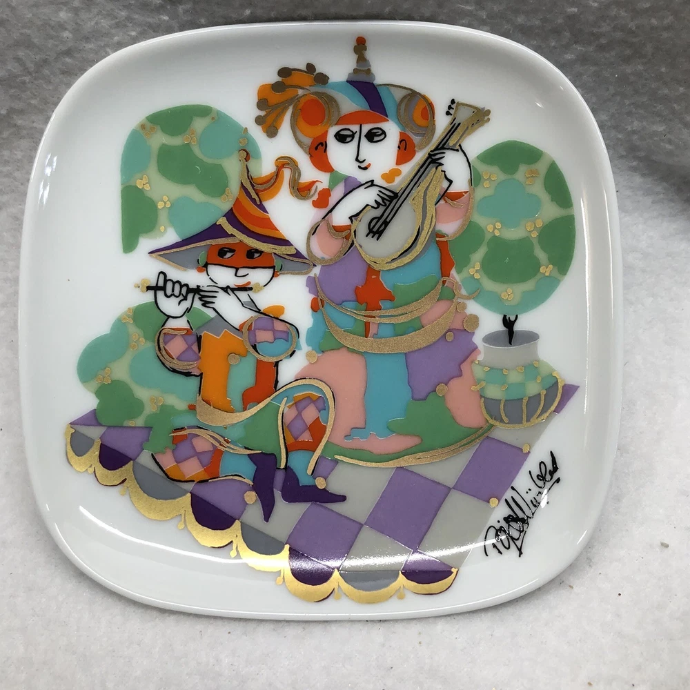 This is a beautiful multi-colored dish designed for Rosenthal by Bjorn Wiinblad in the pattern Commedia Dell' Arte. It features a man and a woman playing a flute and a stringed instrument. Perfect for nuts, mints, candy, olives, pins or simply to display, the dish measures approximately 4 3/8 inches square and is about 5/8 inch tall. It is stamped Rosenthal Studio-Linie Germany Commedia Dell' Arte on the back with the number 1 in green. Appears to be fairly rare. Dish is in good pre-owned condition. There are no nicks, chips, cracks or repairs. Please review and enlarge all photos for additional details, views and measurements. Shipped via USPS Ground Advantage.