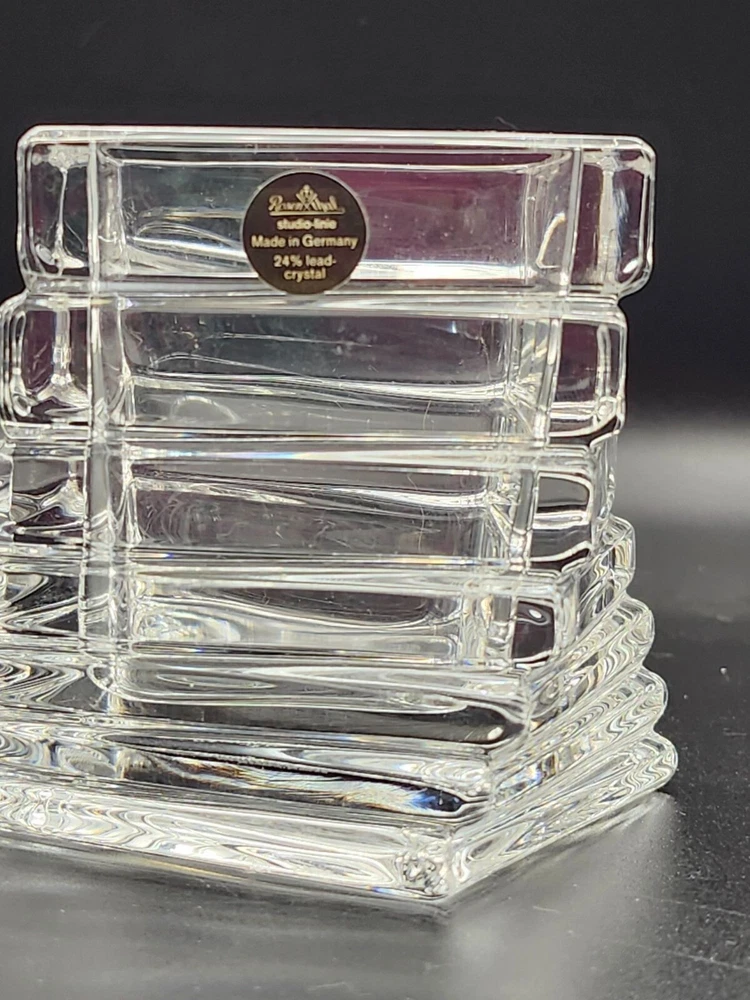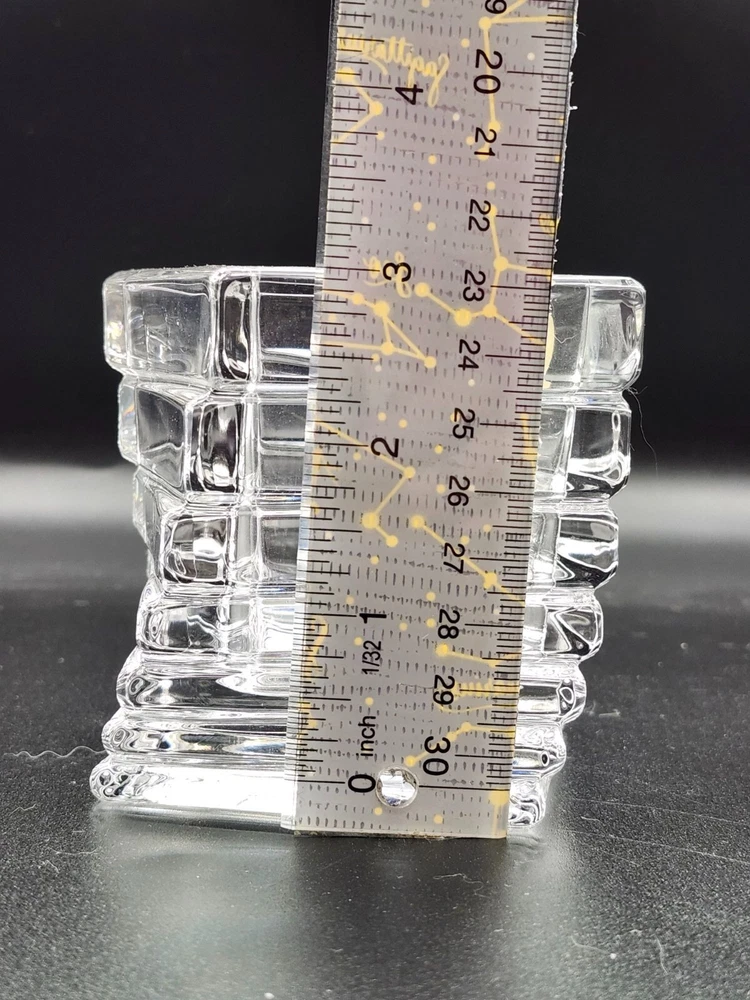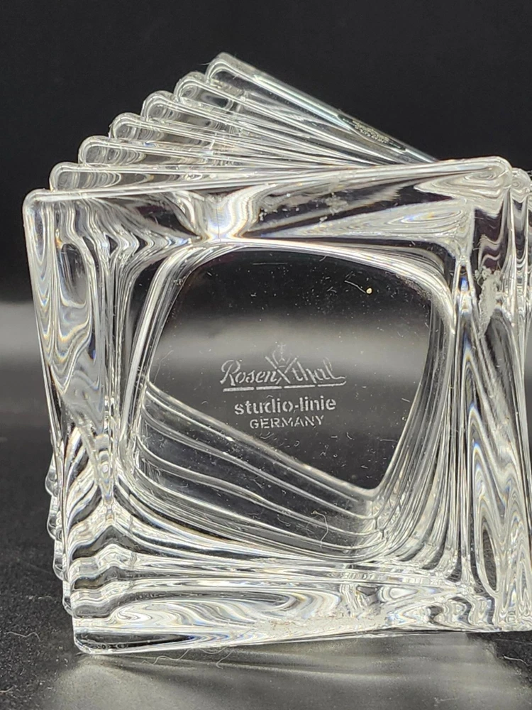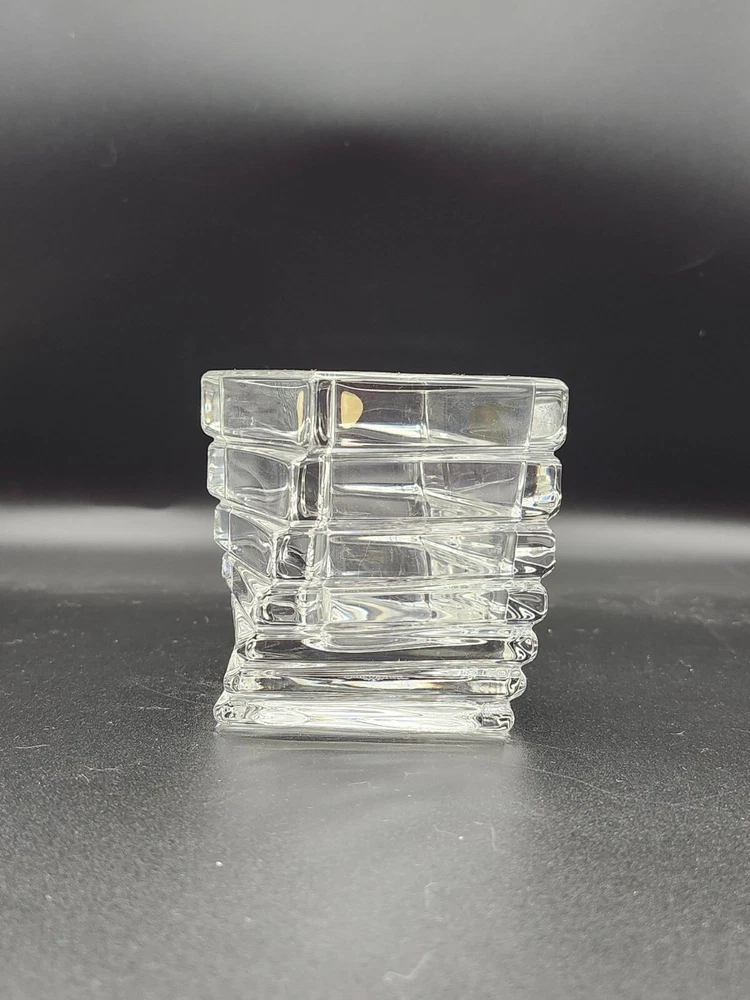 This Rosenthal crystal vase features a unique square design, crafted in Germany with 24% lead crystal. Its modern aesthetic complements any sophisticated interior. • 24% lead crystal composition • Square design • Made in Germany • Height: 2.75 inches • Studio-Linie collection Top to bottom = 2.75 inches