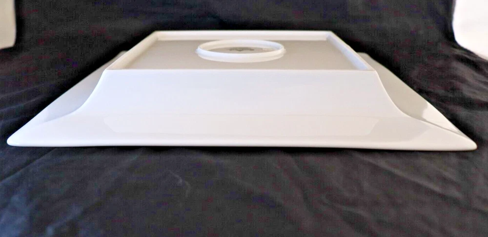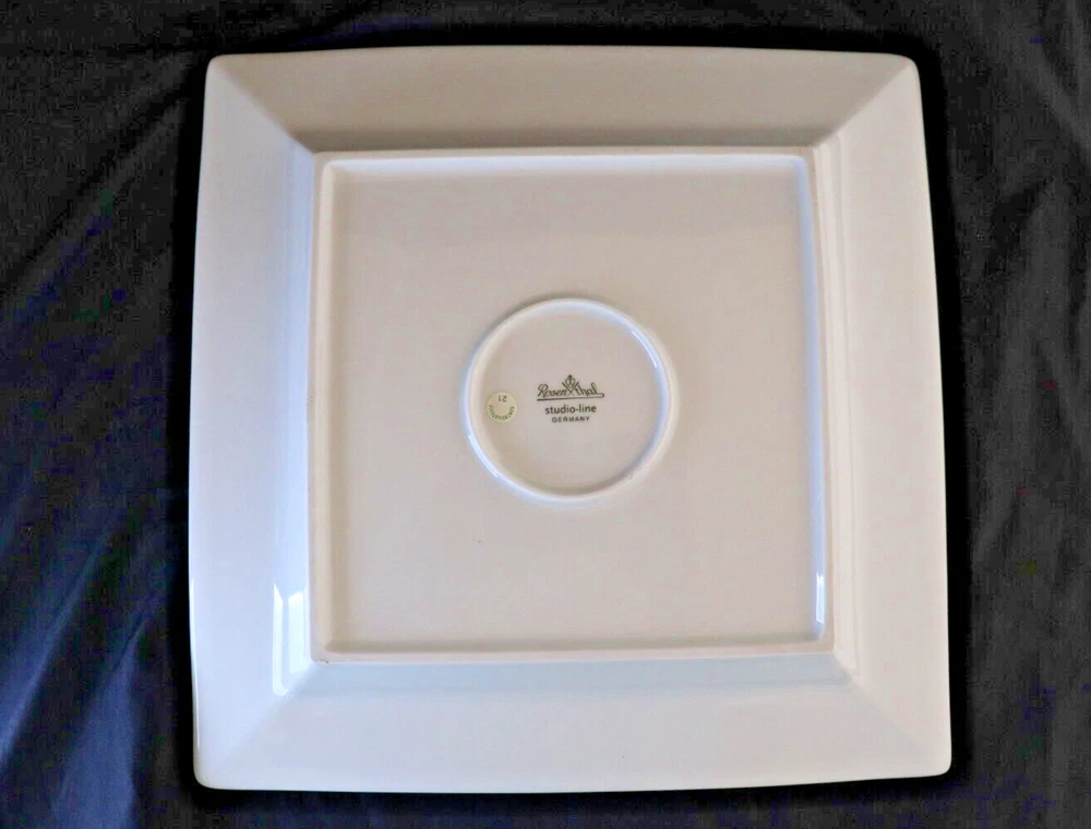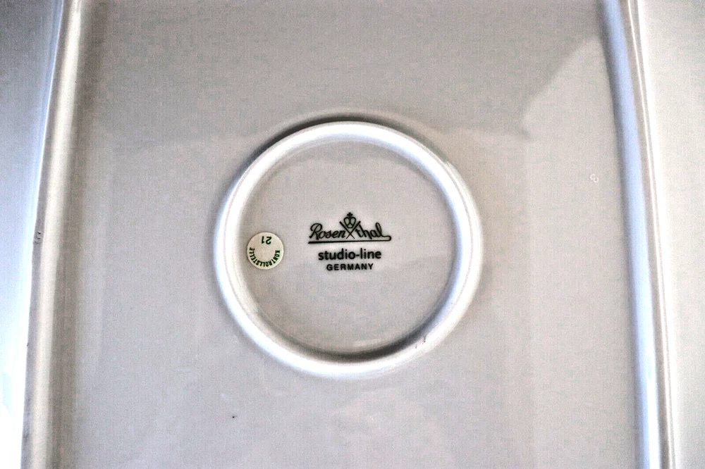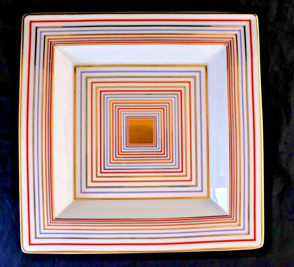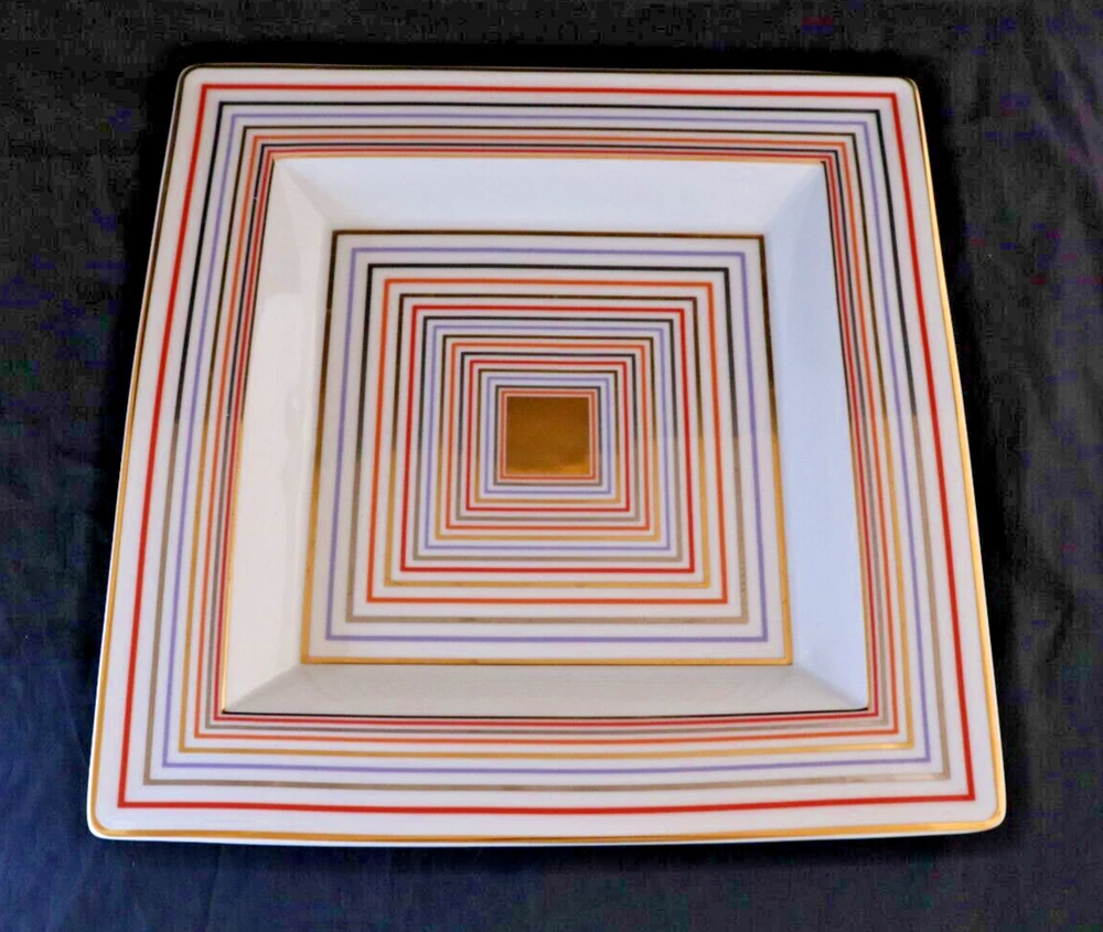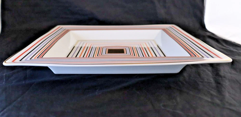 This vintage Rosenthal Studio Line serving platter is a rare find for collectors and enthusiasts alike. The square platter features concentric stripes in multicolor and is made of high-quality porcelain. Measuring 12 inches in length, 12 inches in width, and 1.5 inches in depth, this platter is perfect for serving your favorite dishes at your next dinner party. Hand wash only to preserve the glossy finish and printed backstamp. This original piece was made in Germany and weighs 3lbs 5oz. Add this unique and beautiful item to your collection today!