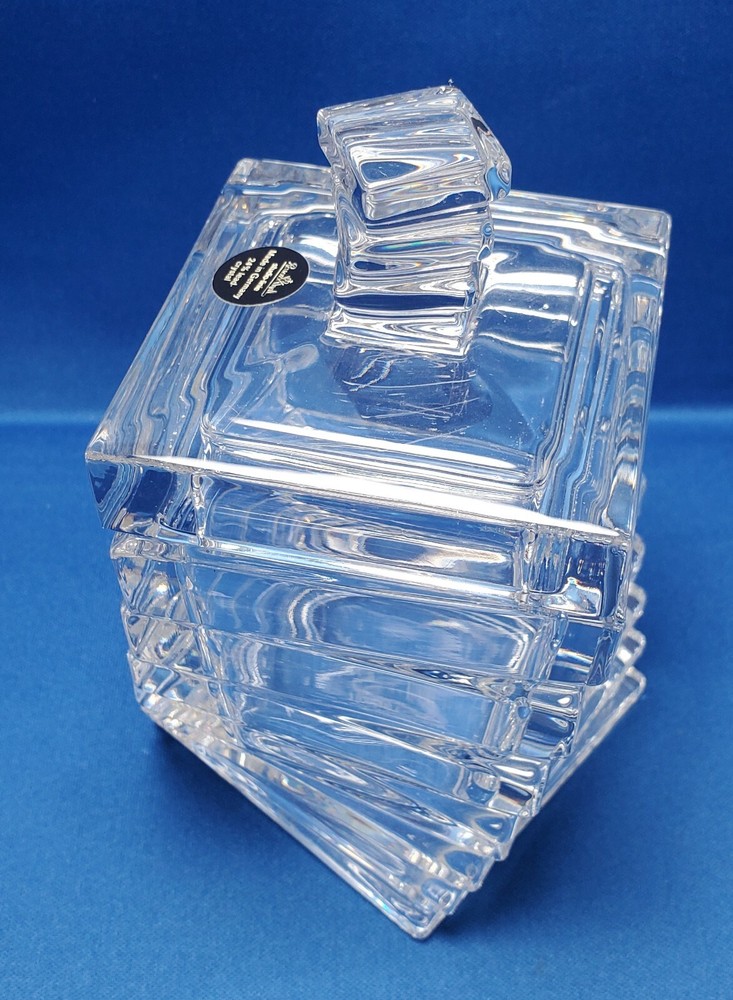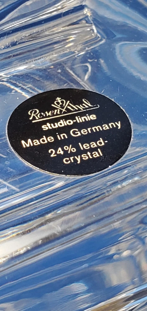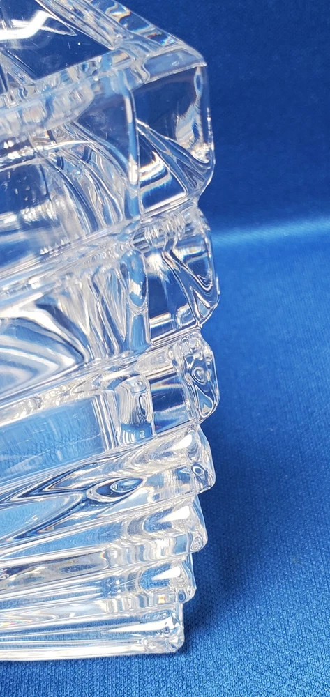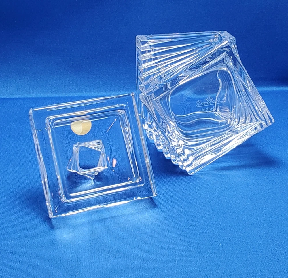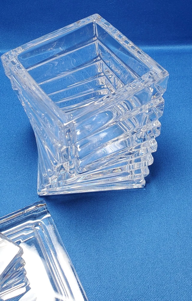 This stunning Rosenthal Studio-Linie Lidded Box is a unique addition to any collection. Made from 24% lead crystal in Germany in the late 20th century, it features a geometric pattern of stacked squares with a 3D effect and a twisted design. The vase has a clear finish and is handmade with abstract production style. Rosenthal stamp is etched on the bottom Measuring 5 1/8" in height and 2.75" in width, this lidded glass box is perfect for storing small items or serving as a decorative piece. In excellent pre owned condition This vintage piece is a must-have for any art deco or studio craft enthusiast. From a pet free and smoke free home Please see photos for details and message me with any questions you may have