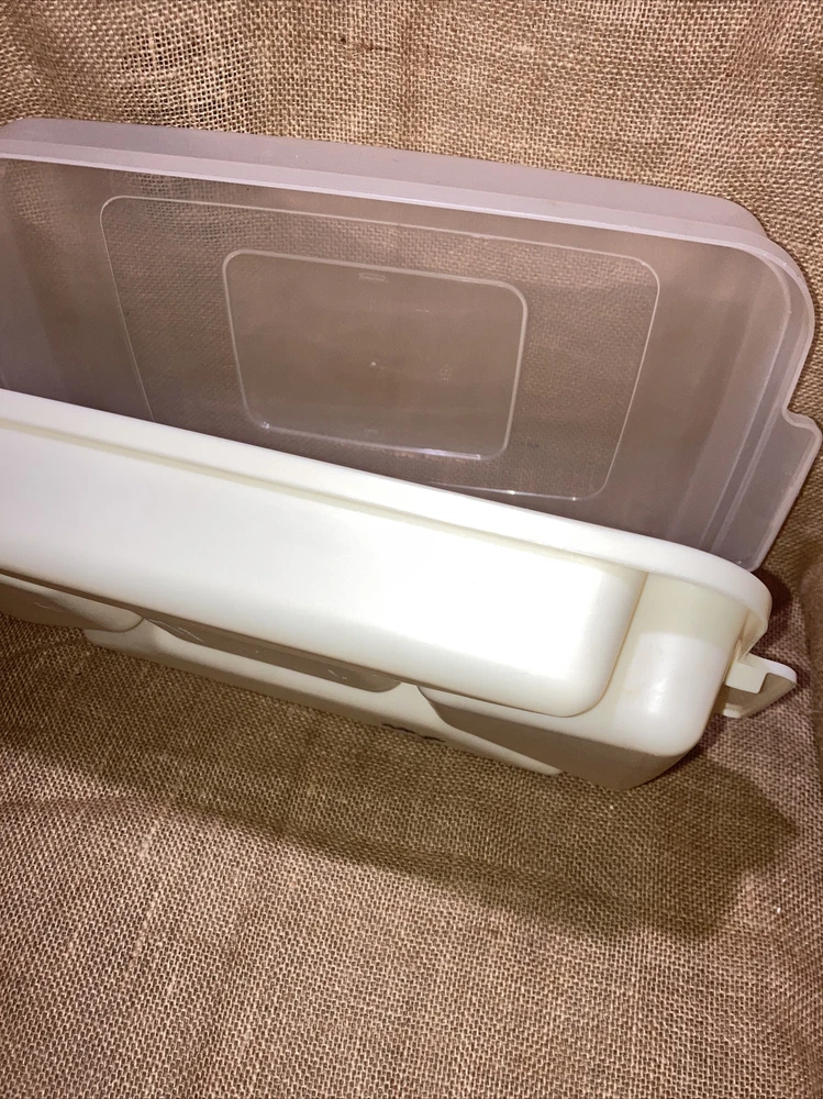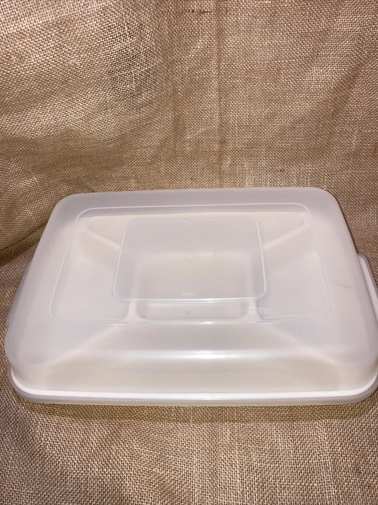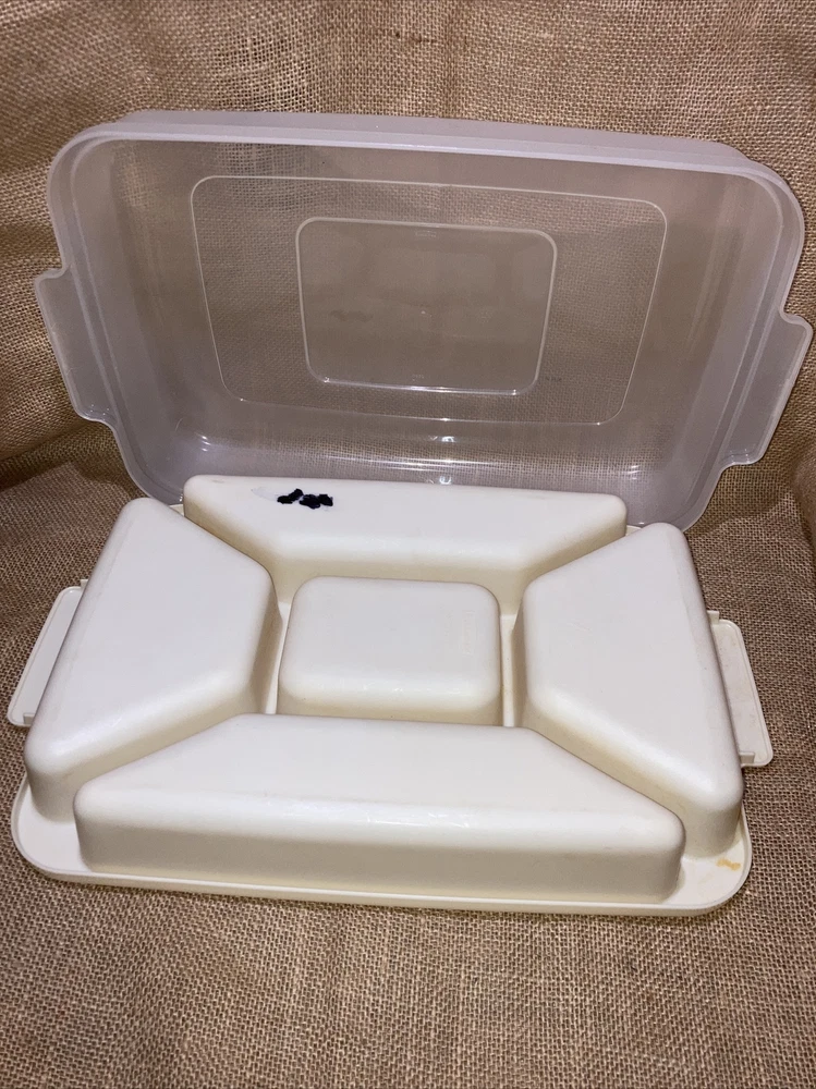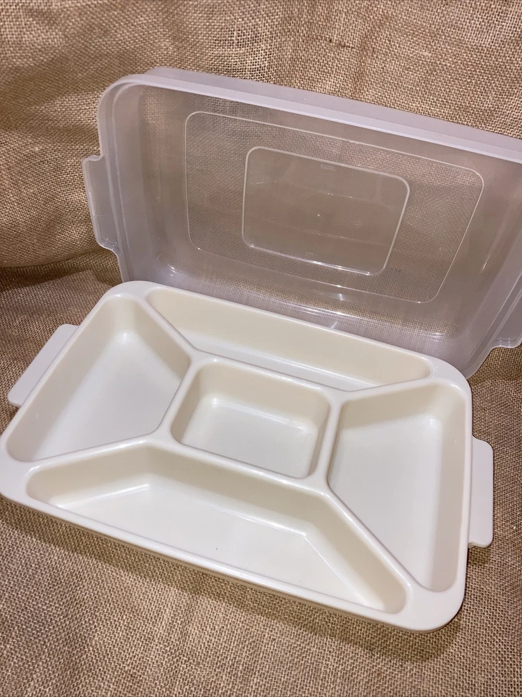 Container is used but is in excellent condition. No stains or cracks. Does have a cpl spots on bottom that appears to be permanent marker (see photos). Lid fits tight and true. Has 5 decent sized sections and 2 handles for carrying. The sections are about 2.25 inches in depth. Measurements are as follows : Approximately 16 inches long by 10 inches wide by 4.5 inches tall with lid on and 2.25 inches tall with lid removed. Ready to enjoy 😊 Questions are welcomed. We package and ship SAME DAY (depending upon time of day) Explore our store for more great deals/finds. Thanks