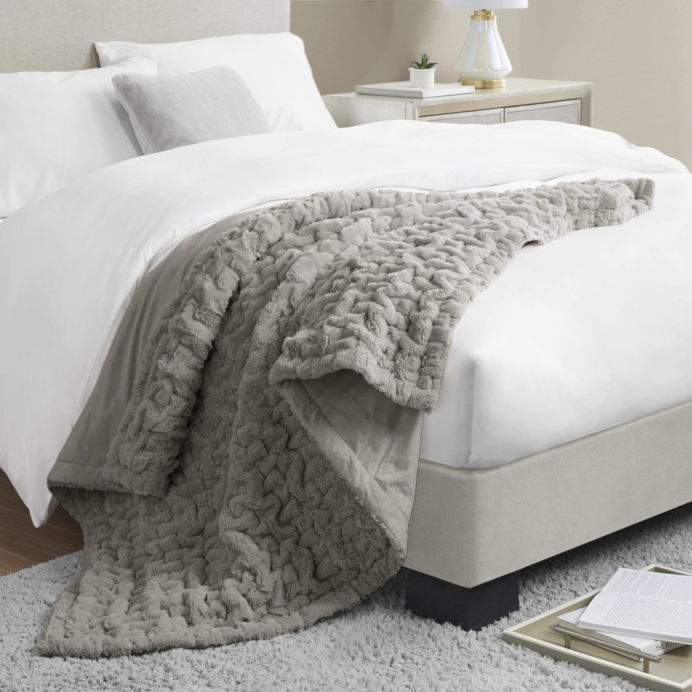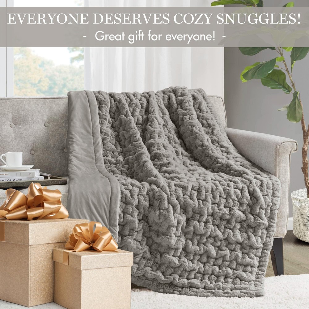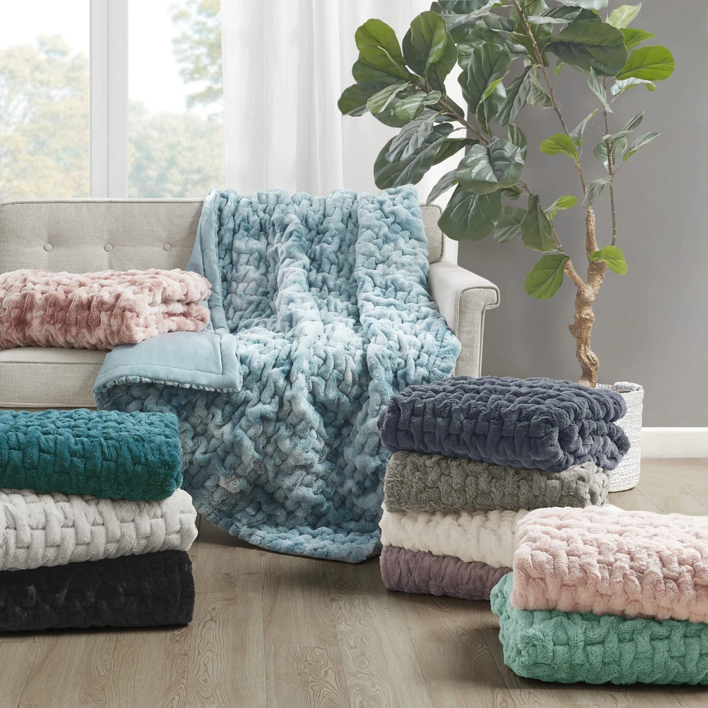 Add a modern and sophisticated touch to any space with the Ruched Fur Throw. This throw features a tie-dye ruched fur pattern, reversing to a faux mink to keep you warm and cozy. Machine washable for easy care, this throw is OEKO-TEX certified, meaning it does not contain any harmful substances or chemicals to ensure quality comfort and wellness. Ruched pattern Ultra soft long fur 50x60" Face: Solid Faux Fur, 100% Polyester Reverse: Solid Faux Mink, 100% Polyester Filling: 100% Polyfill 1 Throw:50x60" MACHINE WASH COLD, GENTLE CYCLE, AND SEPARATELY. DO NOT BLEACH. TUMBLE DRY LOW, REMOVE PROMPTLY. DO NOT IRON. IF THERE IS NO FREE MOVEMENT IN THE WASHER OR DRYER, USE LARGE CAPACITY COMMERCIAL WASHER/DRYER.