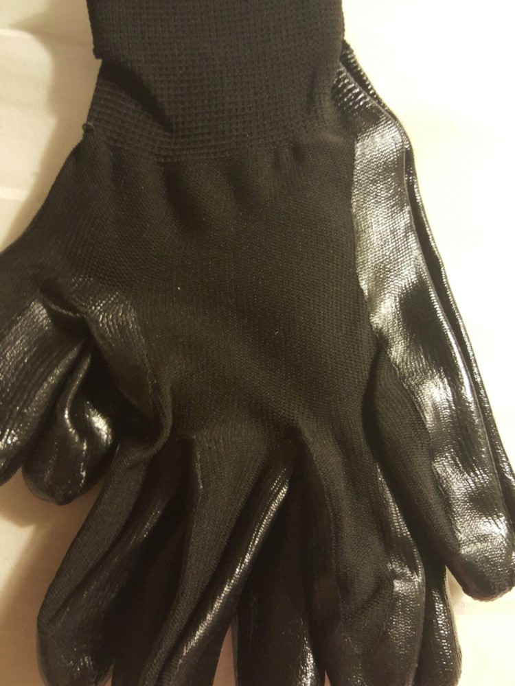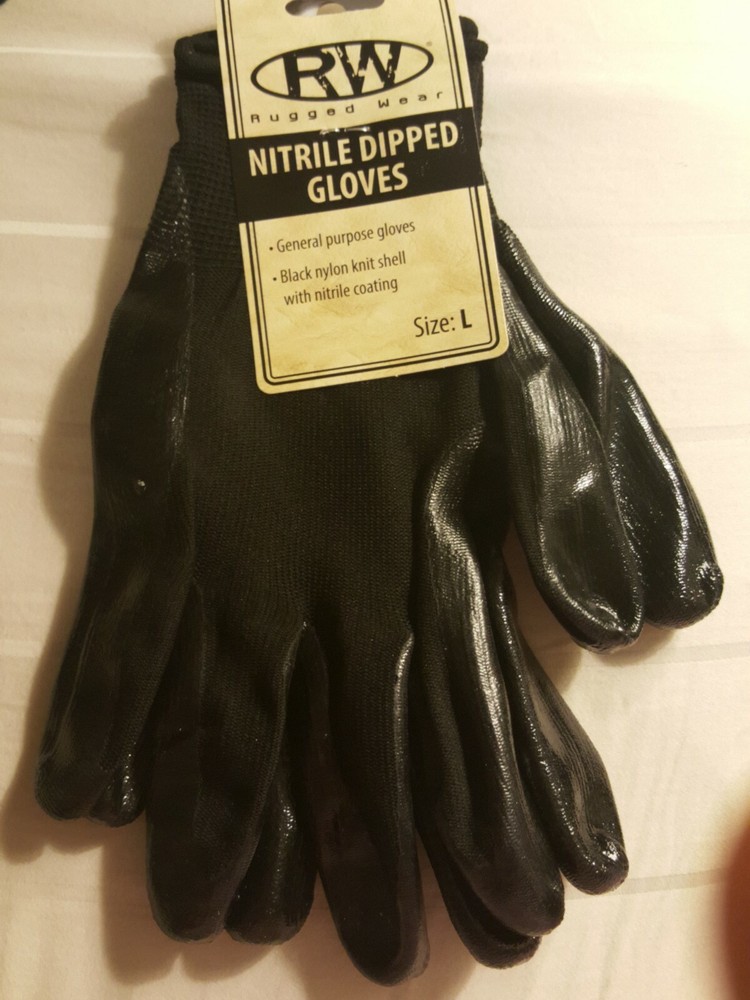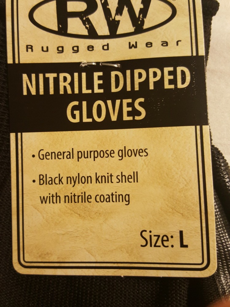 Rugged Wear Nitrite Sipped Gloves New size large. Condition is New. Shipped with USPS First Class Package. Size large. Black color. General purpose gloves with black nylon knot shell with nitrile coat...