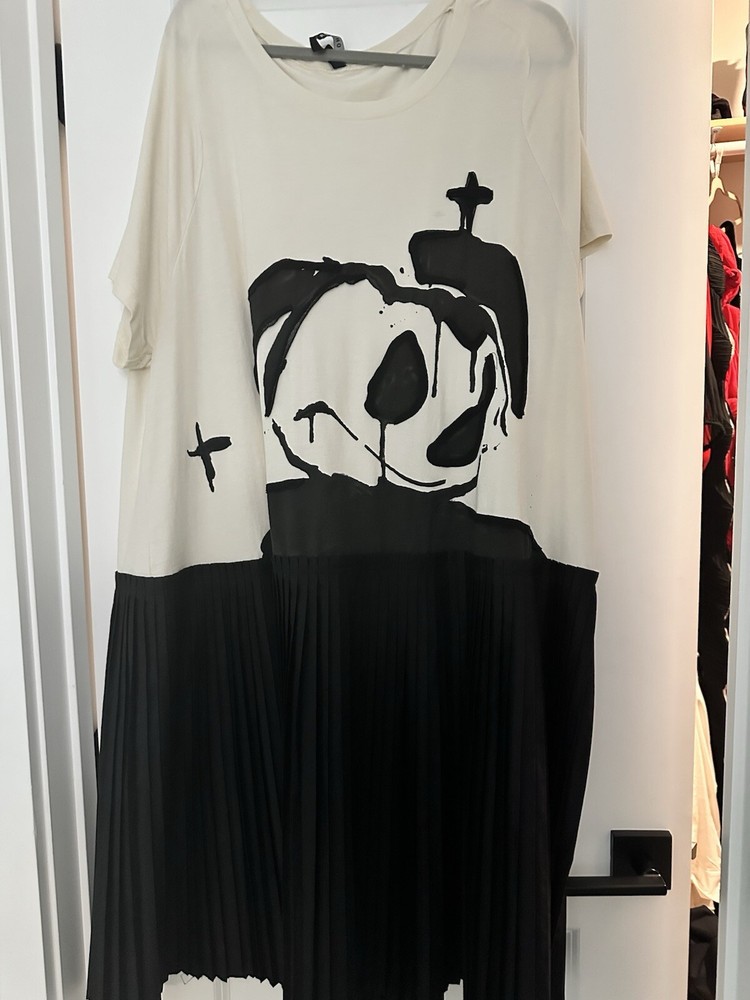 This Rundholz Dip M Oversized Panda Hand Painted Dress is a stunning addition to any wardrobe. The cream and black color combination makes it versatile for any occasion. The dress is made with high-quality materials, ensuring comfort and durability. The oversized style and midi length make it perfect for women who want to make a statement. The tee shirt/cotton style and brand name are trends that are becoming increasingly popular. This dress is perfect for anyone who wants to add a touch of style to their wardrobe. The panda has a netting for a 3-D effect. The pleated skirt is cotton. I put this on one time never put it on again so it is basically brand new.