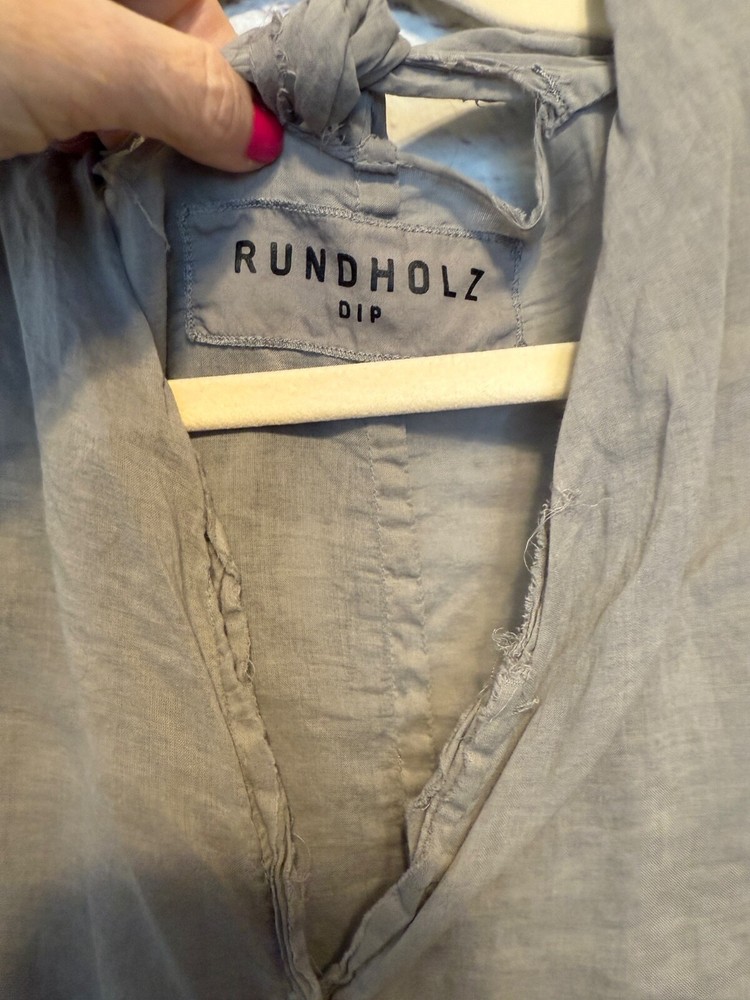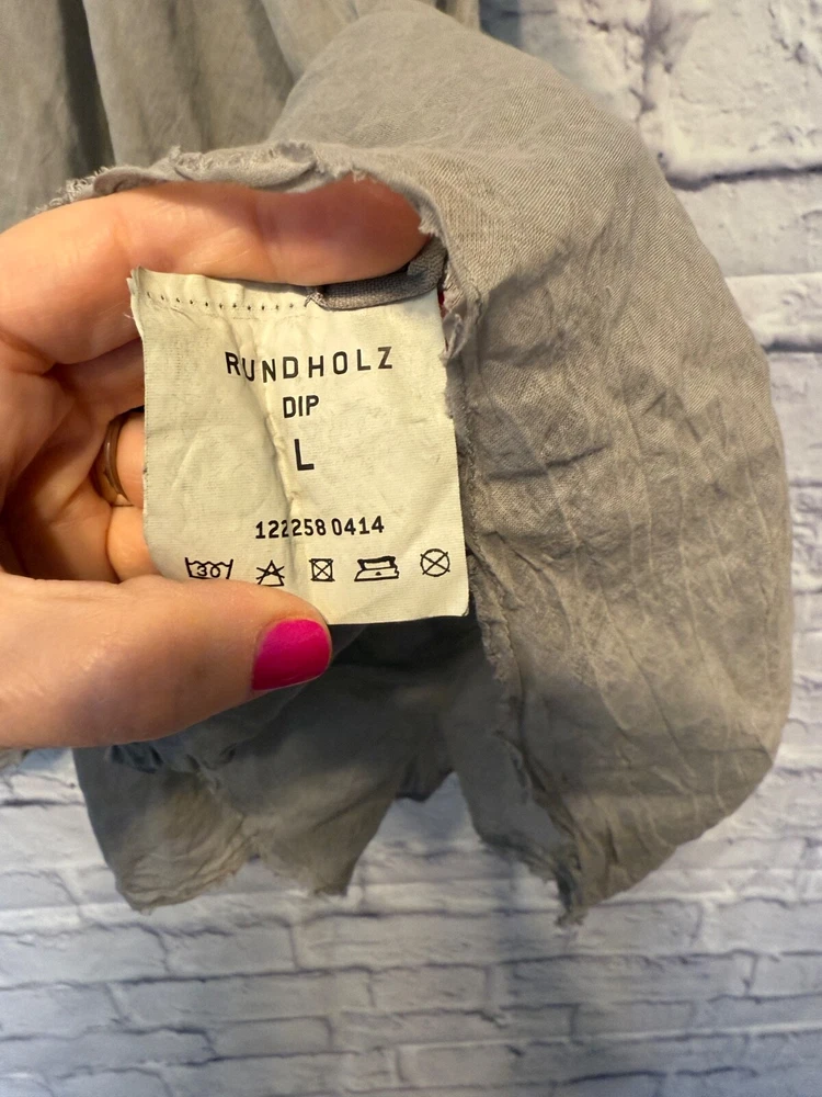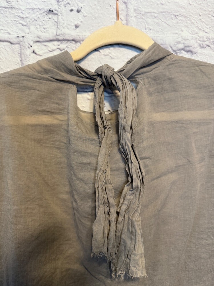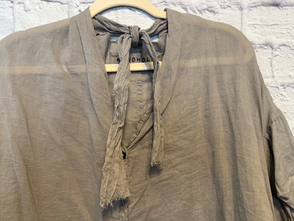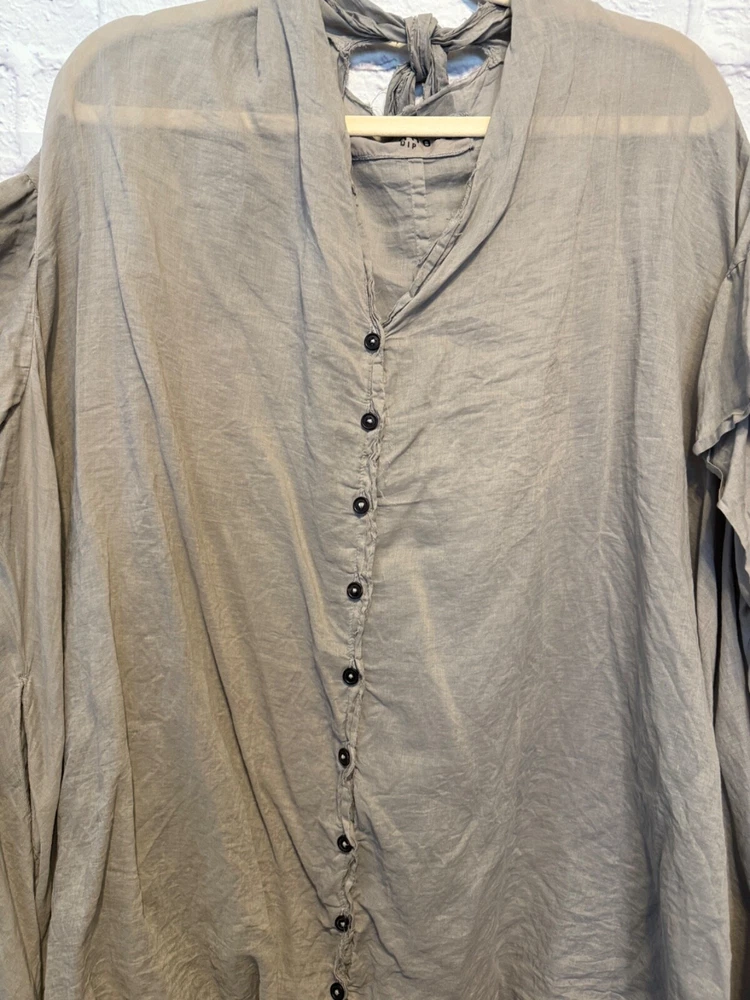 Rundholz Dip Breezy and Summery Gray Blouse, Large or Plus size with an accent on the rear collar which can be tied into a bow or knot or however you'd like to wear it. Fits up to a 2X Wear with jeans, a pencil skirt, leggings or whatever you'd like! It's a little sheer but it depends on your comfort level as far as if you'd wear anything underneath. But, it's beautiful and unique! And there's one panel on the right side as you wear it. Snap it up! No returns May be sent in recycled packaging Ask any and all questions before purchasing
