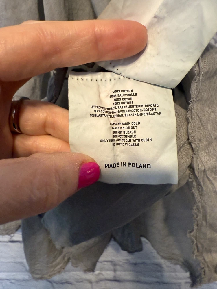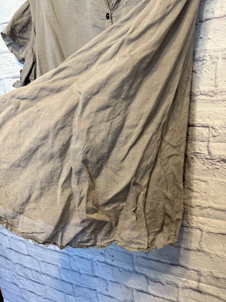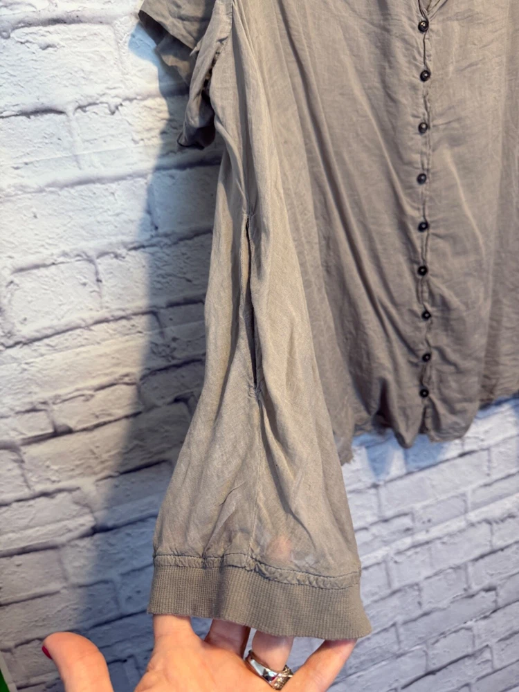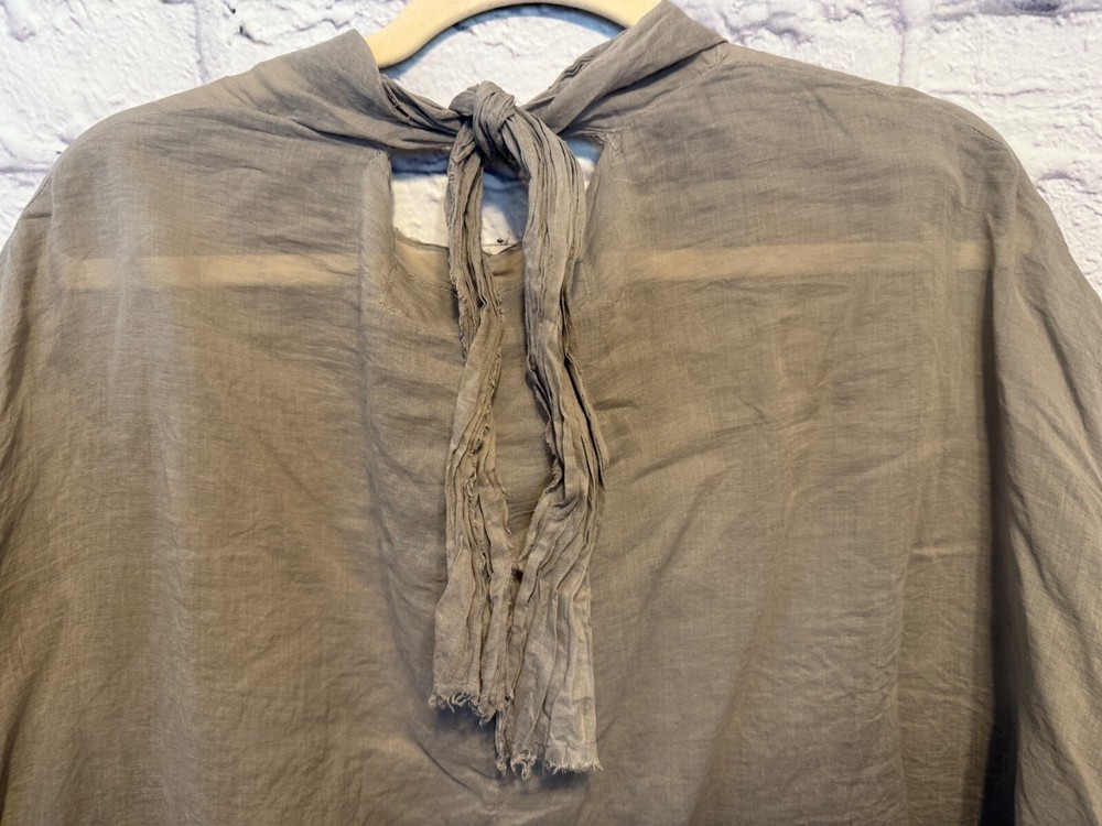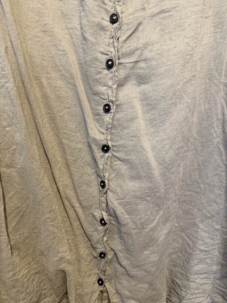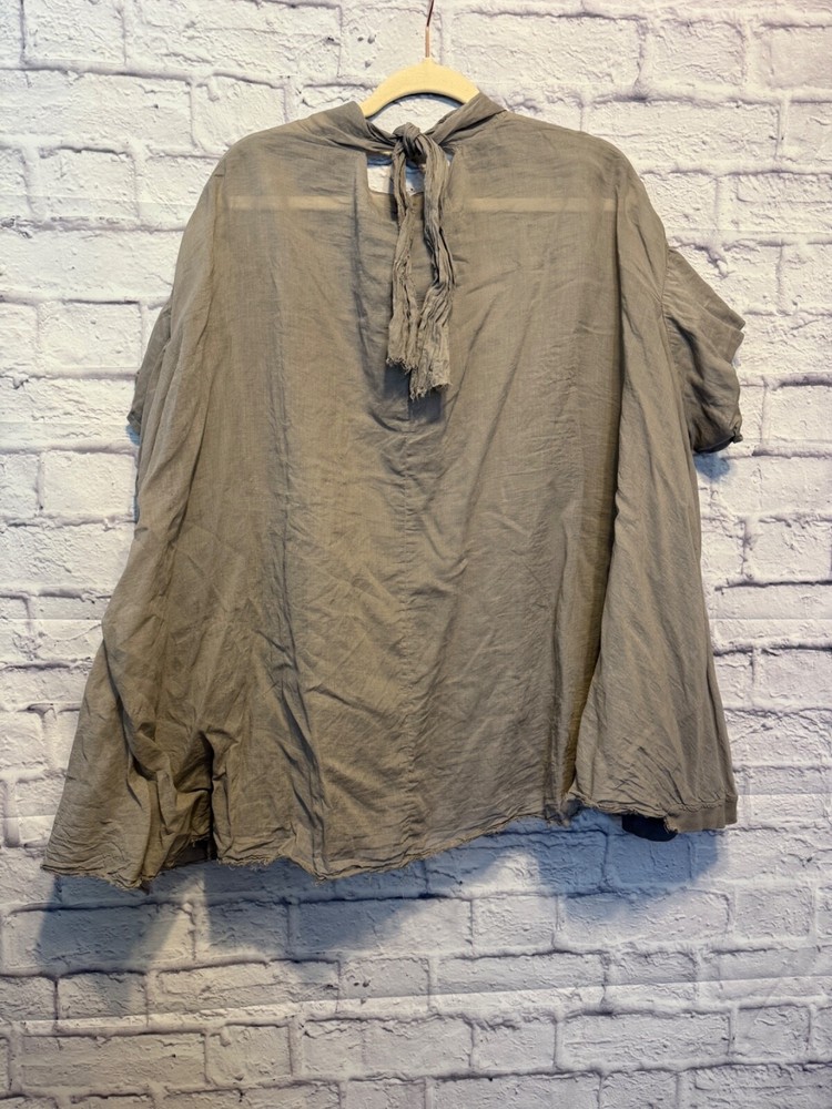 Rundholz Dip Breezy and Summery Gray Blouse, Large or Plus size with an accent on the rear collar which can be tied into a bow or knot or however you'd like to wear it. Fits up to a 2X Wear with jeans, a pencil skirt, leggings or whatever you'd like! It's a little sheer but it depends on your comfort level as far as if you'd wear anything underneath. But, it's beautiful and unique! And there's one panel on the right side as you wear it. Snap it up! No returns May be sent in recycled packaging Ask any and all questions before purchasing