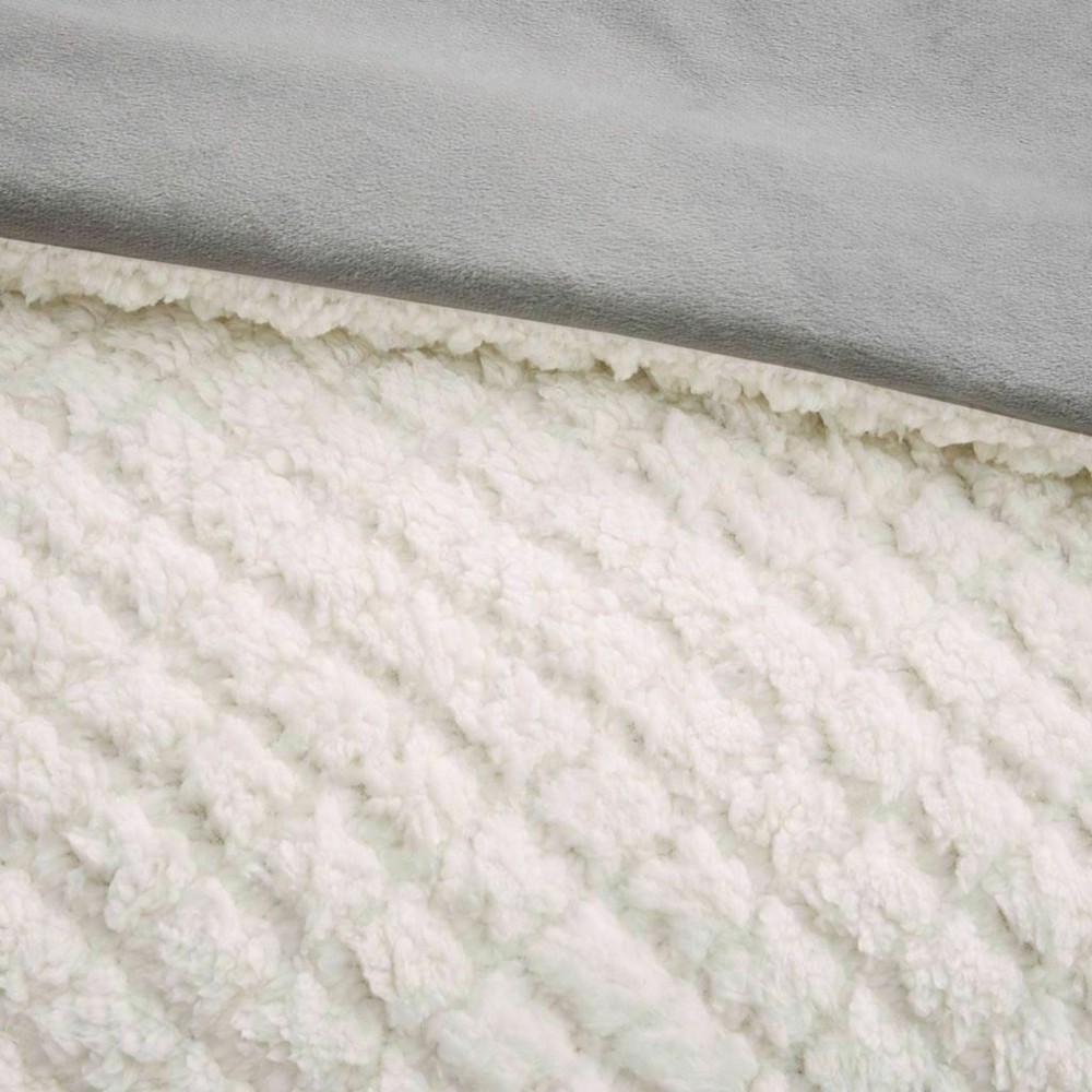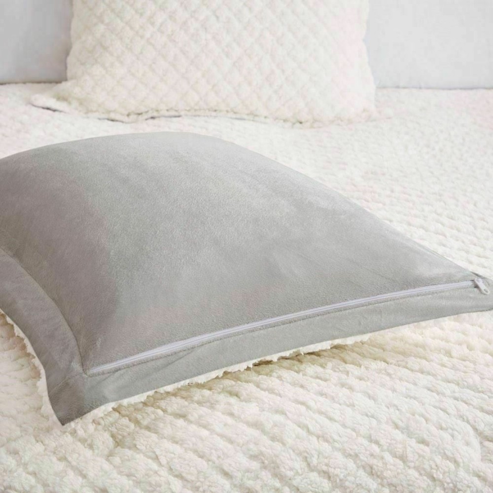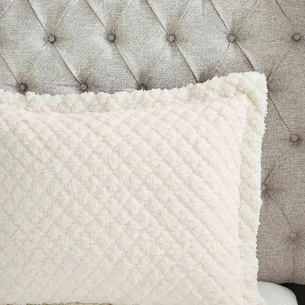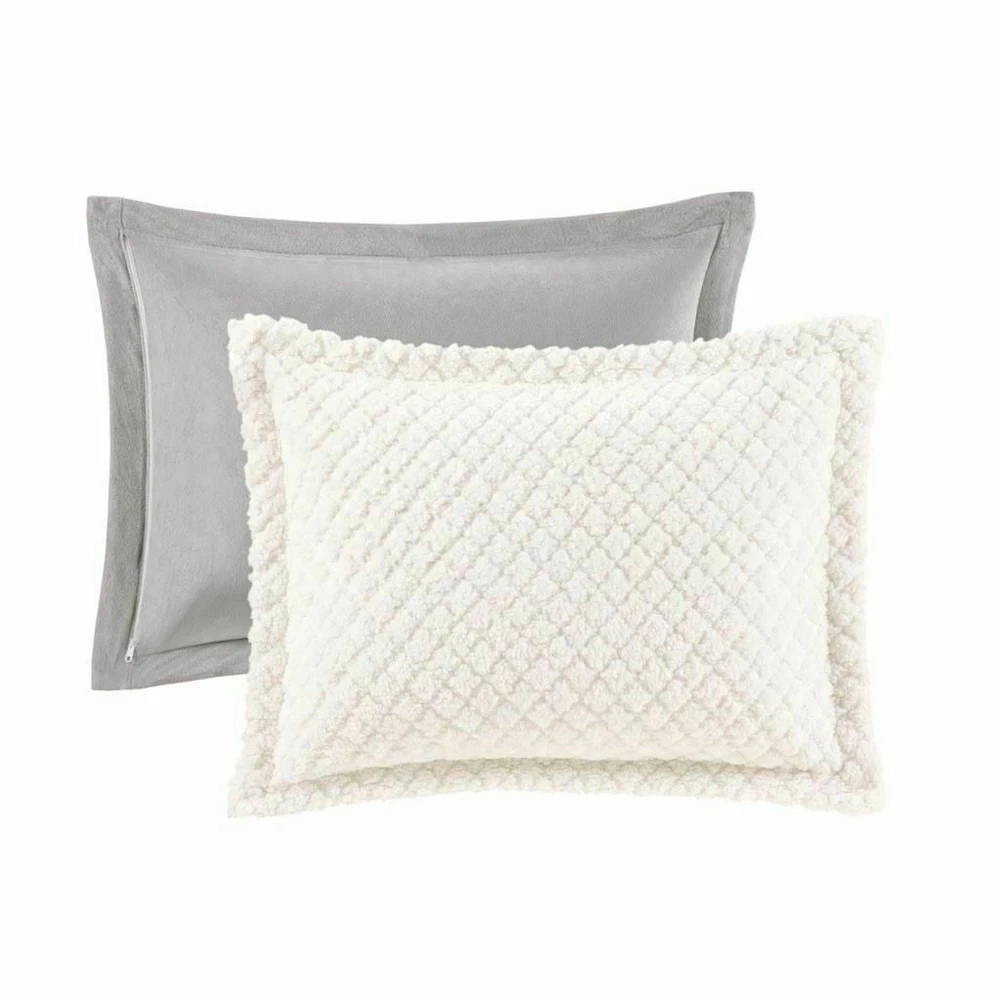 Sleep in pure comfort with the Madison Park Adler Reversible Textured Sherpa & Faux Mink Comforter Set. The cozy comforter features an embossed ivory sherpa fabric on the face with a soft grey faux mink on the reverse, creating incredible warmth and soft textured feel. The matching shams (1 for Twin Sizes) mirror the design of the comforter and have zipper closures to easily secure your pillows. Hypoallergenic polyester filling inside the comforter provides exceptional warmth and comfort. Machine washable for easy care, this reversible comforter set brings the perfect amount of cozy comfort and style to your bedroom decor. Full/Queen 1 Comforter 90"W x 90"L 2 Standard Shams 20"W x 26"L + 2"D (2) • Warm and cozy textured sherpa and faux mink comforter set • Embossed sherpa pattern on one side, soft faux mink on the other side • Set includes comforter, 2 shams (1 in Twin/Twin XL) • Hypoallergenic polyester filling in the comforter • Zipper closure on sham(s) • Machine washable for easy care Comforter: Pinsonic Sherpa to Solid Faux Mink, Poly Fiber Filling Sham: Pinsonic Sherpa to Solid Faux mink Comforter and Sham: Machine Wash; Pillow: Spot Clean