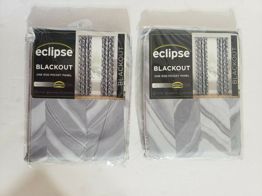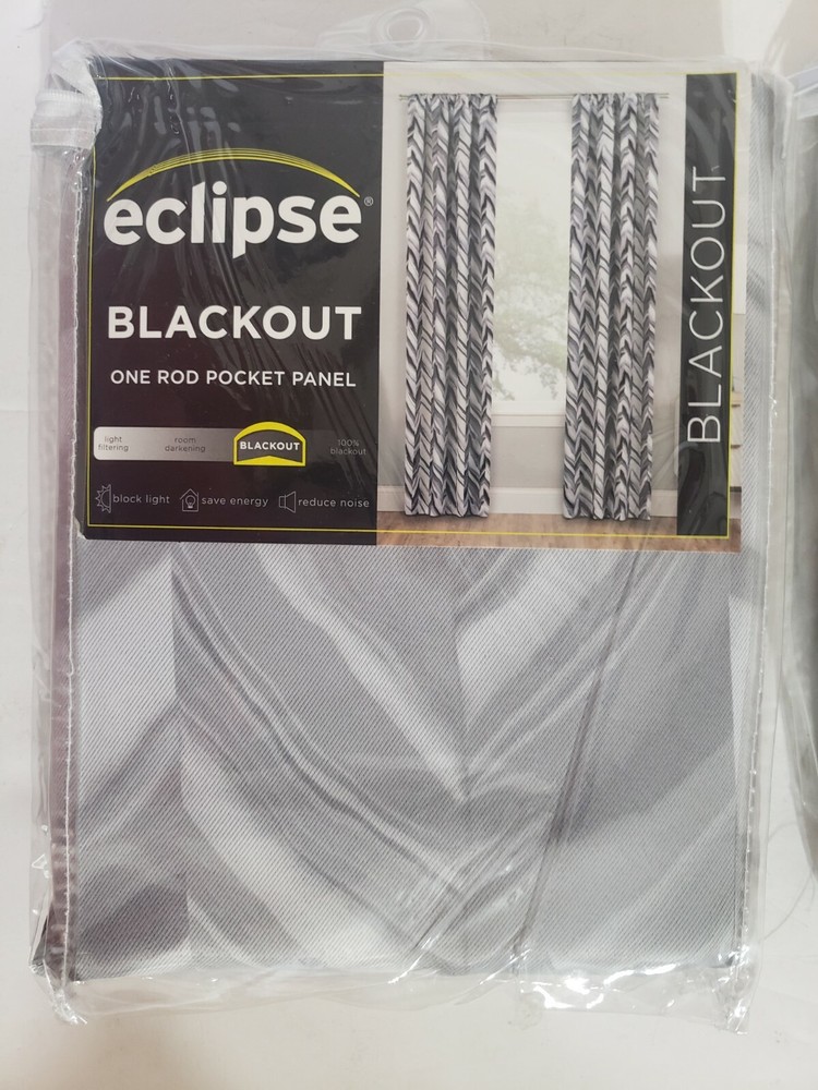 WE DO NOT SHIP TO P.O. BOXES. PLEASE PROVIDE A PHYSICAL MAILING ADDRESS. NEW. NEVER USED Item will be shipped free by USPS Priority Mail/UPS within 48 Lower States (NO SHIPPING for Alaska, Hawaii or Puerto Rico) THIS IS A SET OF 2 PANELS Find the perfect combination of fashion and function with the Eclipse Haley Blackout Window Curtain. Eclipse offers a complete line of functional curtains that provide privacy, manage light, reduce noise, and help with energy savings, without sacrificing the latest looks in window fashion. These beautiful panels offer light blocking benefits and feature a bohemian tie-dye chevron print. Blackout yarns are intricately woven into the panel giving it a rich hand and luxurious drapability. Each panel measures 37 inches wide in your choice of 63, 84 or 95 inches long. 3 inch rod pocket is recommended with up to a 1.5 inch rod for maximum movement. Curtain rod sold separately. 100% Polyester, unlined panel. Machine washable. Sold as a single panel Soft, drape able fabric 3 inch rod pocket is recommended with up to a 1.5 inch rod 100% Polyester Machine Washable