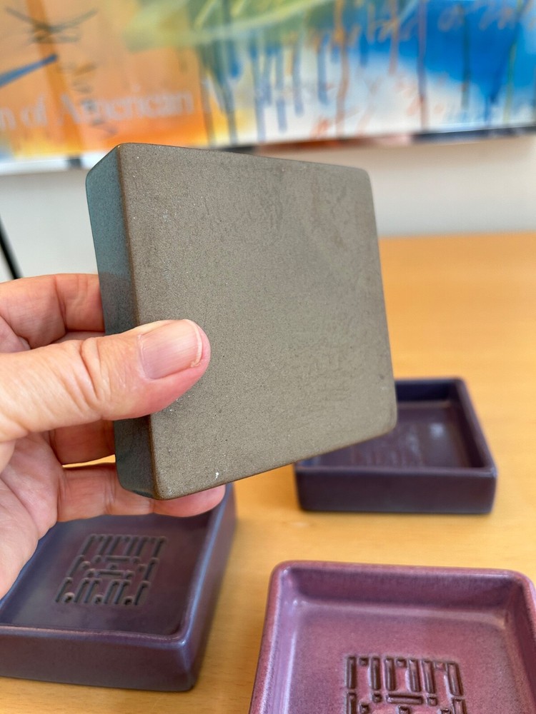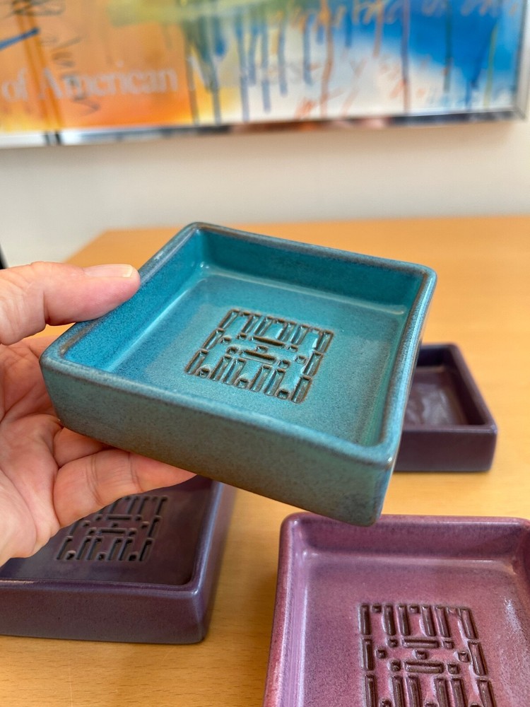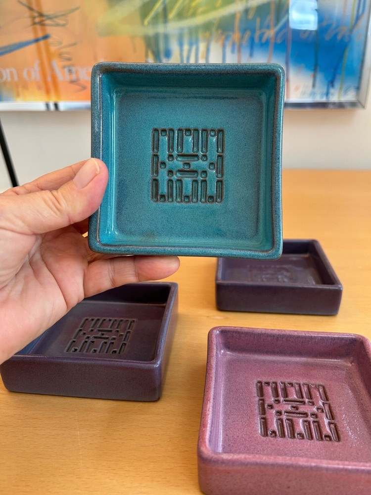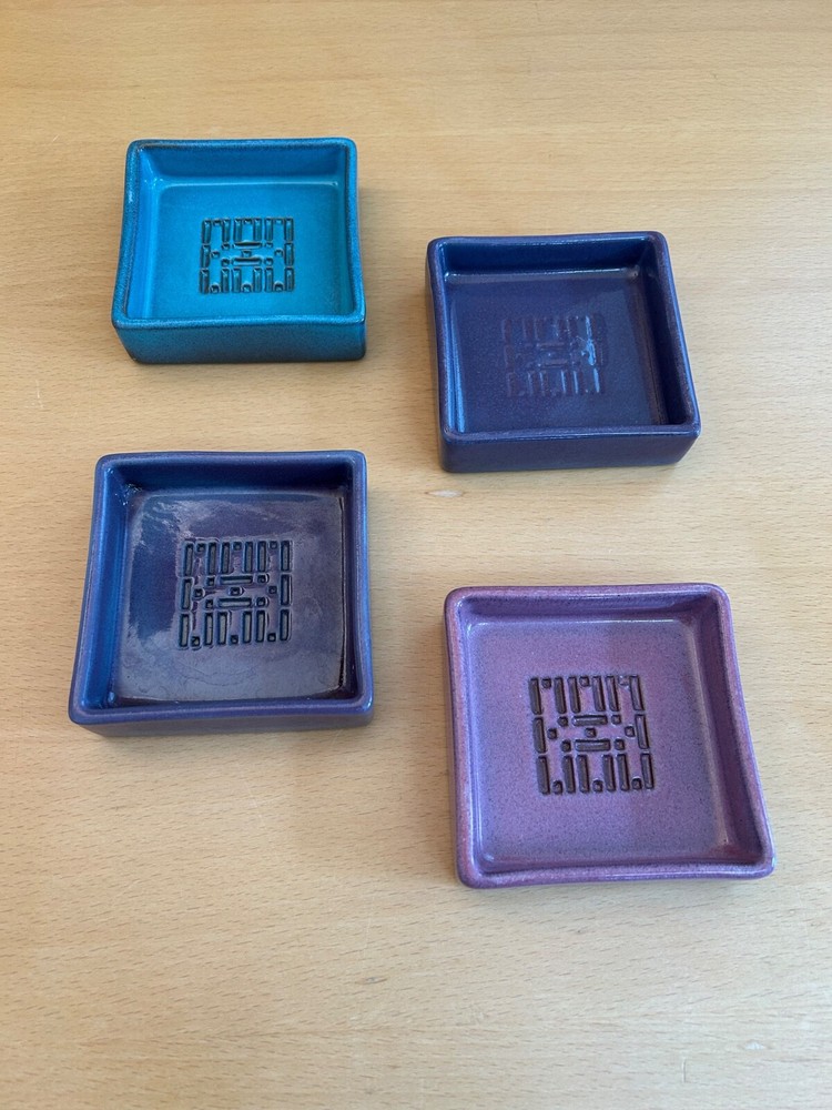 Elevate your entertaining game with this SET of 4 Ceramic Condiment Snack Trays. Crafted with care by studio potters, each piece in this collection boasts a unique glazed color palette and a contemporary square shape that complements any table setting. Made from high-quality ceramic, stoneware, and clay, these ramekins exude a rustic yet sophisticated charm, perfect for serving appetizers, dips, and small bites. With a production style that leans towards art pottery, these trays are not just functional serving pieces but also statement items that add character to your home. Whether hosting a chic dinner party or a casual get-together, these ceramic pottery studio crafted ramekins are versatile enough to serve a variety of dishes and will undoubtedly impress your guests. Dimensions: 3.75" x 3.75" x 1" Beautiful unique glazes with a special dot and dash design! Made by hand so some very minor size and glaze imperfections - see photos. No chips nicks or use marks. All appear unused.