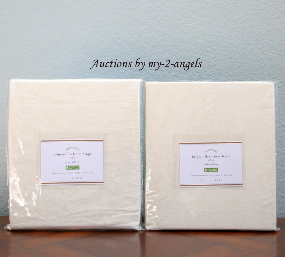 NEW POTTERY BARN CLASSIC BELGIAN FLAX LINEN CURTAINS WITH COTTON LINING, 50" X 96" L, IVORY, SET OF TWO - The curtains are **BRAND NEW IN PACKAGES**. Crisp linen adds soft texture and a classic look to your windows. Our linen drape is woven from the finest Belgian flax fibers and gently filters sunlight. Made of 100% Belgian flax linen. Our drape’s 3-in-1 construction offers three hanging options: pole pocket, hanging loops, ring top. Fabric features enzyme wash. 175 gsm. Drapery hooks included; Round Rings and Clip Rings sold separately (not included). Use with 10 Clips or Round Rings. Dry-clean. 50" wide by 96" long. From our smoke-free, pet-free home. Please click the Read More link or Item Description link for more details NEW POTTERY BARN CLASSIC BELGIAN FLAX LINEN CURTAINS WITH COTTON LINING, 50" X 96" L, IVORY, SET OF TWO You are bidding on a SET OF TWO , Classic Belgian Flax Linen Curtains With Cotton Lining, in IVORY color, from Pottery Barn. The curtains are BRAND NEW IN PACKAGES . These beautiful panels each measures approximately 50 inches wide by 96 inches long. Crisp linen adds soft texture and a classic look to your windows. Our linen drape is woven from the finest Belgian flax fibers and gently filters sunlight. Made of 100% Belgian flax linen. Our drape’s 3-in-1 construction offers three hanging options: pole pocket, hanging loops, ring top. Sold as individual panels. Fabric features enzyme wash. 175 gsm. Drapery hooks included; Round Rings and Clip Rings sold separately (not included). Use with 10 Clips or Round Rings. Dry-clean. Dimensions 50" wide x 96" long Side Hem: 1" wide Bottom Hem: 4" high Pole Pocket: 3" high Note: Length includes height of pole pocket. Care and Maintenance Dry-clean only. Buyer pays shipping to a physical address within the continental United States. Please email us for a shipping quote for shipping to PO Boxes, APO/FPO Boxes, Alaska, or Hawaii. Texas residents add 8.25% sales tax. We accept credit card and electronic check payments through Paypal. Thanks for viewing our auction! Terms and Conditions: We are not affiliated with Williams-Sonoma, or its affiliates. Although we guarantee that all our items are authentic, they are not warranted by the manufacturer and cannot be returned, exchanged or refunded by Pottery Barn. For Paypal users, we ship only to the confirmed address. Please read the description carefully to make sure that you understand what are being auctioned. The picture(s) might include other items, but only the item(s) stated in the description are included in the auction. Unless you have made arrangements with us prior to bidding, we do not ship to P.O. Boxes, APO Boxes, Alaska, or Hawaii. Please ask all questions, including shipping terms, prior to bidding. No returns on seasonal or holiday items. PayPal—eBay's service to make fast, easy, and secure payments for your eBay purchases!