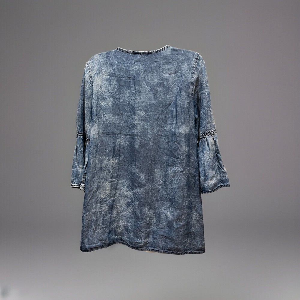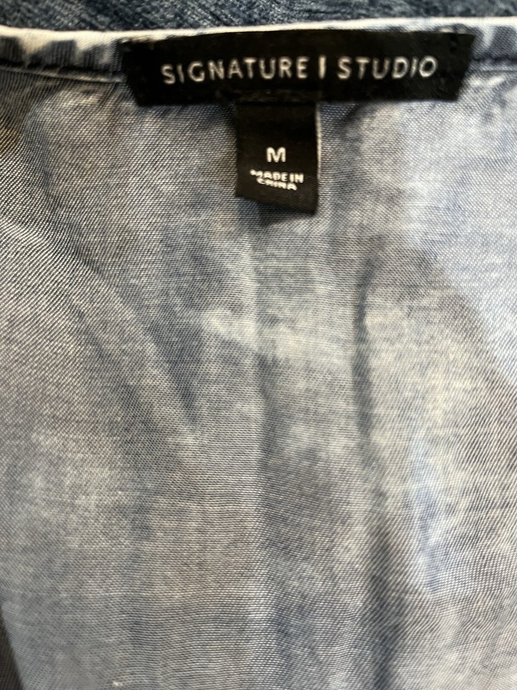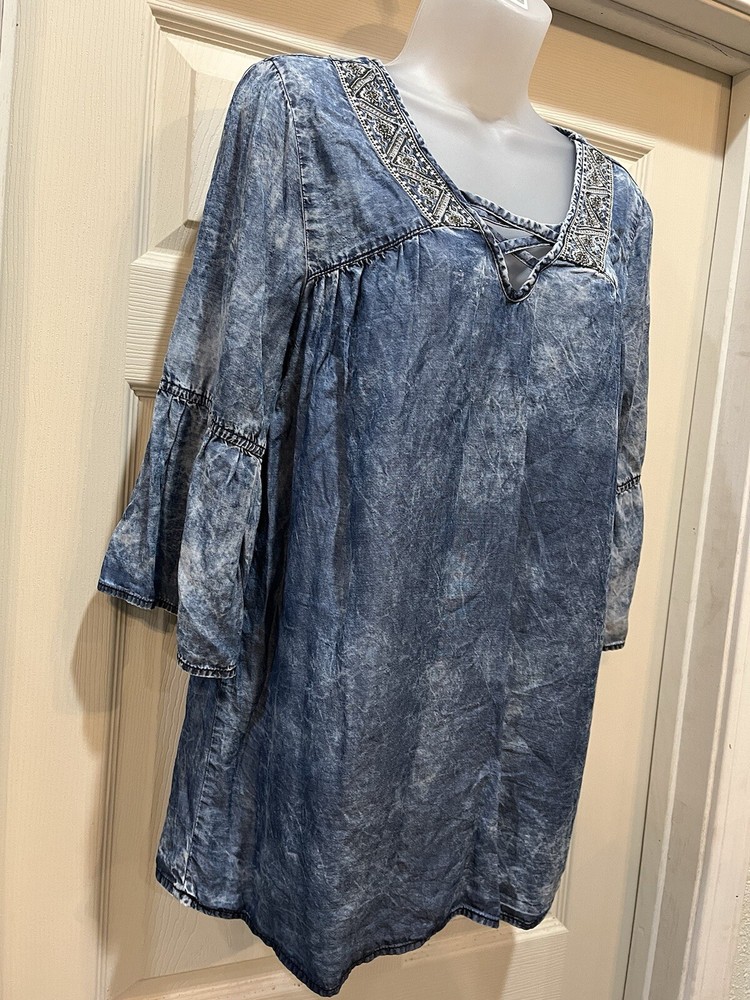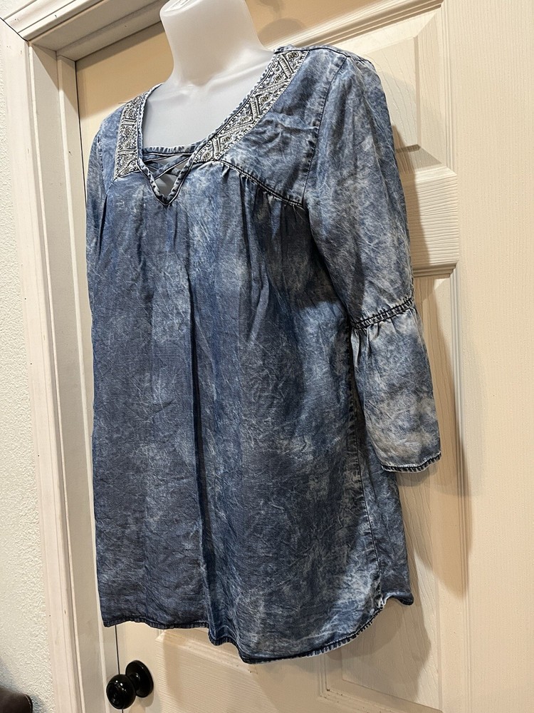 Elevate your casual style with this stunning Signature 1 Studio top. The denim-like fabric and blue color give it a trendy edge, while the long ruffled sleeves and crisscross neckline add a touch of femininity. The pullover closure and machine washable garment care make it easy to wear and maintain. Perfect for summer, fall, and spring, this tunic-style blouse is a versatile addition to any wardrobe. Made from 100% Lyocell and featuring embroidered accents, this top is a must-have for any fashion-forward woman. The relaxed fit and bell sleeve type make it comfortable and easy to wear, while the solid pattern and denim fabric type give it a unique edge. Whether you're dressing it up or down, this top is sure to make a statement.