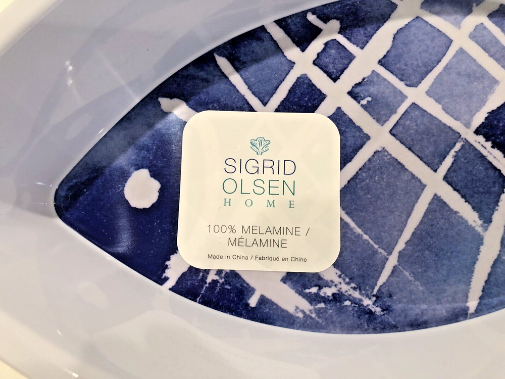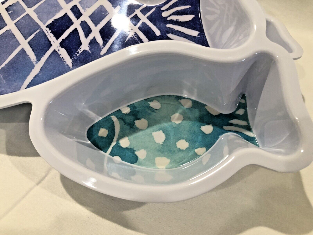 SIGRID OLSEN MELAMINE School of Fish 15” divided chip/dip bowl Large Tray NEW This SIGRID OLSEN MELAMINE School of Fish (15” divided chip/dip bowl) Large Tray is perfect for any occasion. The colorful and glossy finish of this fish platter is sure to impress your guests. The tray features a unique shape of fish and is made of durable melamine material. This platter is ideal for serving chips or dips and is perfect for all occasions. The 15” divided chip/dip bowl is a great addition to your dinnerware and serveware collection. This product is made in China and is perfect for anyone who loves sea life.
