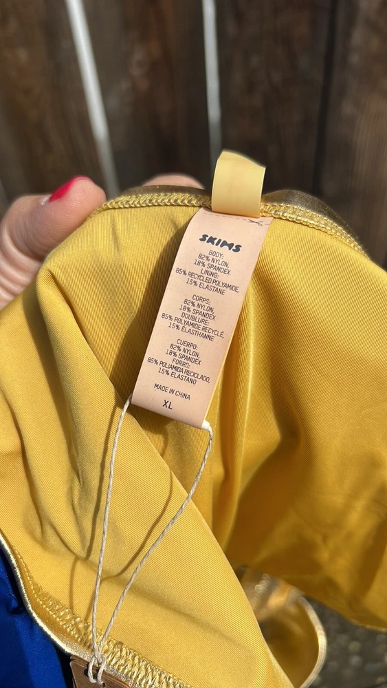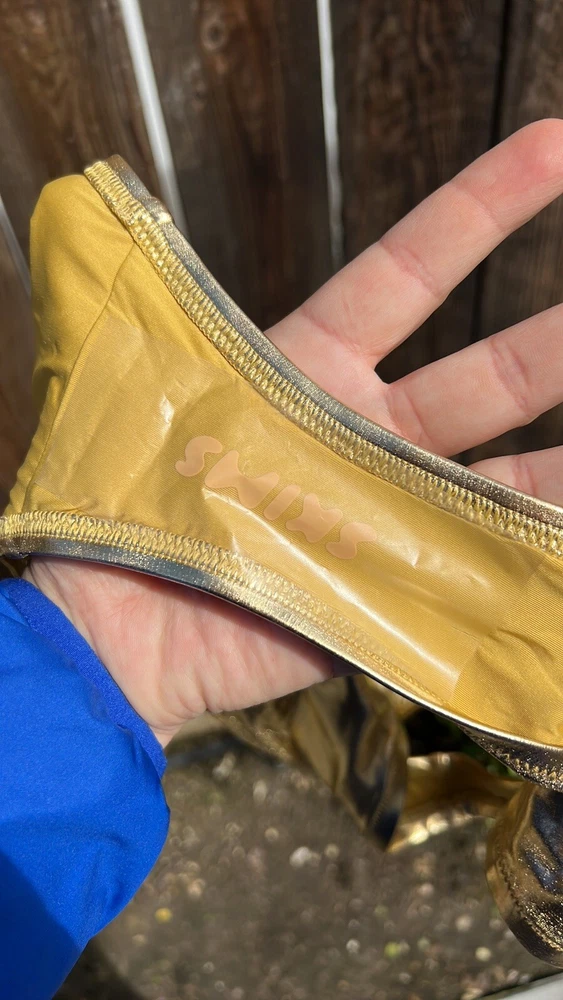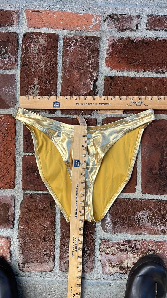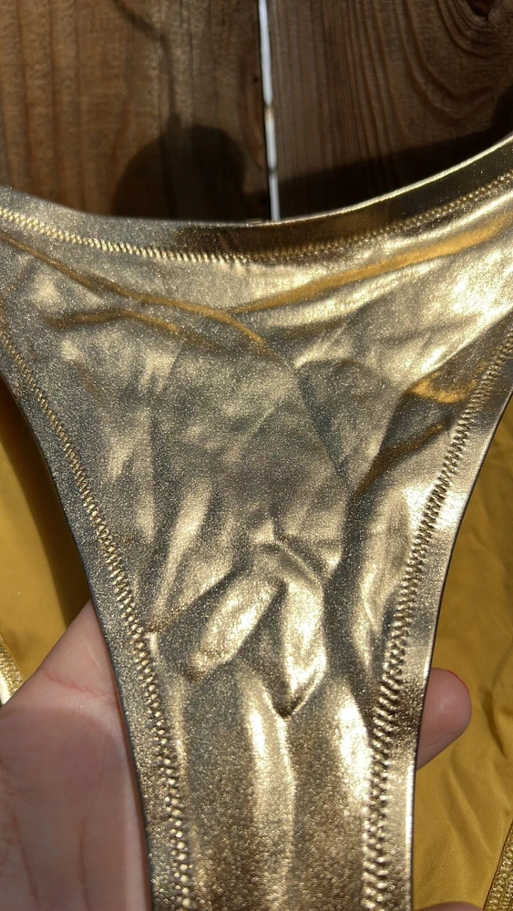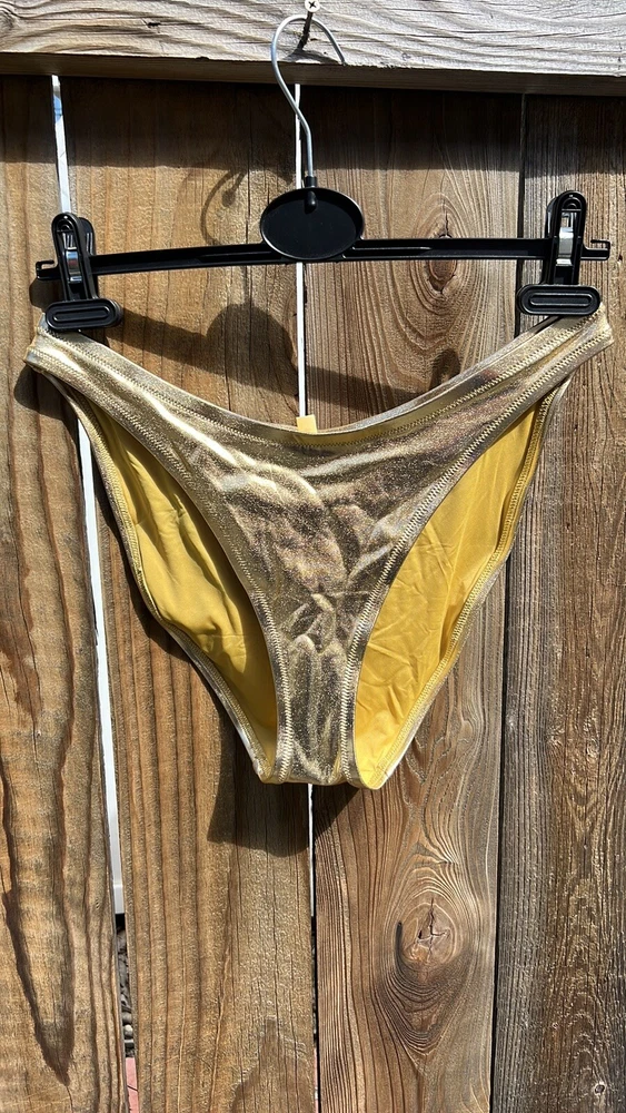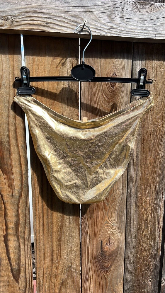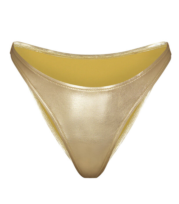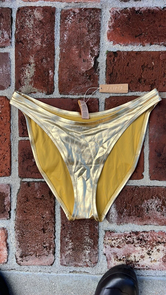 SKIMS METALLIC SWIM DIPPED MID WAIST BOTTOMS. Color :Gold. SOLD OUT ON WEBSITE. You’ll have legs for days in this high-cut, classic bikini bottom. With a dipped front and fuller back coverage, this style pairs perfectly with the Mock Neck Swim Tank, Triangle Top, or Bandeau. Fits true to size