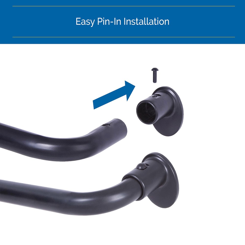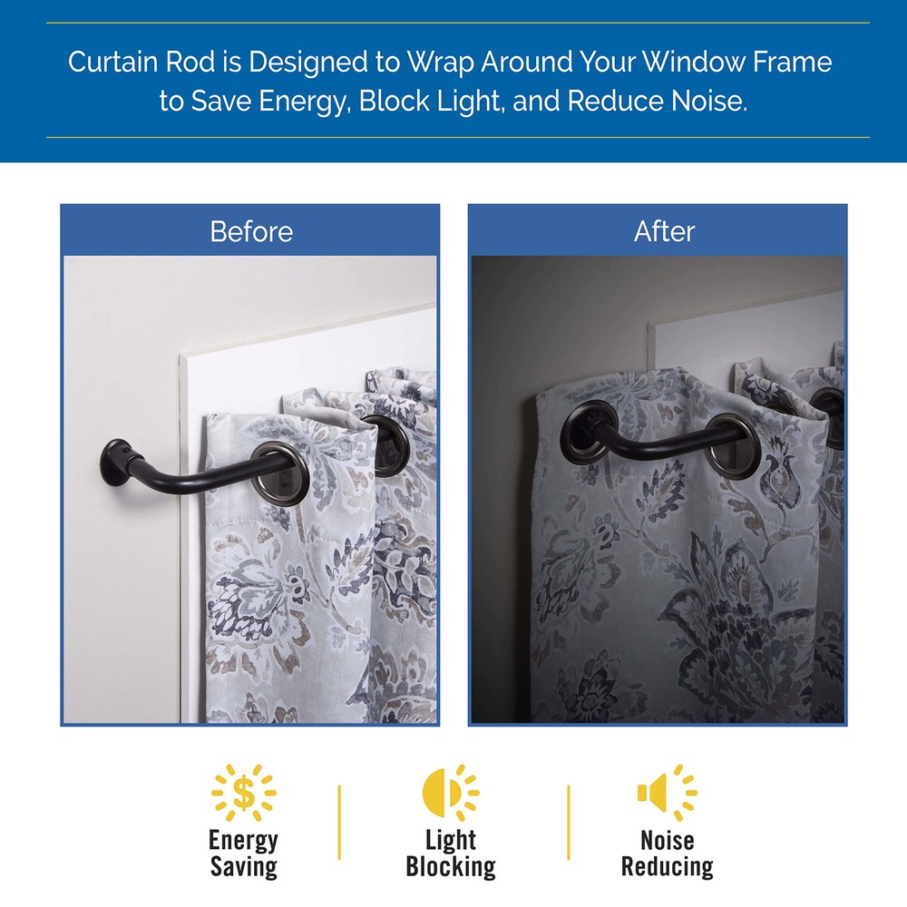 Product Description The 5/8" Wrap Around Blackout Curtain Rod is designed to wrap around your window frame to save energy, block light, and reduce noise. The black finished steel telescoping rod adjusts from 28 inches to 48 inches in length to fit a variety of window sizes and projects 3.125 inches from the wall. New and improved stronger metal brackets install quickly and easily while concealing the mounting screws and hardware. Use in your kitchen, bedroom, dining room, or living room to hang light to medium weight curtains. It is ideal for hanging curtains with grommets, back tabs, or pockets, but can also be used with tab tops or clip rings. Pair with curtain panels (sold separately) to maximize energy saving, light blocking, and noise reducing features. Room Darkening Rod Set Includes: telescoping steel curtain rod, metal mounting brackets with pins, screws, drywall anchors, and installation instructions. Set Contains: Wrap Around Curtain Rod and Mounting Hardware The 5/8" Wrap Around Blackout Curtain Rod is designed to wrap around your window frame to save energy, block light, and reduce noise The telescoping rod is adjustable in length from 28-48" to fit your window and projects 3.125" from the wall The 5/8" diameter rod is suited for your kitchen, bedroom, dining room, or living room Pair with curtain panels (sold separately) to maximize energy saving, light blocking, and noise reducing features Includes: telescoping curtain rod, metal mounting brackets with pins, screws, drywall anchors, and installation instructions