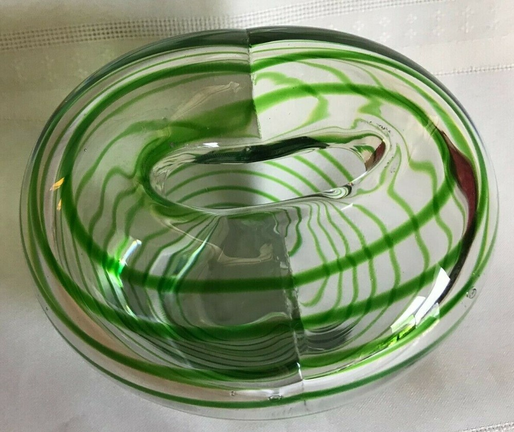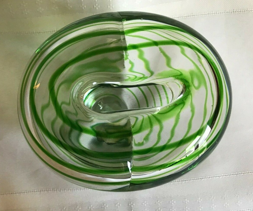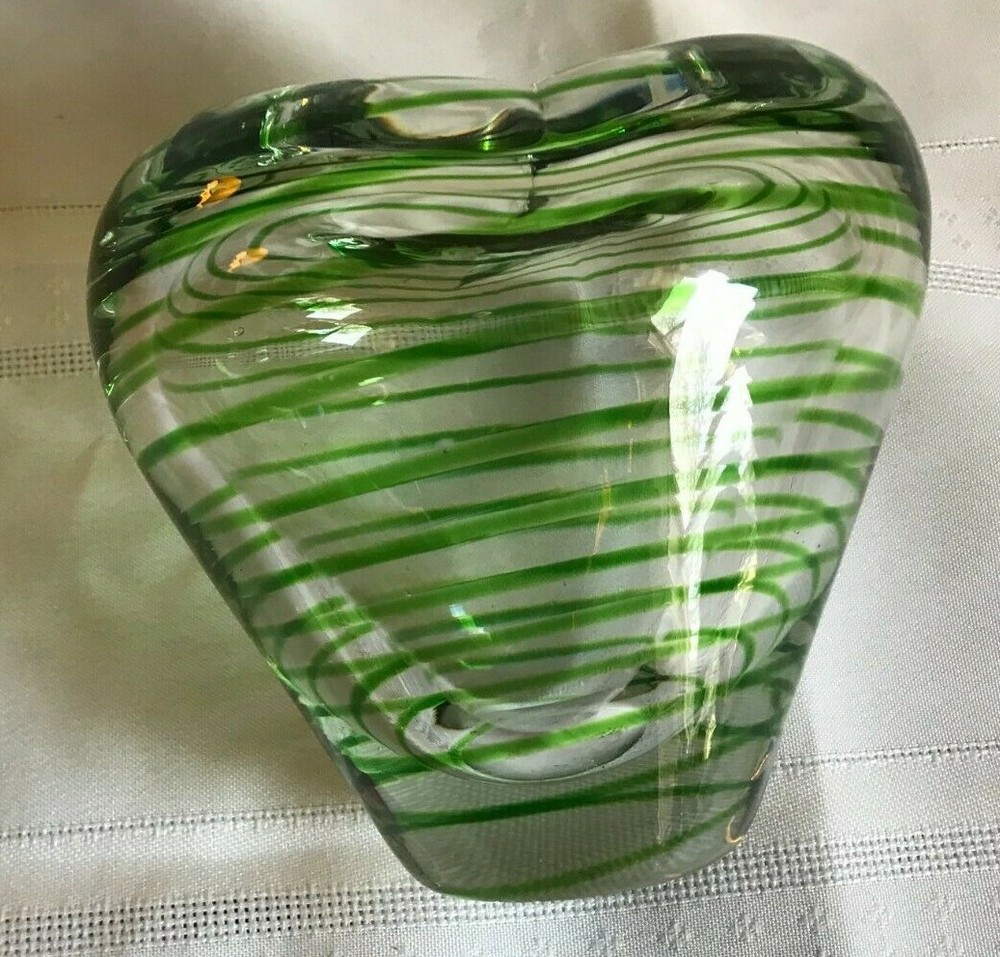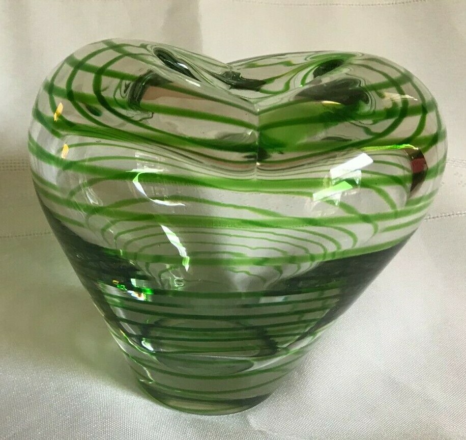 Like New ~ Gently Displayed ~ STUDIO ART BLOWN GLASS ~ HEART SHAPED BUD VASE ~ CLEAR GLASS WITH GREEN STRIPES ~ Approximately 5" tall ~ No chips or cracks ~ Good Condition Inside and Out ~ See Photos ~ CHECK OUT MY OTHER BLOWN GLASS ITEMS ~ From a Smoke Free Home! I strive to give an accurate description of my items. Pictures are an accurate depiction of the item. Please REVIEW the description and pictures carefully. Please ask any questions before you purchase the item. Be sure to Add me to your FAVORITES List! CHECK OUT MY STORE! {11/2} 1+<**1.2.2.<**0.