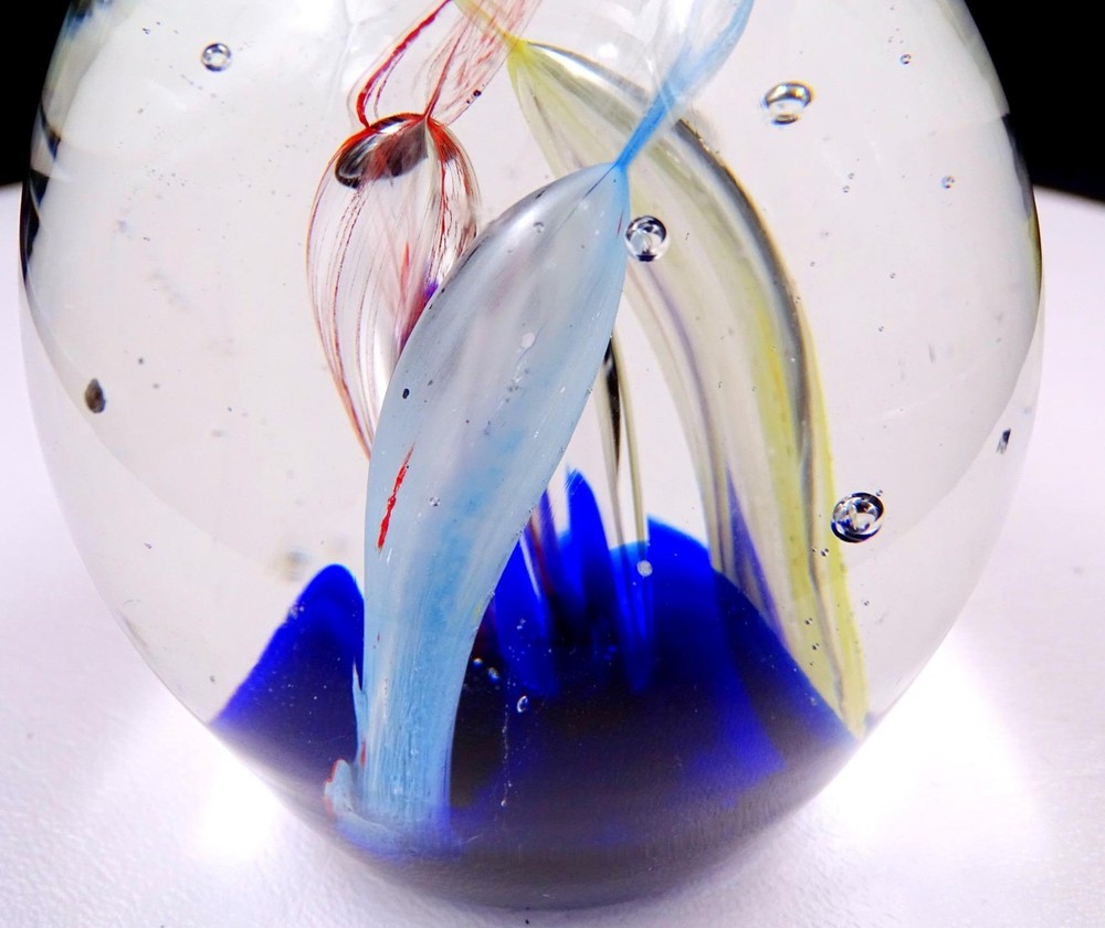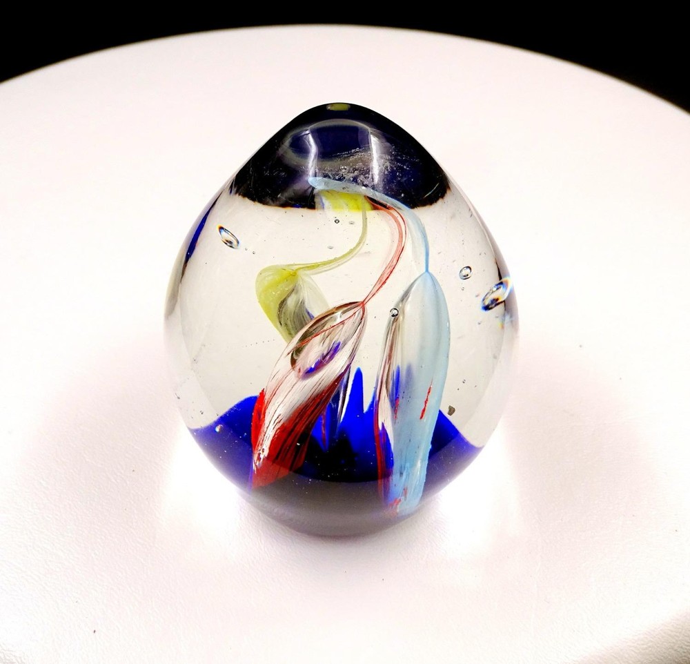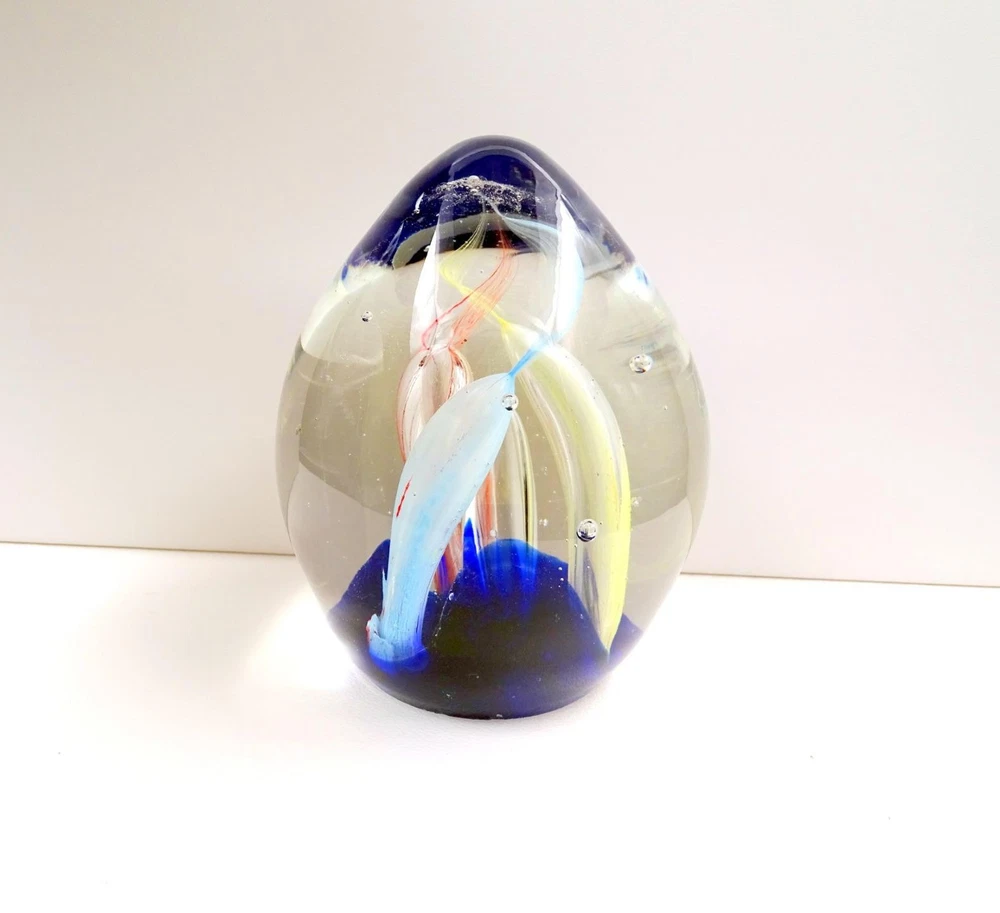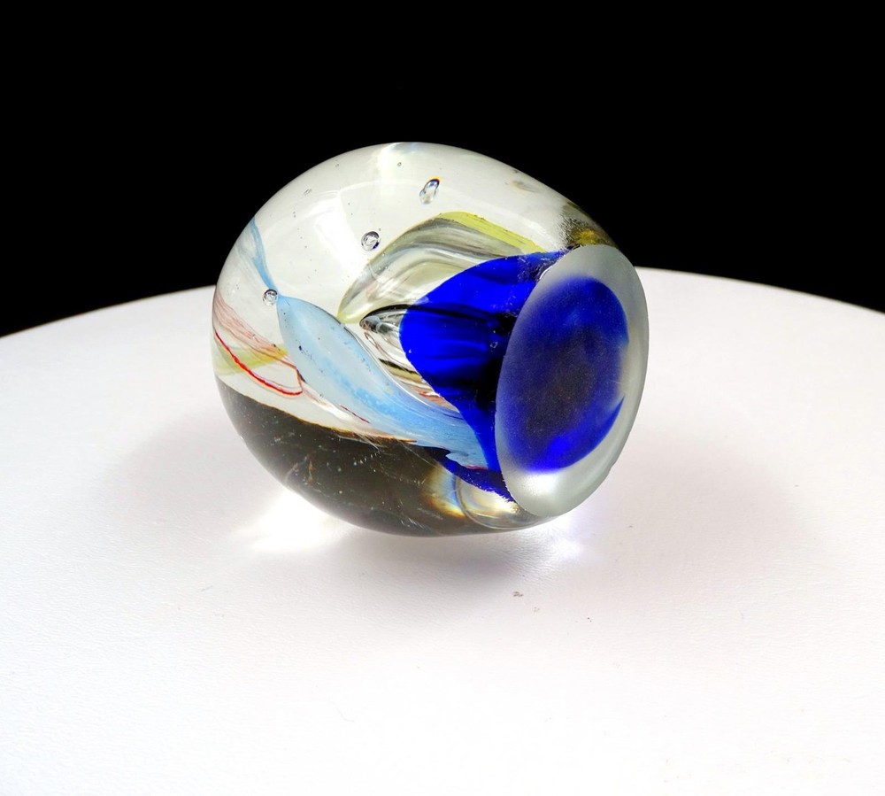 This stunning studio art glass paperweight is a true eye-catcher! The vibrant multi-colored tubes twist beautifully against the rich cobalt blue base, creating a mesmerizing effect. The egg shape feels elegant in hand, and despite minor fleabites (clearly shown in photos), it remains in excellent condition with no chips or cracks. Perfect for adding a pop of color to any desk or display shelf, it's both functional and artistic. The craftsmanship shines through, making it a unique conversation piece. Very happy with this gorgeous find!