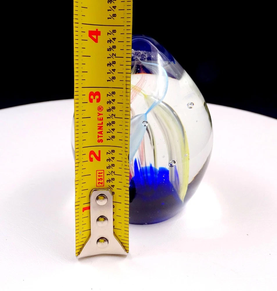 STUDIO ART GLASS MULTI COLORED TUBES EGG SHAPED 3 3/4" PAPERWEIGHT STUDIO ART GLASS MULTI COLORED TUBES EGG SHAPED 3 3/4" PAPERWEIGHT Click images to enlarge Description STUDIO ART GLASS MULTI COLORED TUBES BUBBLES EGG SHAPED 3 3/4" PAPERWEIGHT This one is in Excellent Condition with No Chips No Cracks. NOTE: there are a few small fleabite on the base and a ding on the side (SEE picture with pen). Very Nice Studio Art Glass paperweight. This is egg shaped with a cobalt blue base that has three colored tube bubble twisting upward. There is a clear tube bubble in the center of the colored bubbles. This measures 3 3/4" High x 3" Wide at widest point. I have provided a lot of pictures to best describe the condition of this paperweight. Be sure to scroll down, look left. THERE ARE MORE PICTURES that do not appear in the top gallery. (The pictures are of the exact piece you will receive). Photography Props & photo stands are not included. This one will have a VERY LOW BUY IT NOW PRICE OF JUST $74.95. Shipping should run around $15 TO $18 dollars depending on where your zip code is located. We are more than Happy to accommodate any shipping needs. Please email for International Shipping Rates. In most cases all orders are shipped in one to three days after payment is received, in rare cases with large orders please allow more time. This is a Quality Piece and will have a shipping weight of about 4 Lbs. We can easily combine shipping with other orders. If you have any questions feel free to email anytime, Thanks. CHECK OUT AND SHIPPING Please pay for purchases promptly within 3 days. We Ship five days a week Monday through Friday on all paid in full orders after Pay Pal releases funds. An E-Check can take up to 5 days to clear Pay Pal before we able to ship. If there are any questions, feel free to email anytime. OTHER PAYMENT OPTIONS We accept Pay Pal. For other payment arrangements, message or email us. RETURN POLICY If for some reason your order is not as you expected it to be. Just let us know. Maybe something was accidentally over looked. We will do what is right and fair to make sure you as a buyer are taken care of. We want every buyer to have a positive experience with us. We will give a full refund upon return of the item. Usually return shipping is not paid. If you need to get in touch use the eBay Email from your order. We monitor emails regularly and will reply to you as fast as possible. Pictures sell! Auctiva offers Free Image Hosting and Editing. 300+ Listing Templates! Auctiva gets you noticed! The complete eBay Selling Solution.