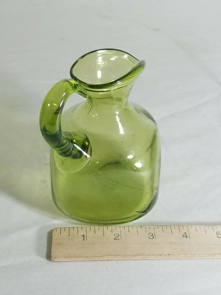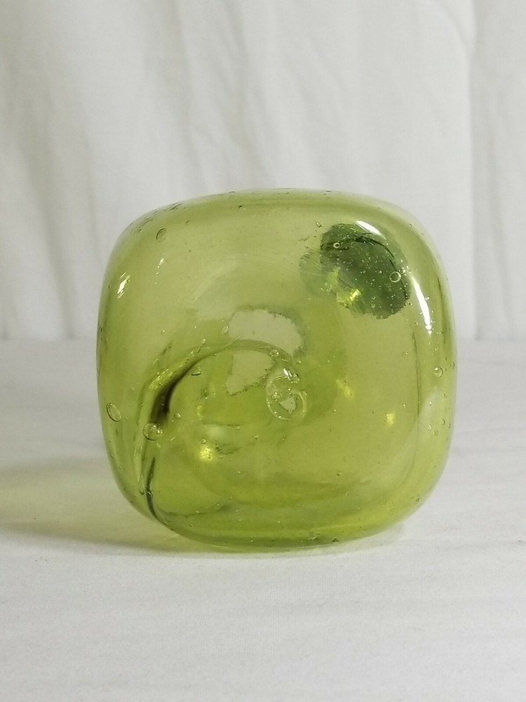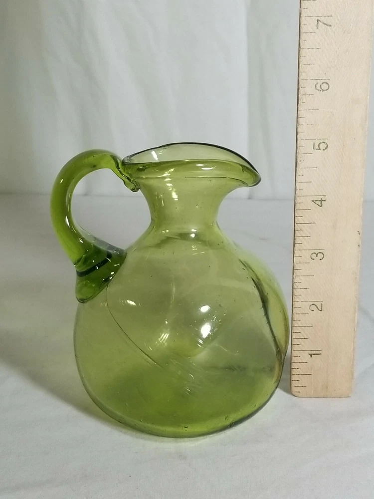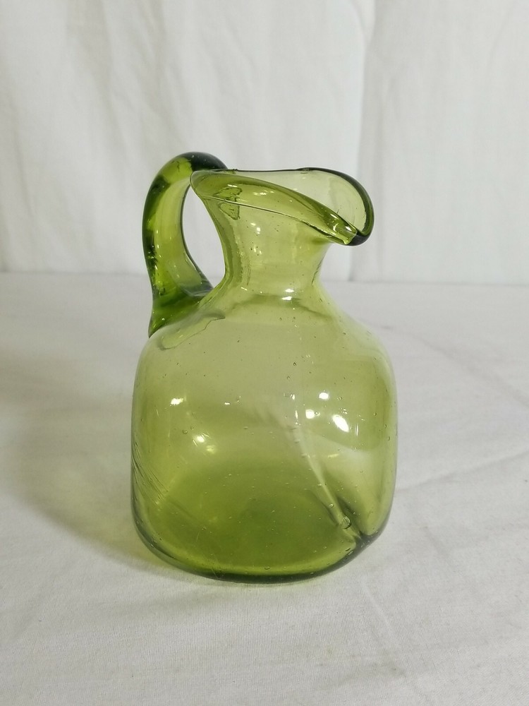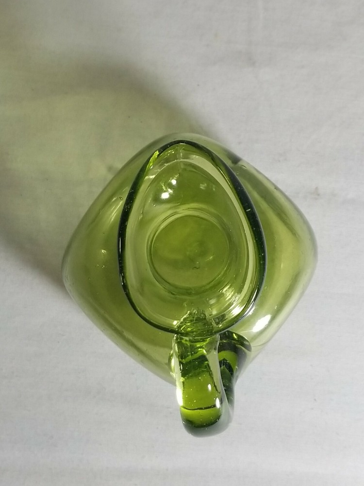 STUDIO BLOWN ART GLASS GREEN SQUARE PITCHER WITH CORNER LOOP HANDLE VASE. PRE OWNED ITEM WITH MINIMAL SIGNS OF PREVIOUS USE, BEST DESCRIBED BY PHOTOS PROVIDED. BE SURE TO BROWSE OUR OTHER LISTINGS, WE DO COMBINE SHIPPING!! DON'T FORGET TO ADD US TO YOUR FOLLOWED SELLERS, WE ARE ADDING NEW ITEMS DAILY!!