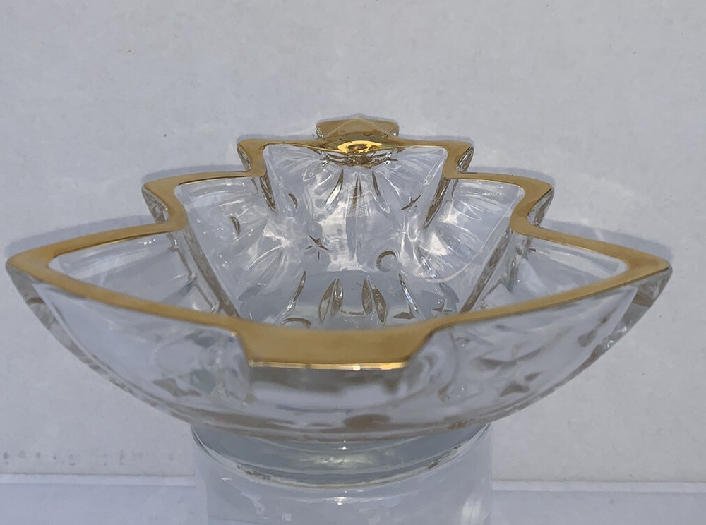 STUDIO NOVA GOLD RIMMED CHRISTMAS TREE SHAPED CRYSTAL CANDY SERVING DISH BOWL 6” x 5.5" x 1-3/4" NEW. Never used. No original box. I combine shipping. I leave feedback as soon as transaction had been completed and feedback is left for me after item had been received and inspected. Items listed in my store are not new unless mentioned otherwise. There are mostly coming from estate sales. I always describe them in the detail especially if they have visible damage, missing parts or have something out of ordinary. Every item sold as is. Please inspect the picture attached, request additional pictures and ask as many questions as you need before buying. If you are unhappy with the transaction please contact me before leaving feedback. I hope you will enjoy things you got from my store. Thank you for shopping.