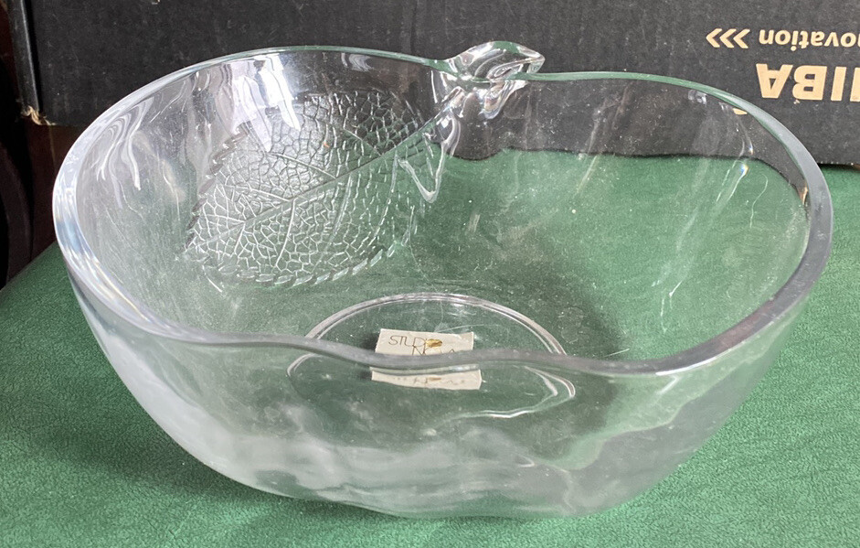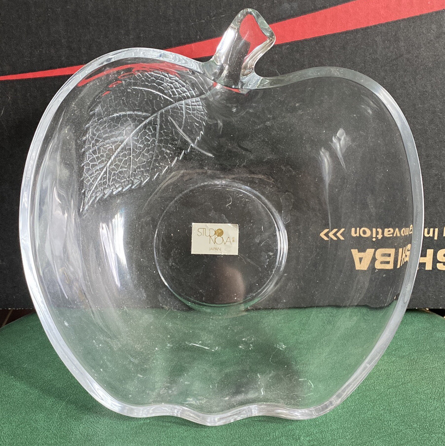 This stunning glass bowl from Studio Nova features a beautiful apple blossom pattern and a round shape with a diameter of 8.5\". The clear glass material and vintage style give it a unique charm, making it a perfect addition to any mid-century modern decor. The bowl has a depth of about 3\" and stands 3.75\" high, making it an ideal size for serving fruits, snacks, or as a centerpiece. The set includes one bowl, and it is an original piece from Japan, with no signs of wear and tear. Get your hands on this exquisite bowl today!