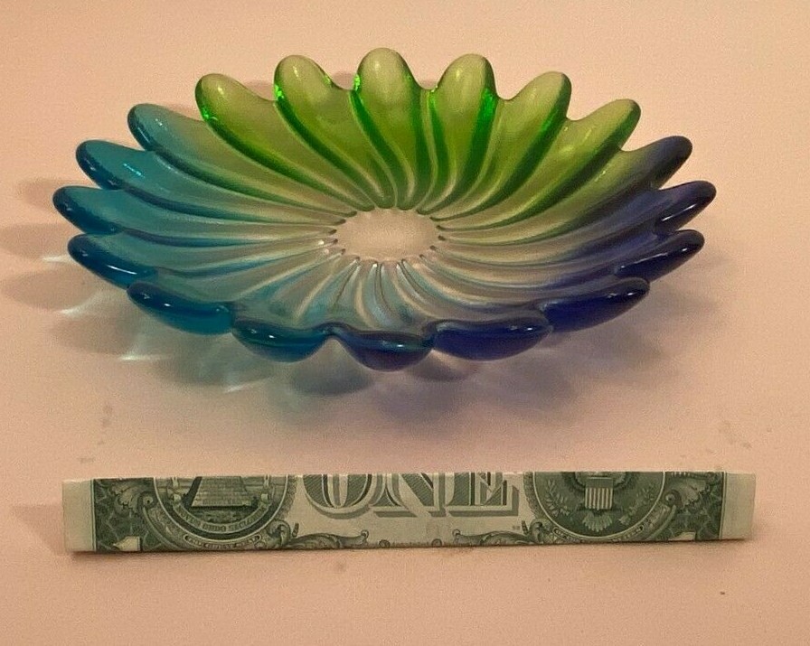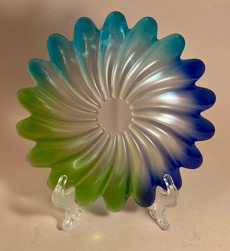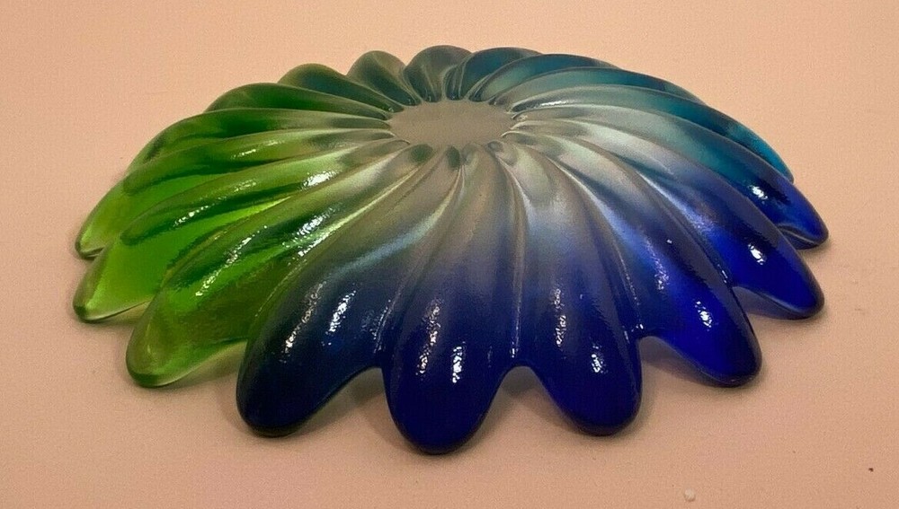 This is a Colorful Decorative Dish which transitions from Blue to Green O mbre in a petal design by Studio Nova of Germany. The pattern is called Solaris. Solaris is a very neat colorful swirl pattern and was produced around the 1980’s. the top side has a gloss finish the underside has a very discernible frosted / buff finish The late 20th century was Studio Nova's prime. The Dish Measures: 8 ¼” diameter 1 ½” high Condition: Very good vintage pre-owned condition No cracks, nicks, chips, or repairs No Scratches Please review all pictures as they are: a part of my description. provided so that you can make your own decision as to the condition and quality of the items that are being sold. The Dish will make a great serving dish or the base for a pillar candle. See the last picture as an example using a battery operated candle (Not included.) . If you have any questions, please contact us via eBay email Thank you for looking! Please browse my eBay Store for Hundreds of Additional Items by touching on [Sellers Other Items]. Shipping: We will ship your items within 24 hours when payment is received. We do not ship on weekends and holidays. We will combine shipping and promptly refund shipping charges whenever possible when you buy more than one item. We take great care when packing your order for shipment to ensure that it gets to you safely. Your order is very Important to us: Your Satisfaction is Our Priority ! If your order is damaged in shipment, please contact us via the eBay email system immediately. Also, to let us know that your order has arrived in good condition and you are happy, please leave Positive Feedback on eBay. Please Note: All International Orders which require customs and / or duties handling will be promptly processed through eBay’s Global Shipping Program.